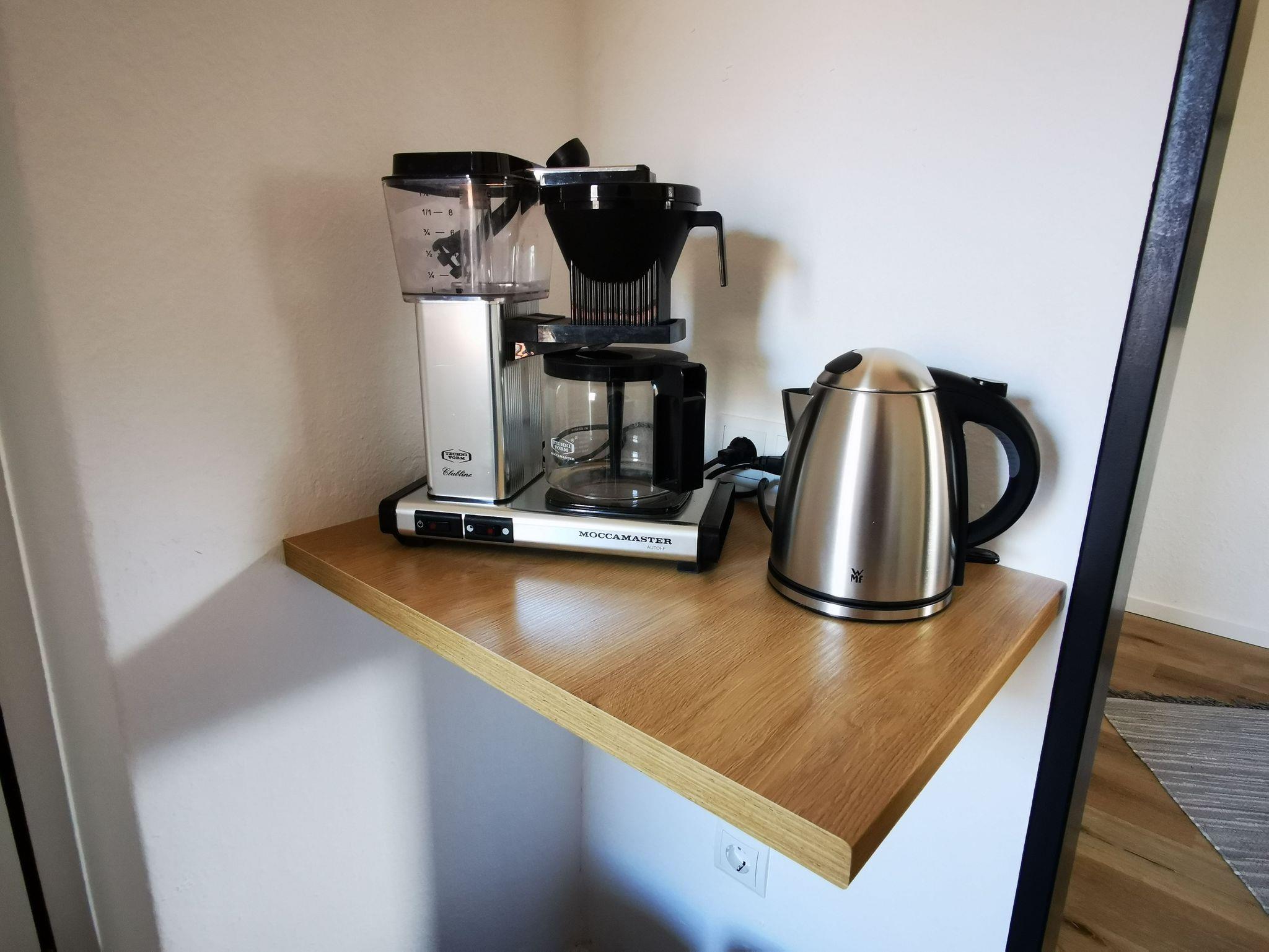 Über einen eigenen Eingang erreichen sie die Wohnung über eine Treppe, auf der sich Menschen über 1,80 m kurz etwas ducken sollten, um Beulen zu vermeiden.
