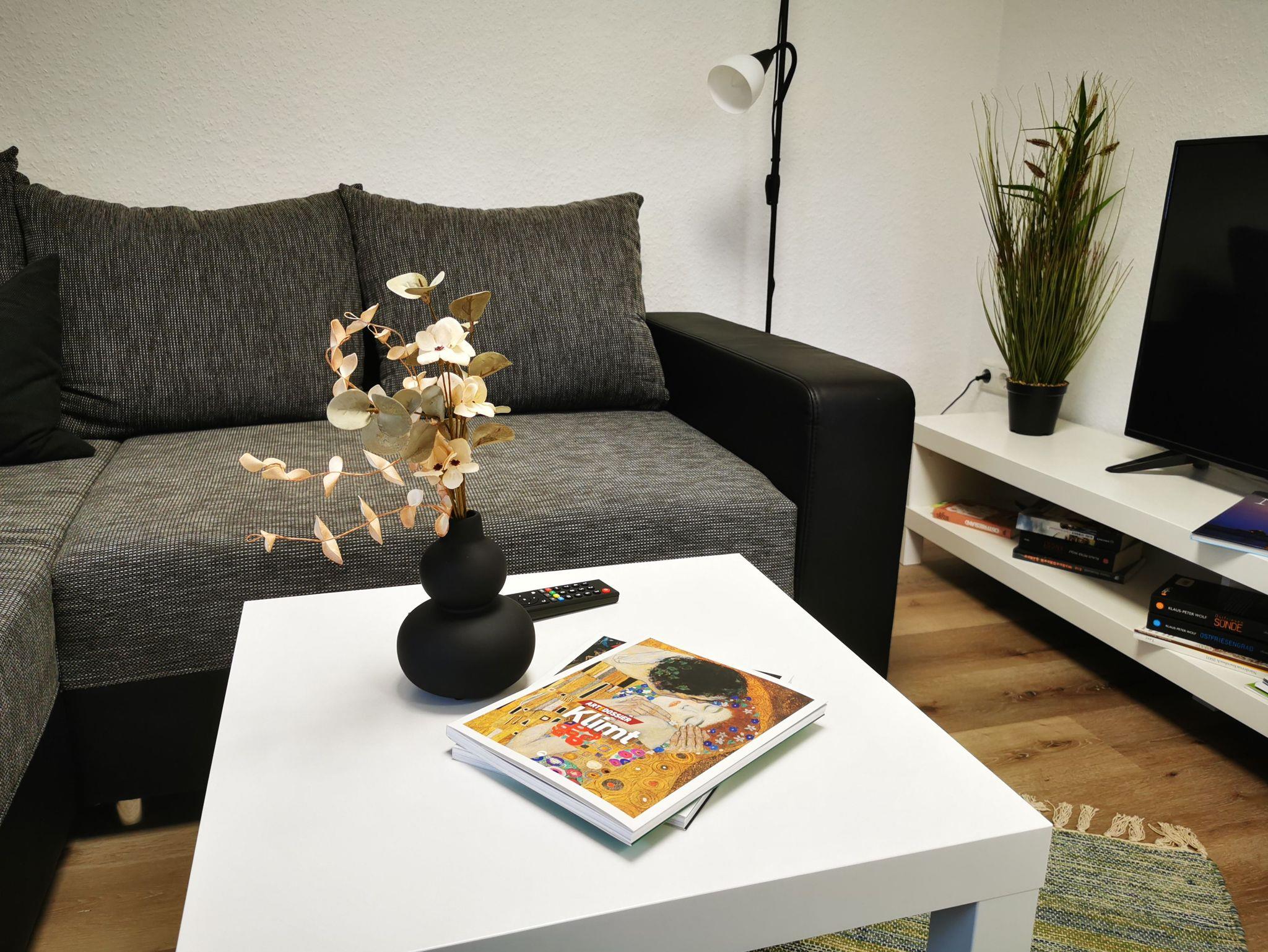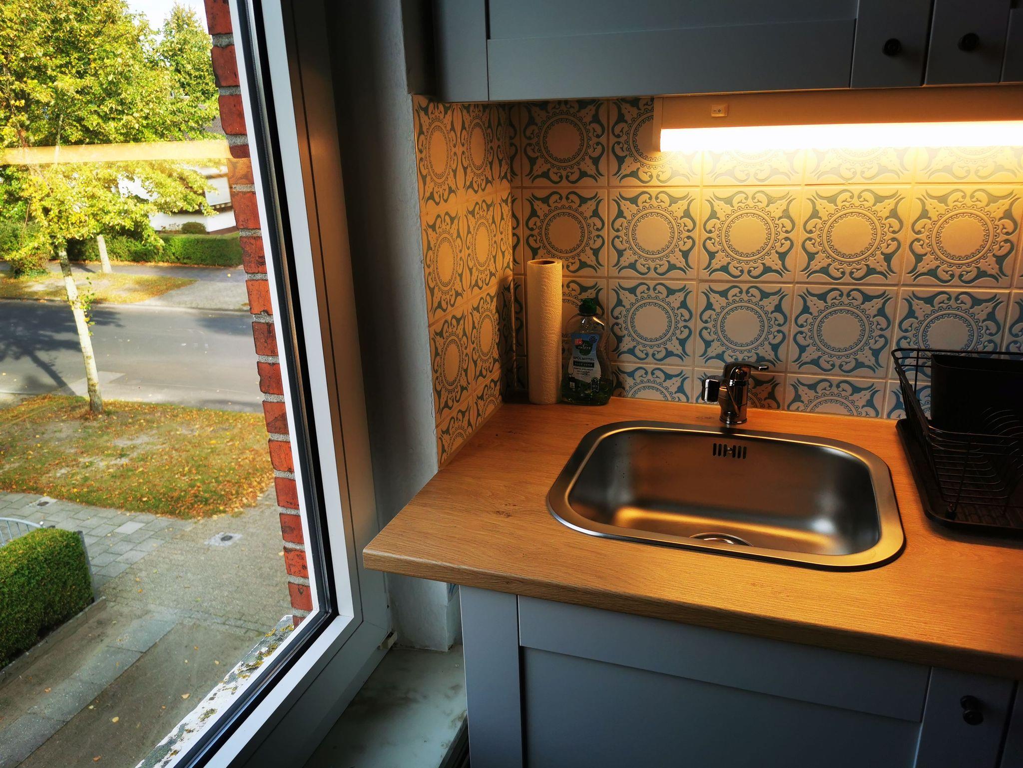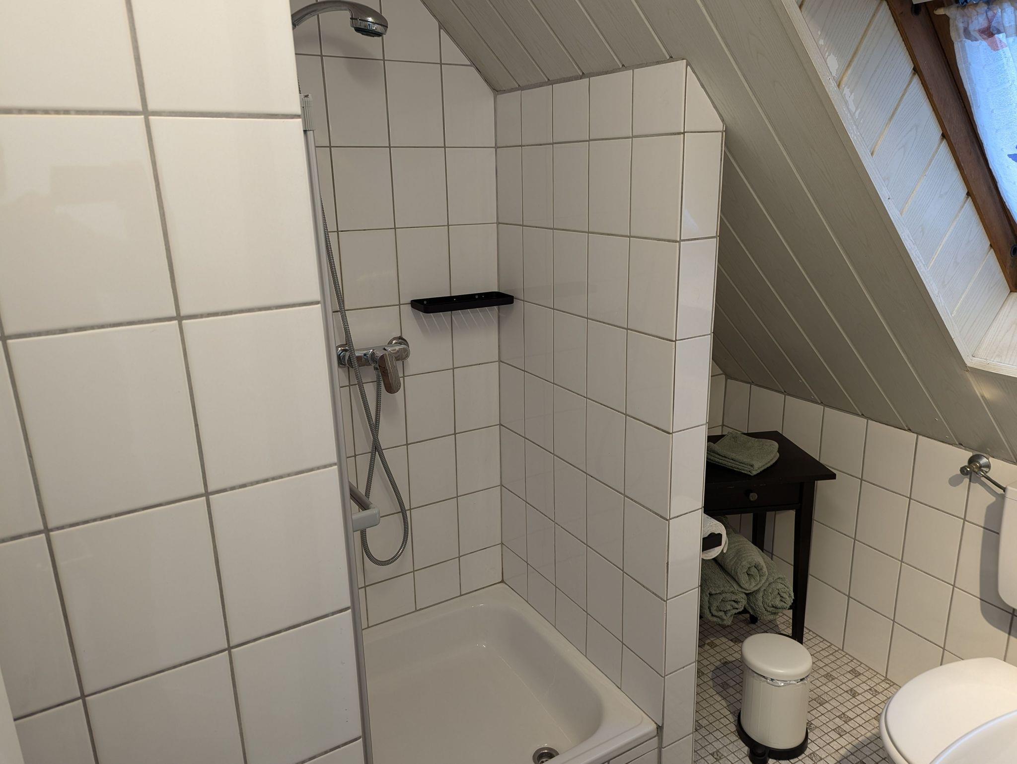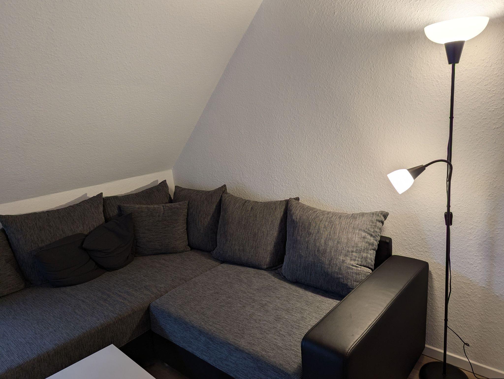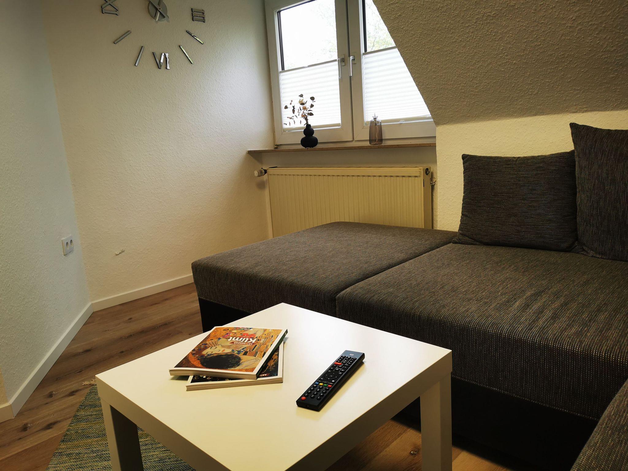 Über einen kleinen Flur gelangt man ins Wohnzimmer mit TV und großzügiger Couch, ins Badezimmer mit Dusche und Dachfenster und in die schnuckelige Küche.