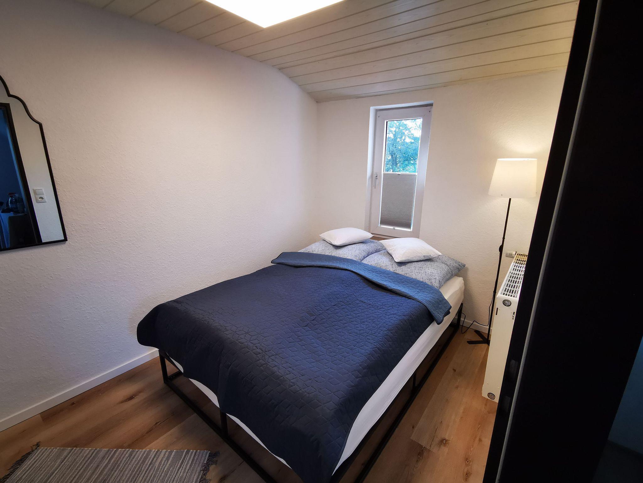 Von dort aus gelangt man ins Schlafzimmer, von dem aus man einen schönen Blick über Dächer und Natur hat.