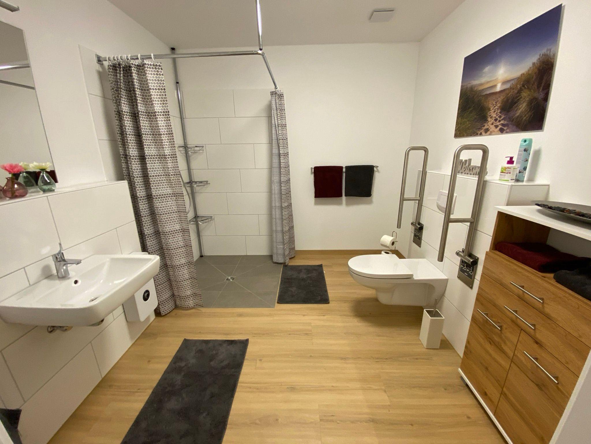 Bei der barrierefreien und rollstuhlgeeigneten Wohnung handelt sich um einen energieeffizienten Neubau mit Solarthermie, Phototvoltaik und Gründach. Eine Praxis für Physiotherapie befindet sich im Hause.