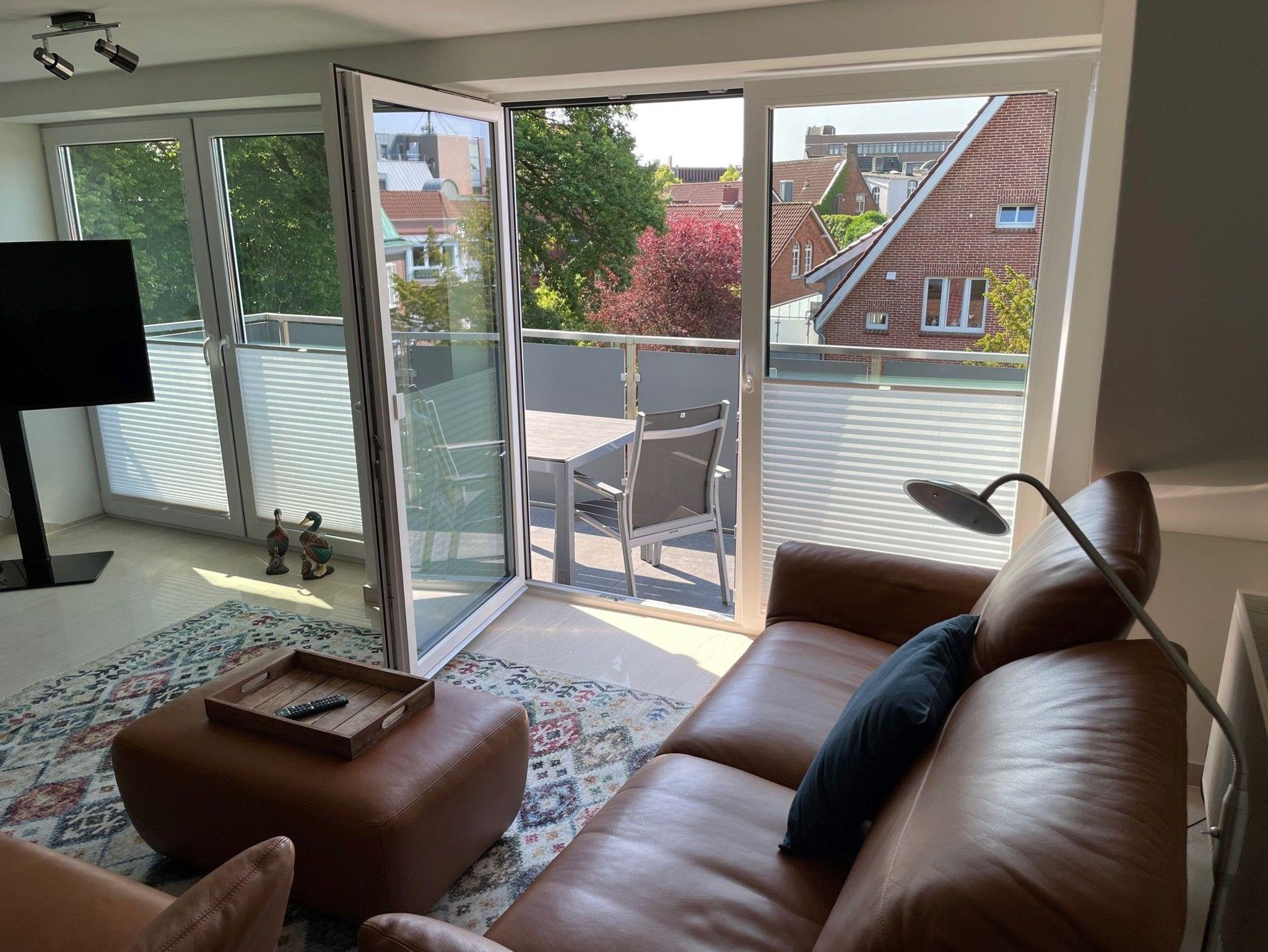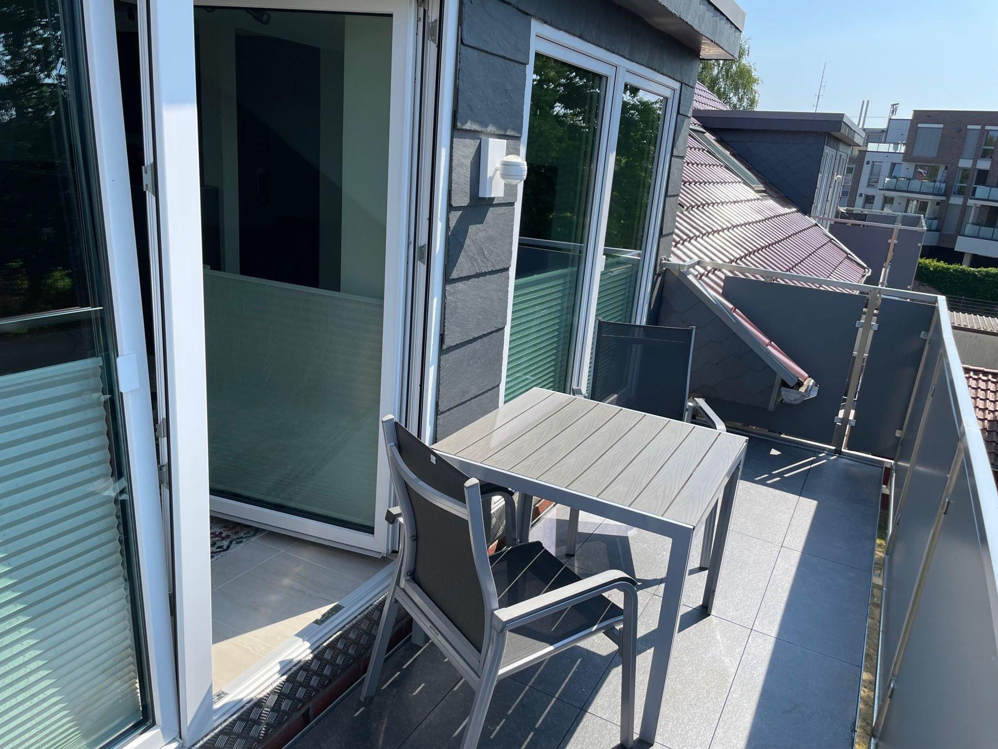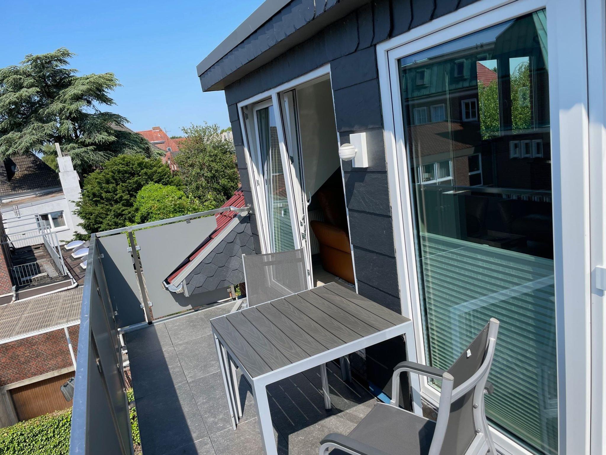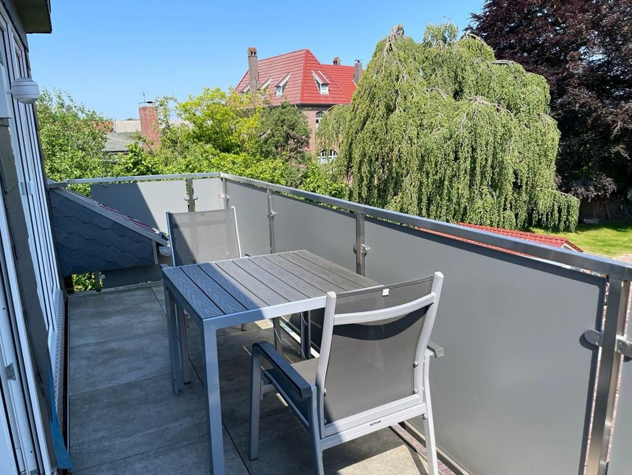 Moderne Ferienwohnung in Leer mit 2 Balkonen, großem Garten und zentraler Lage nahe Bahnhof und Fußgängerzone.
