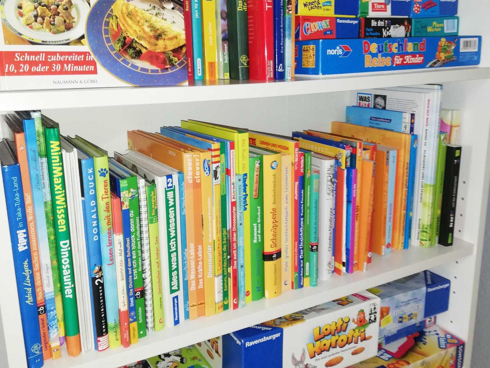 Kleine Bibliothek mit Kinderbüchern, Spielen und Erwachsenen- Lektüre.
