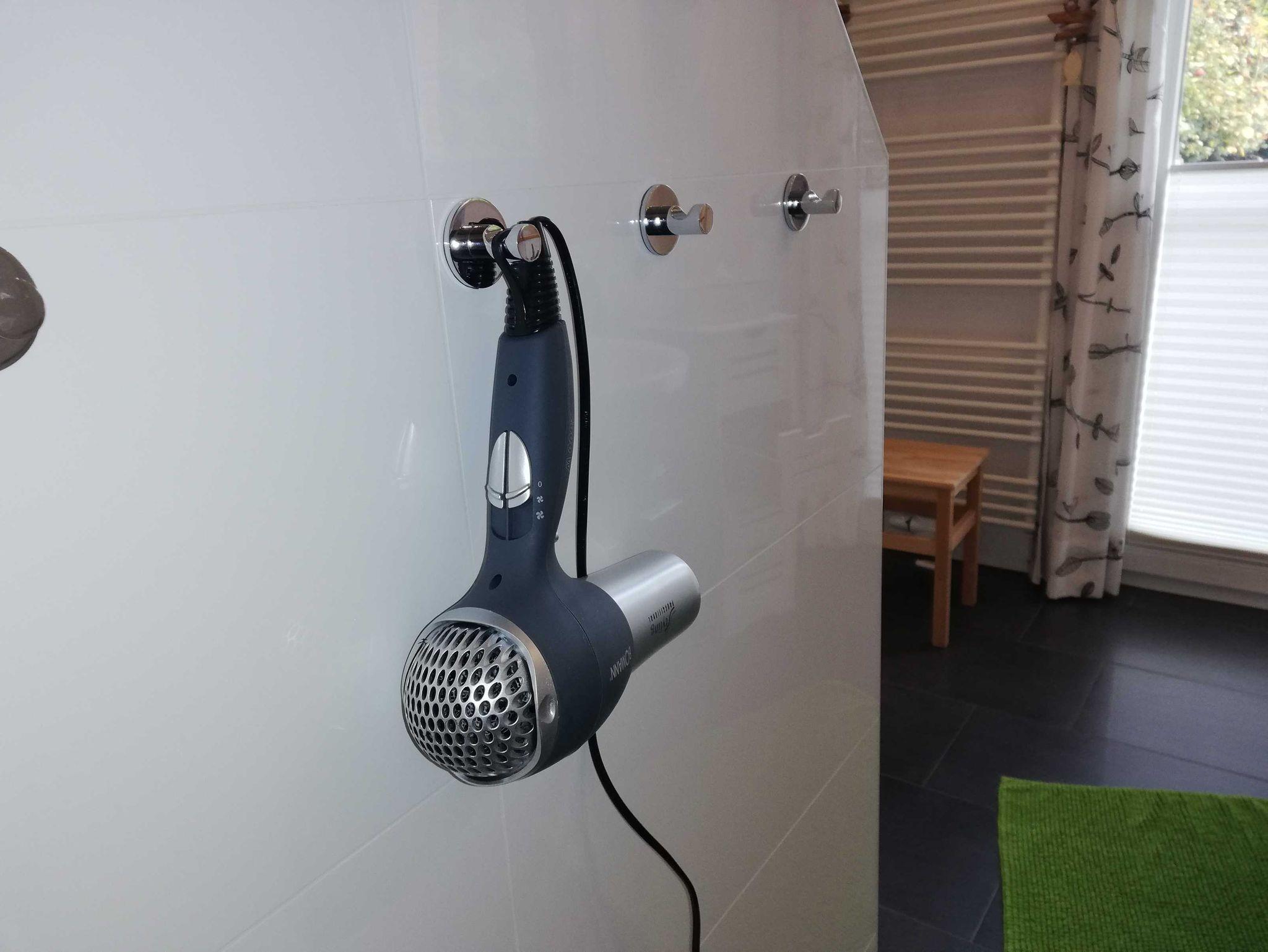 Modernes Vollbad mit seniorenfreundlicher, ebenerdiger Dusche, Wanne, Urinal, Kosmetikspiegel, Fön, viele Ablagemöglichkeiten.