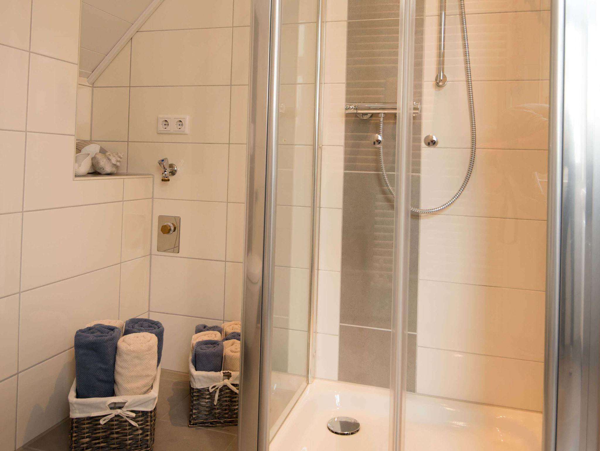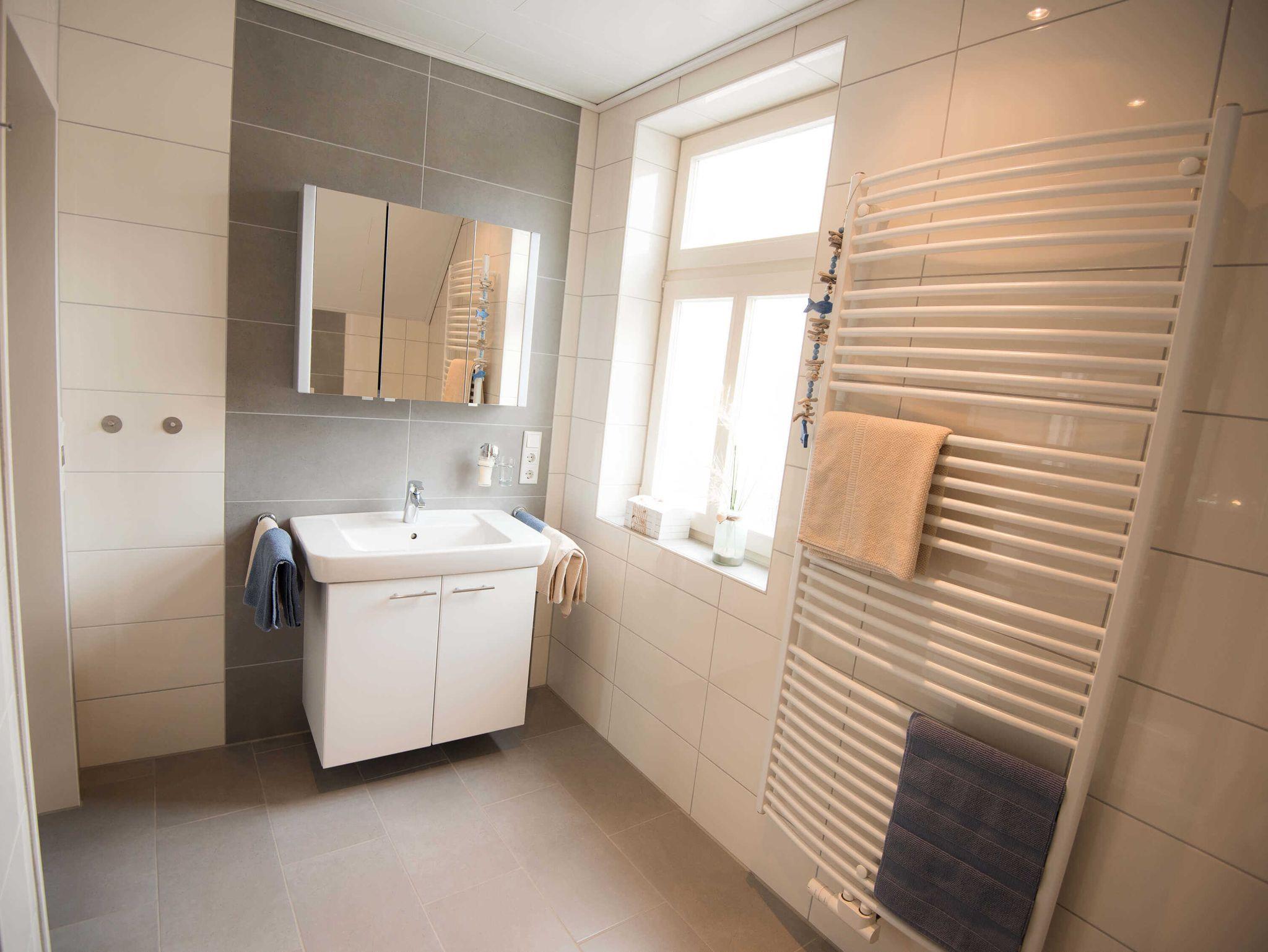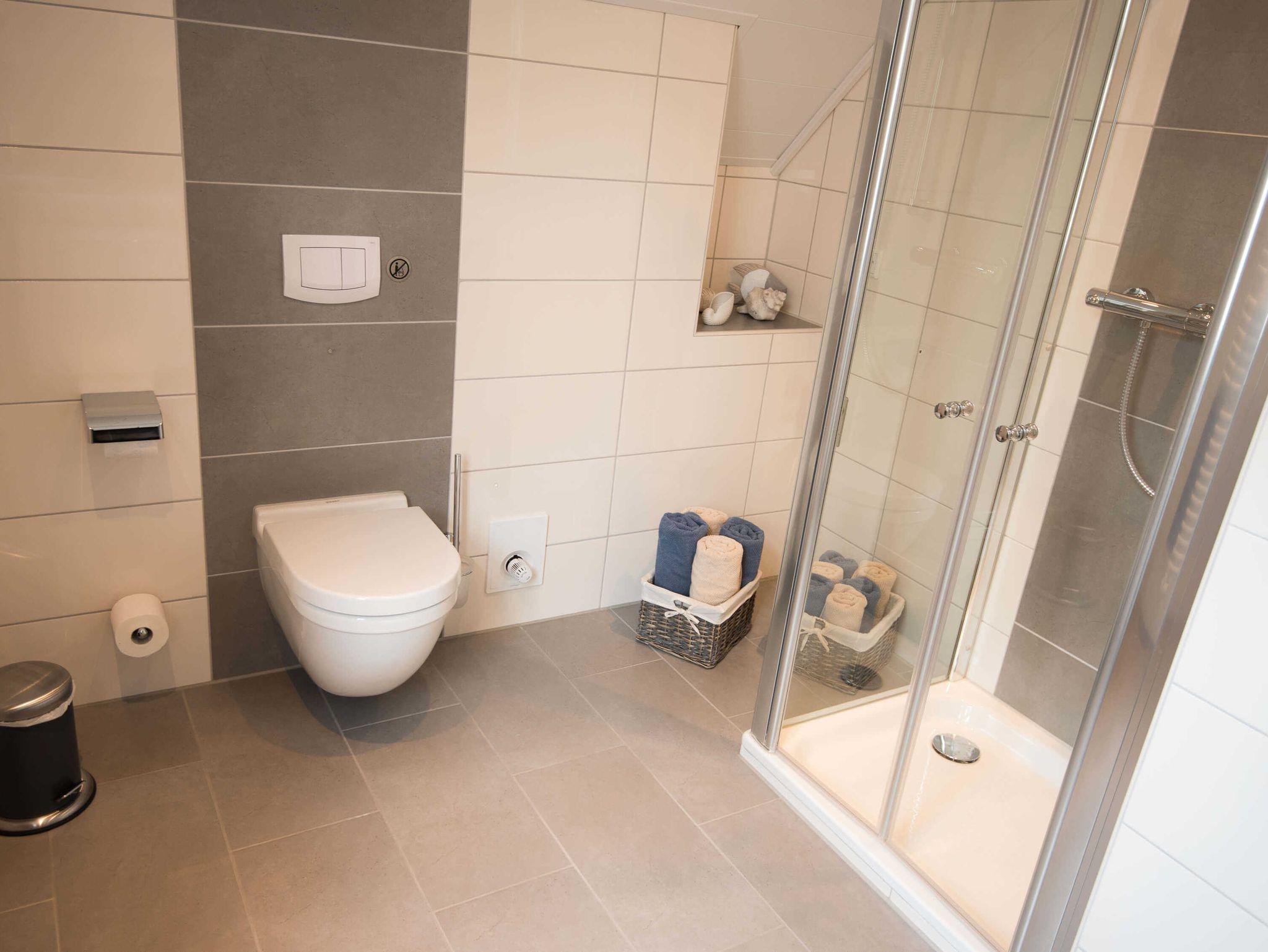 Das moderne Badezimmer verfügt über Dusche/WC, Waschtisch, Handtuchheizkörper und Fußbodenheizung.