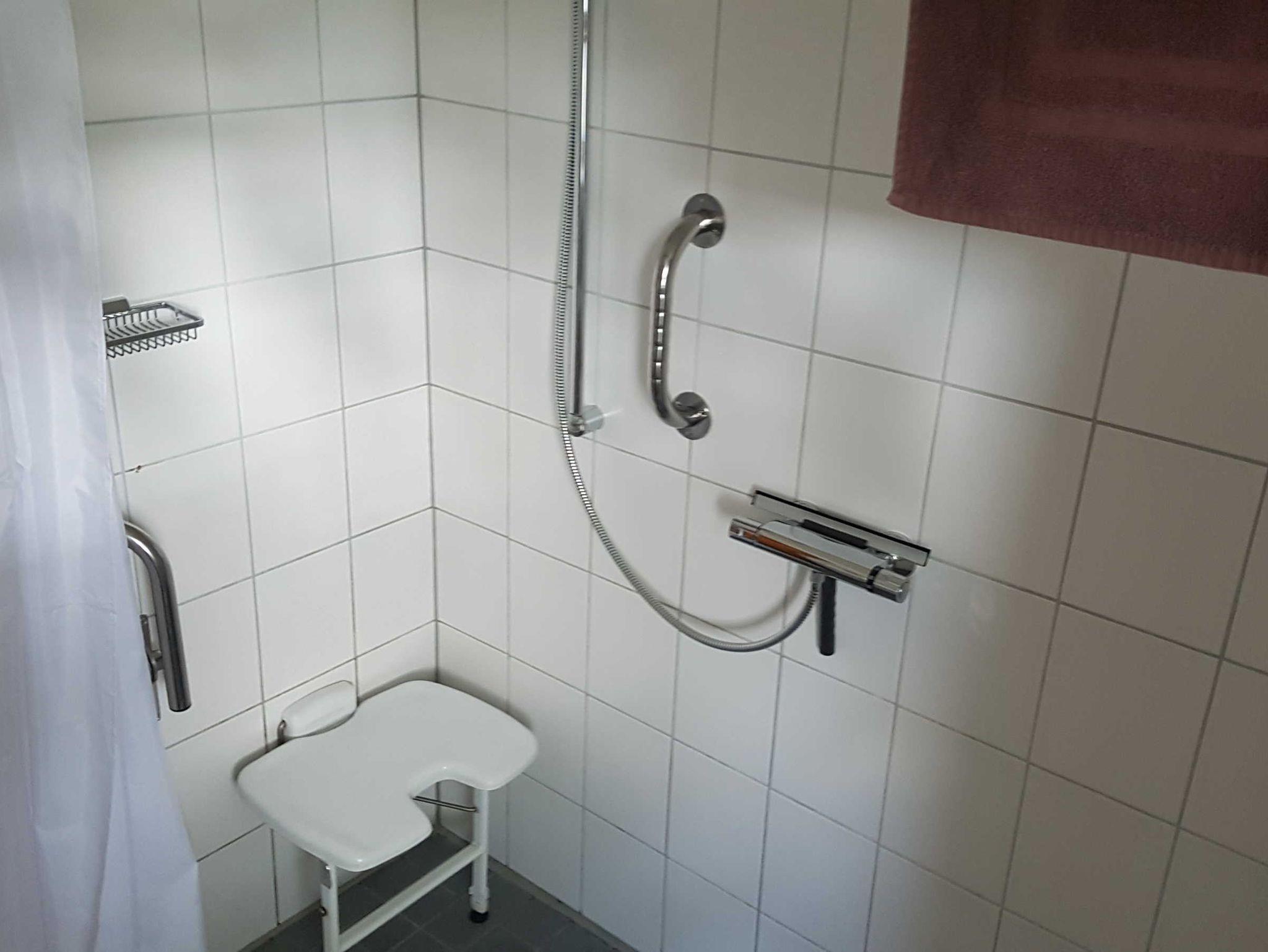 Das Bad verfügt über eine barrierefreie Dusche. Waschmaschine, Trocker & Geschirrspüler stehen zur Nutzung zur Verfügung.