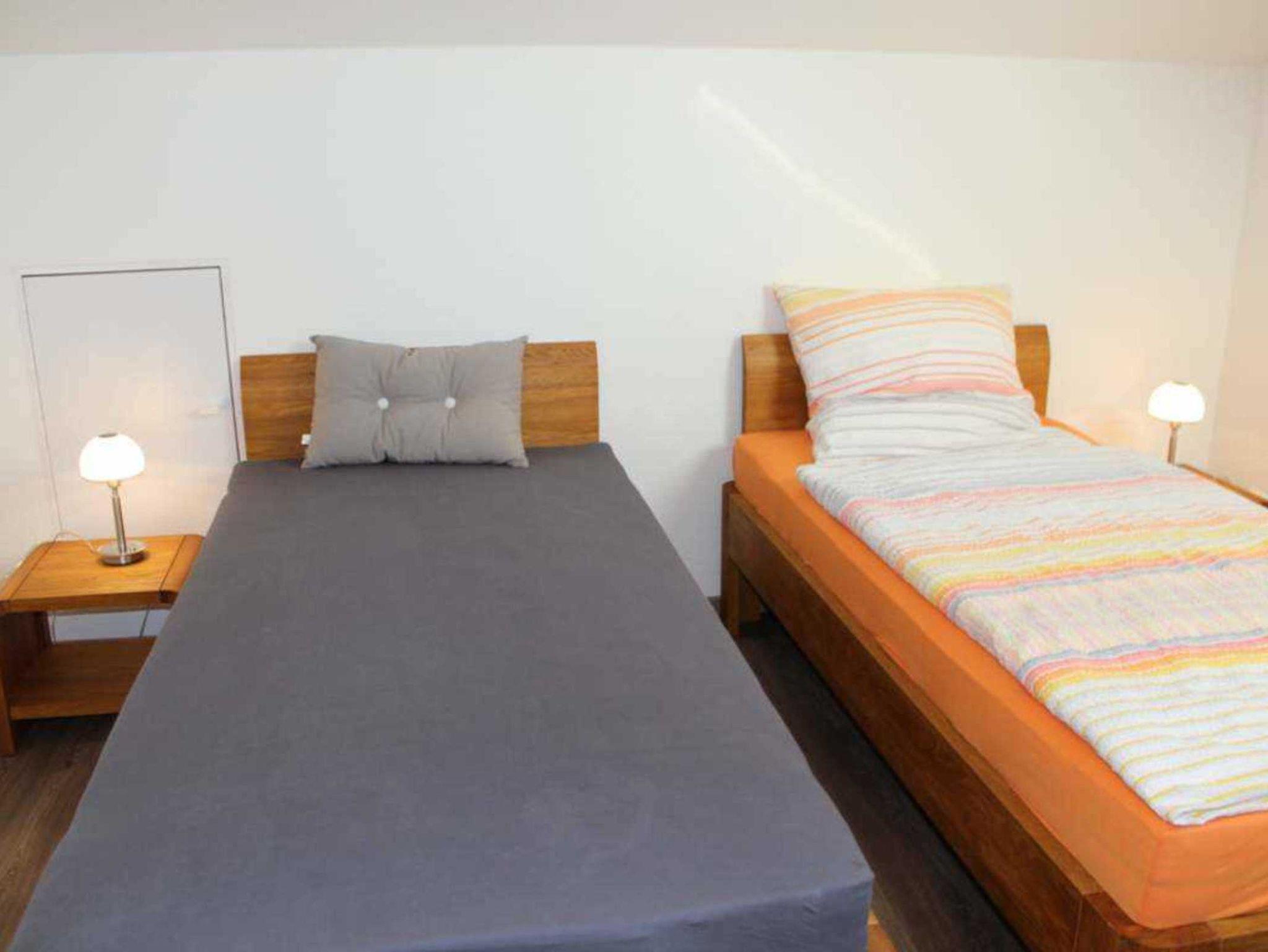 Ein Zweibettzimmer mit zwei Betten der Größe 100cm x 200cm, Badezimmer mit Dusche und WC.
