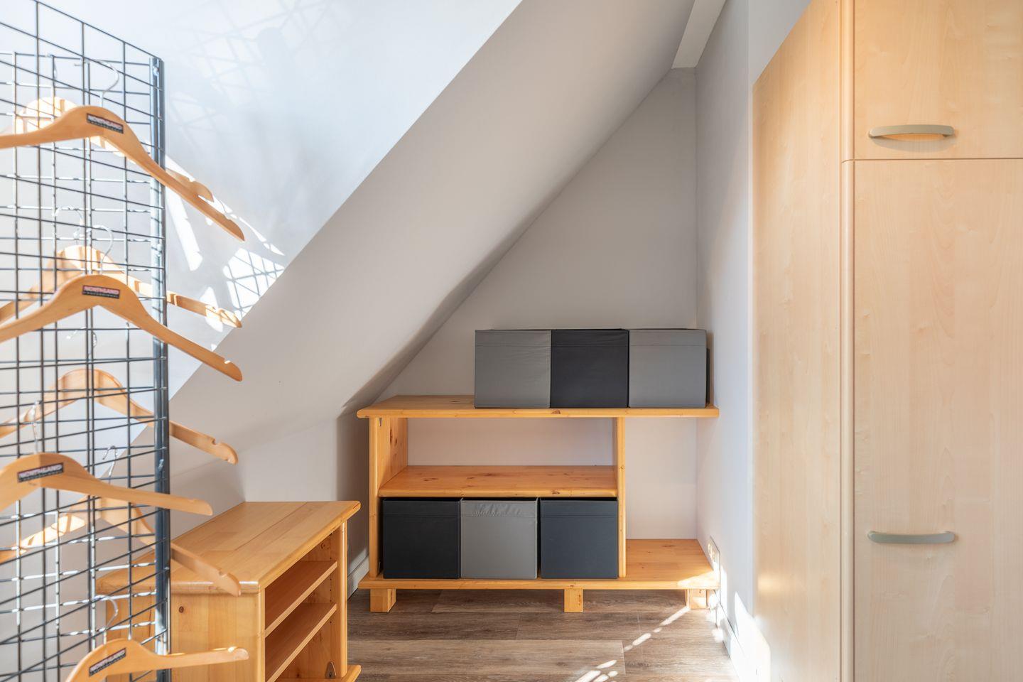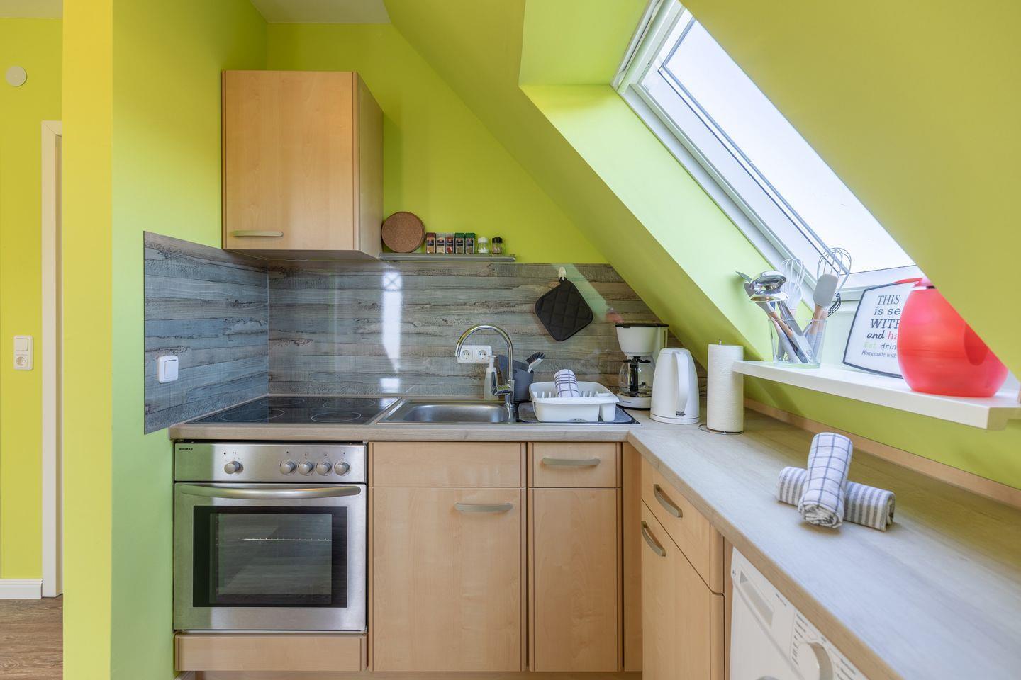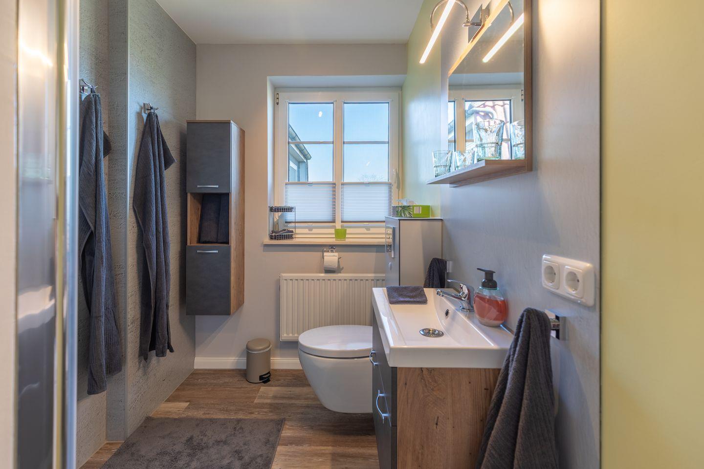 Das Badezimmer ist mit einer bodengleichen Dusche, einem Waschbecken und einer Toilette ausgestattet. Zudem findet man Annehmlichkeiten wie einen Haartrockner und großzügige Stauraumoptionen. Für die praktische Nutzung während Ihres Aufenthalts steht eine Waschmaschine in der Küche zur Verfügung.
