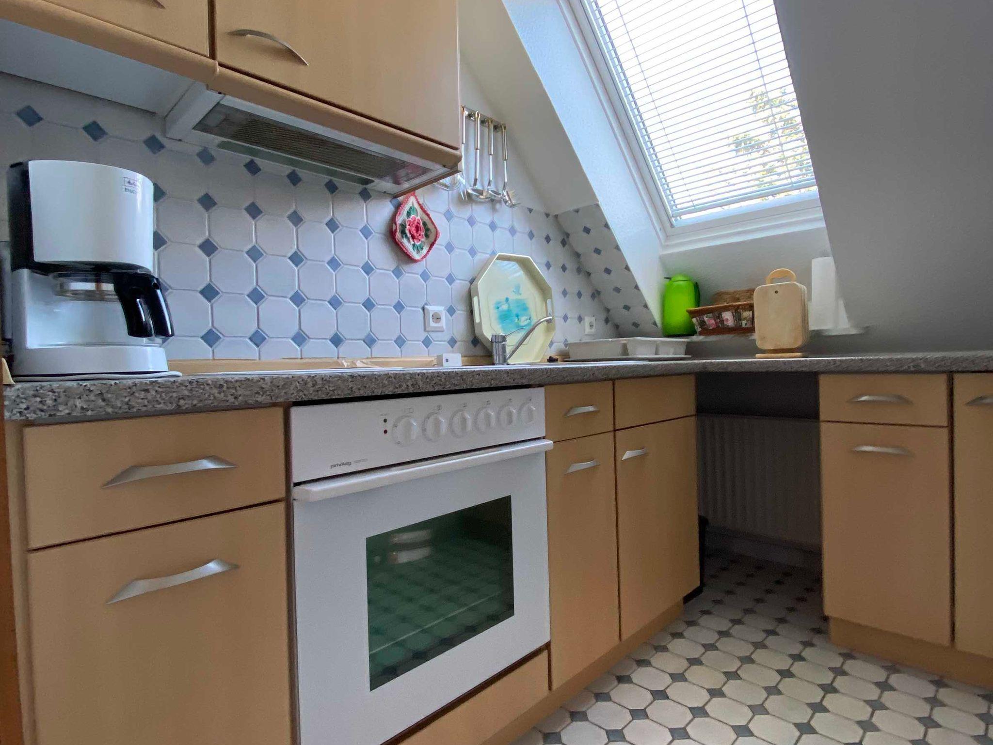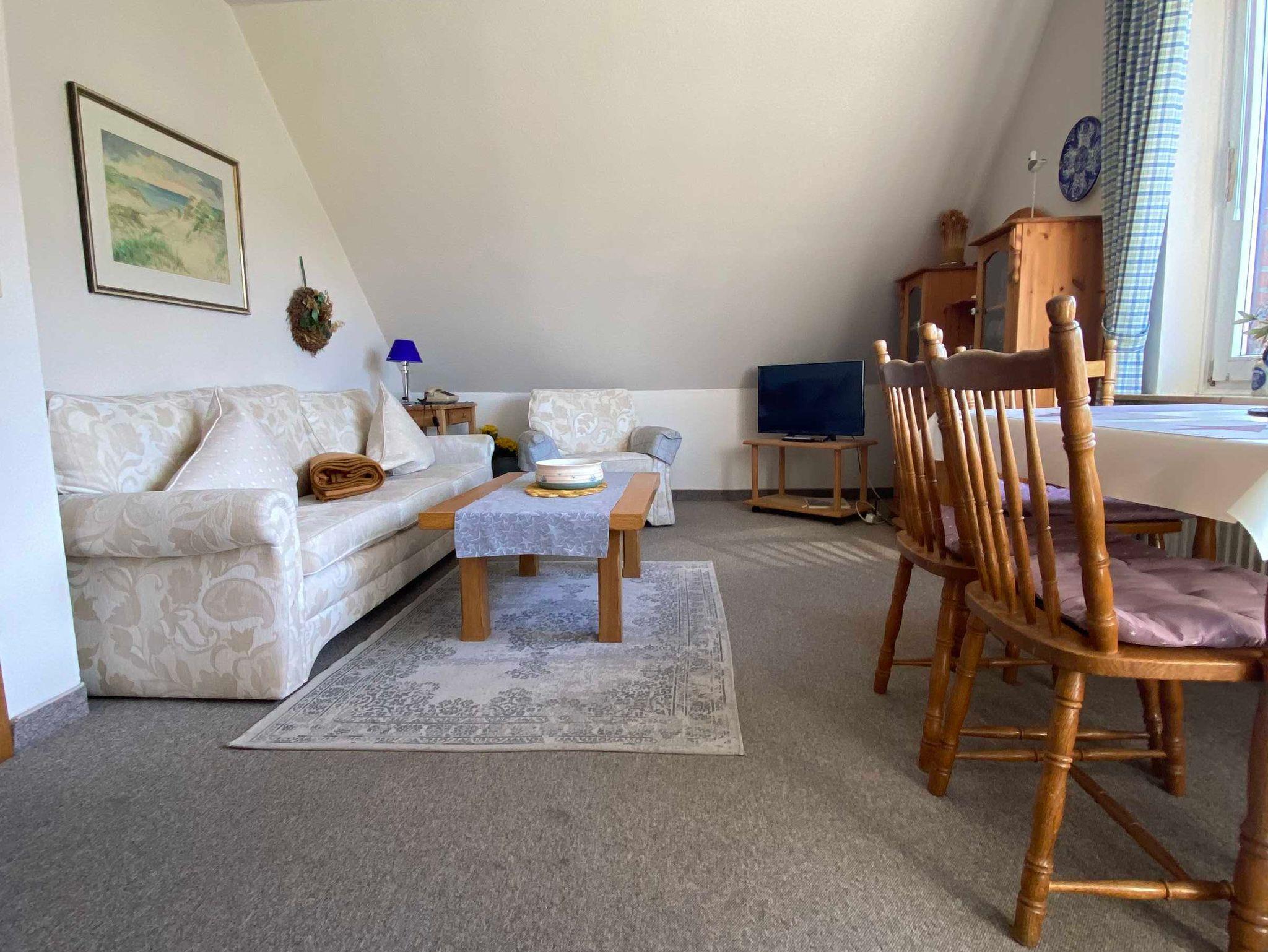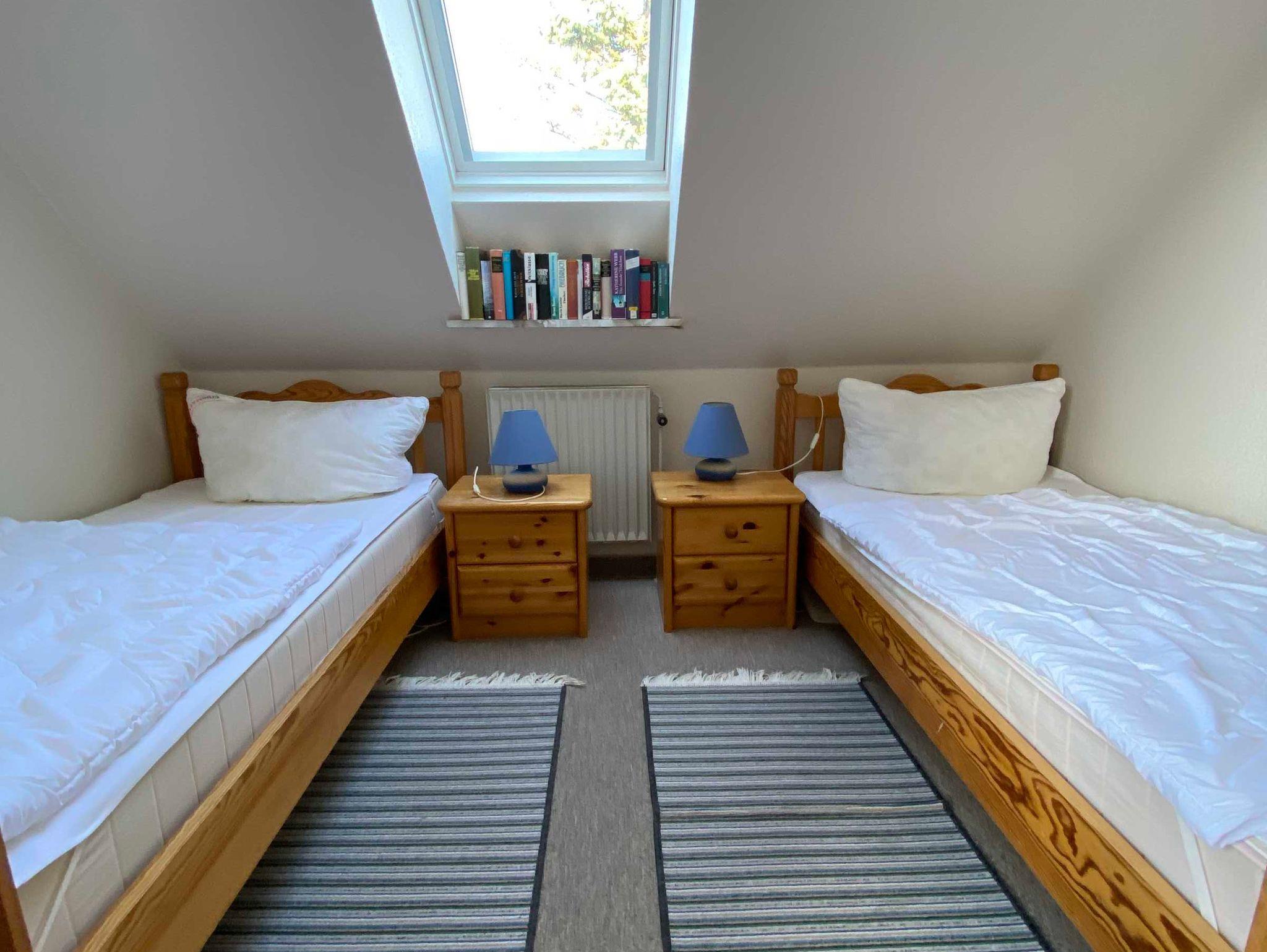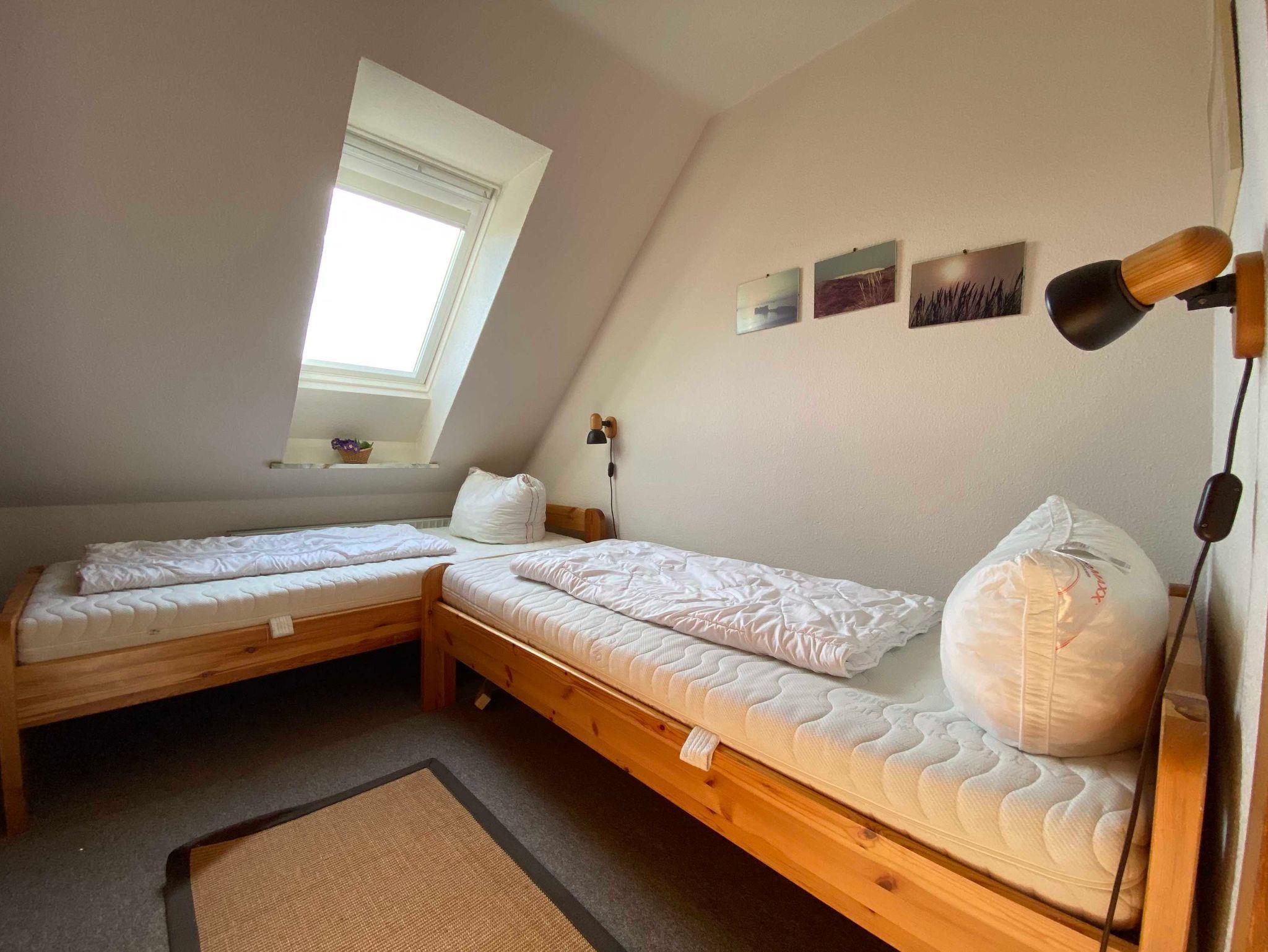Die 50 qm große Ferienwohnung präsentiert sich mit viel skandinavischem Flair, und die Dachschrägen sorgen für ein besonders behagliches Raumgefühl. Das Apartment umfasst ein Wohnzimmer mit integrierter Küche, zwei Schlafräume mit jeweils 2 Einzelbetten sowie ein Dusch/WC-Bad.
