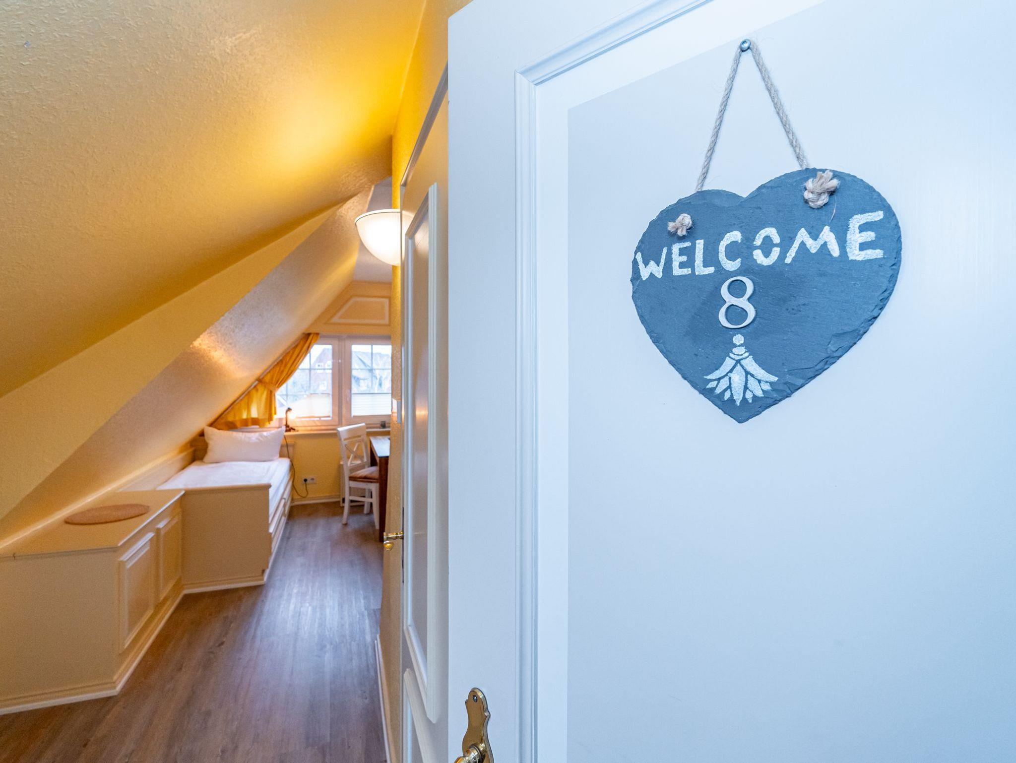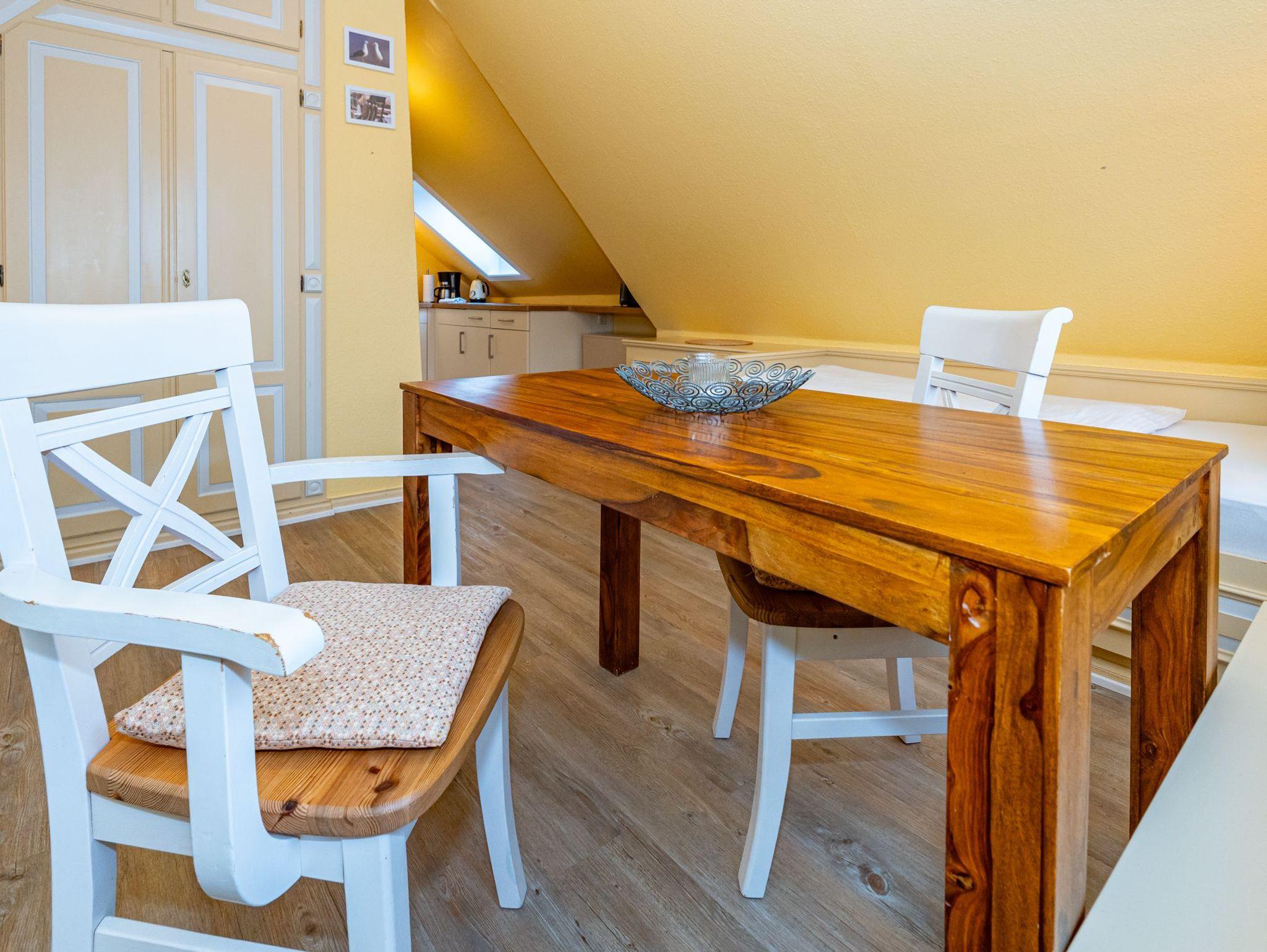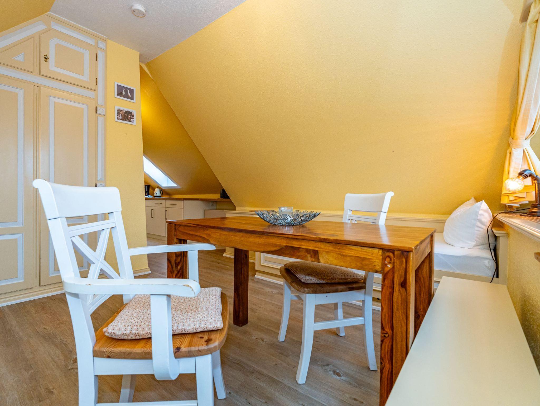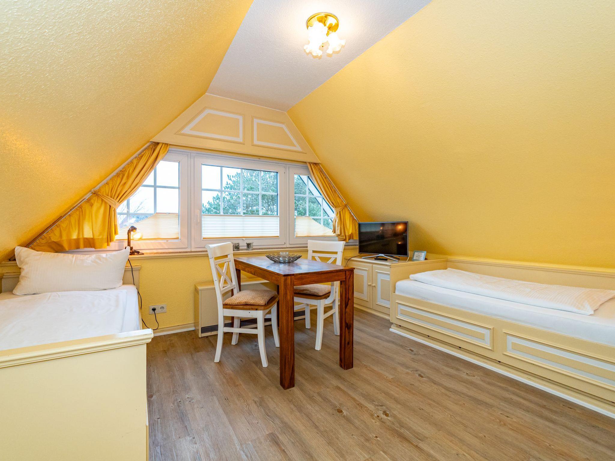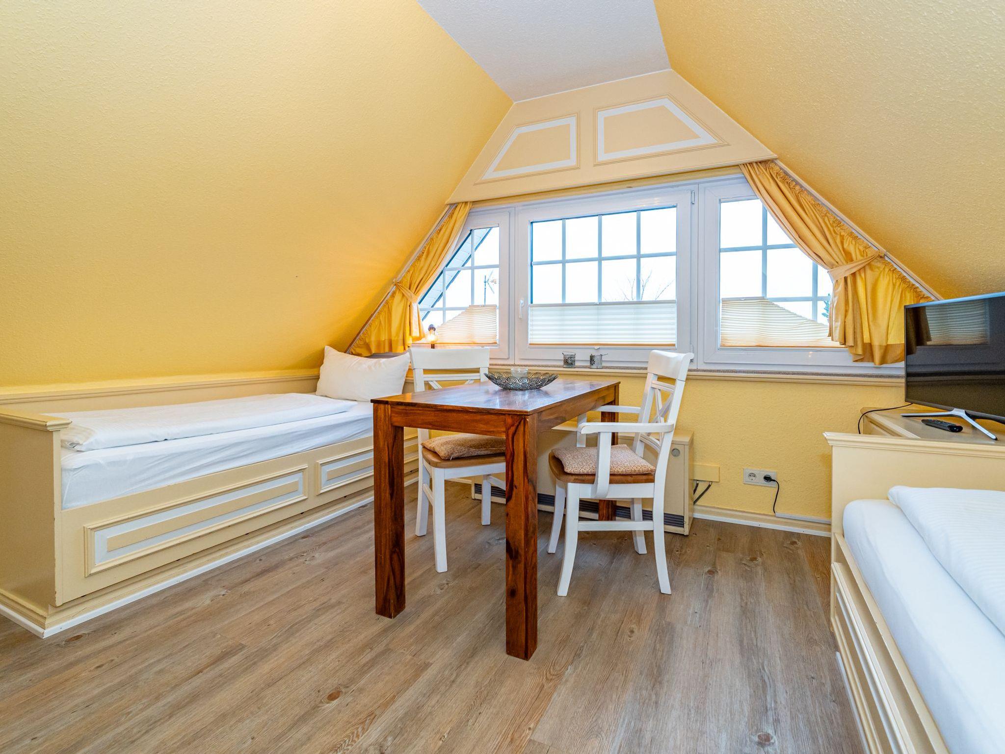 Im Giebel des 2. Obergeschosses liegt das achte Apartment. Die in edlen Cremetönen eingerichteten 30 Quadratmeter bieten Platz für 2 Personen. Der offen gestaltete Wohn- und Essbereich verfügt über 2 Einzelbetten und Sitzmöglichkeiten. Das Bad ist ausgestattet mit Dusche, WC und Waschbecken.