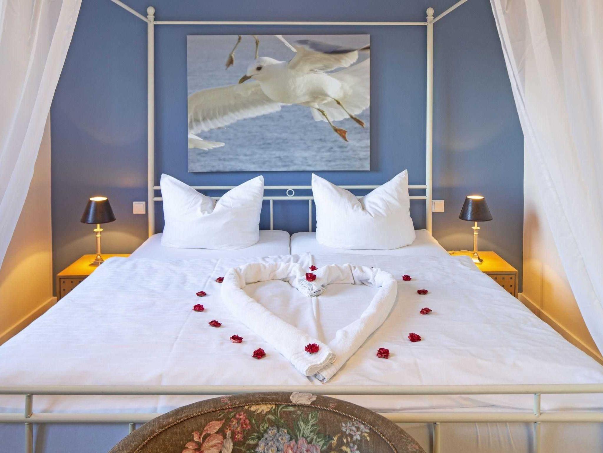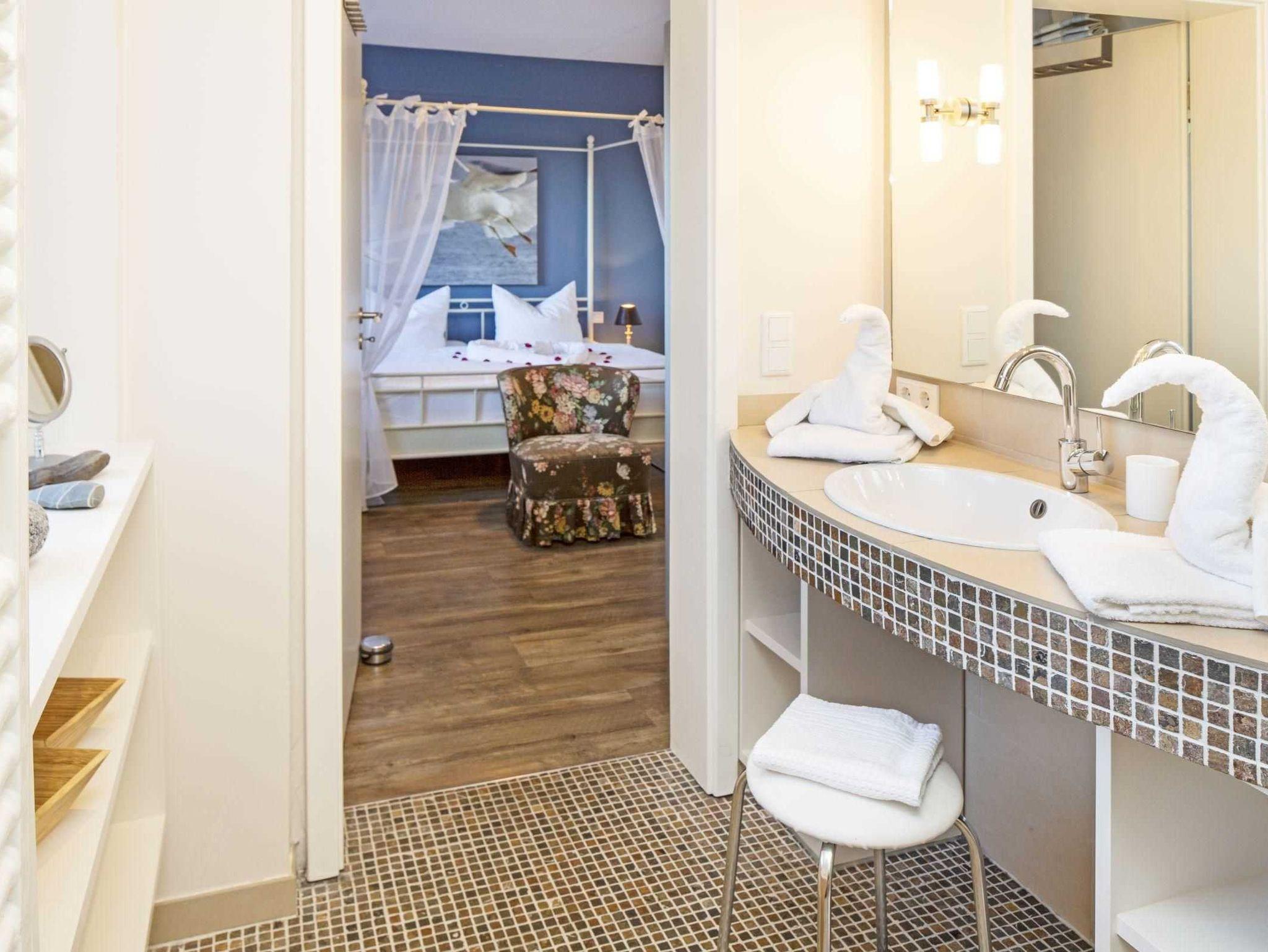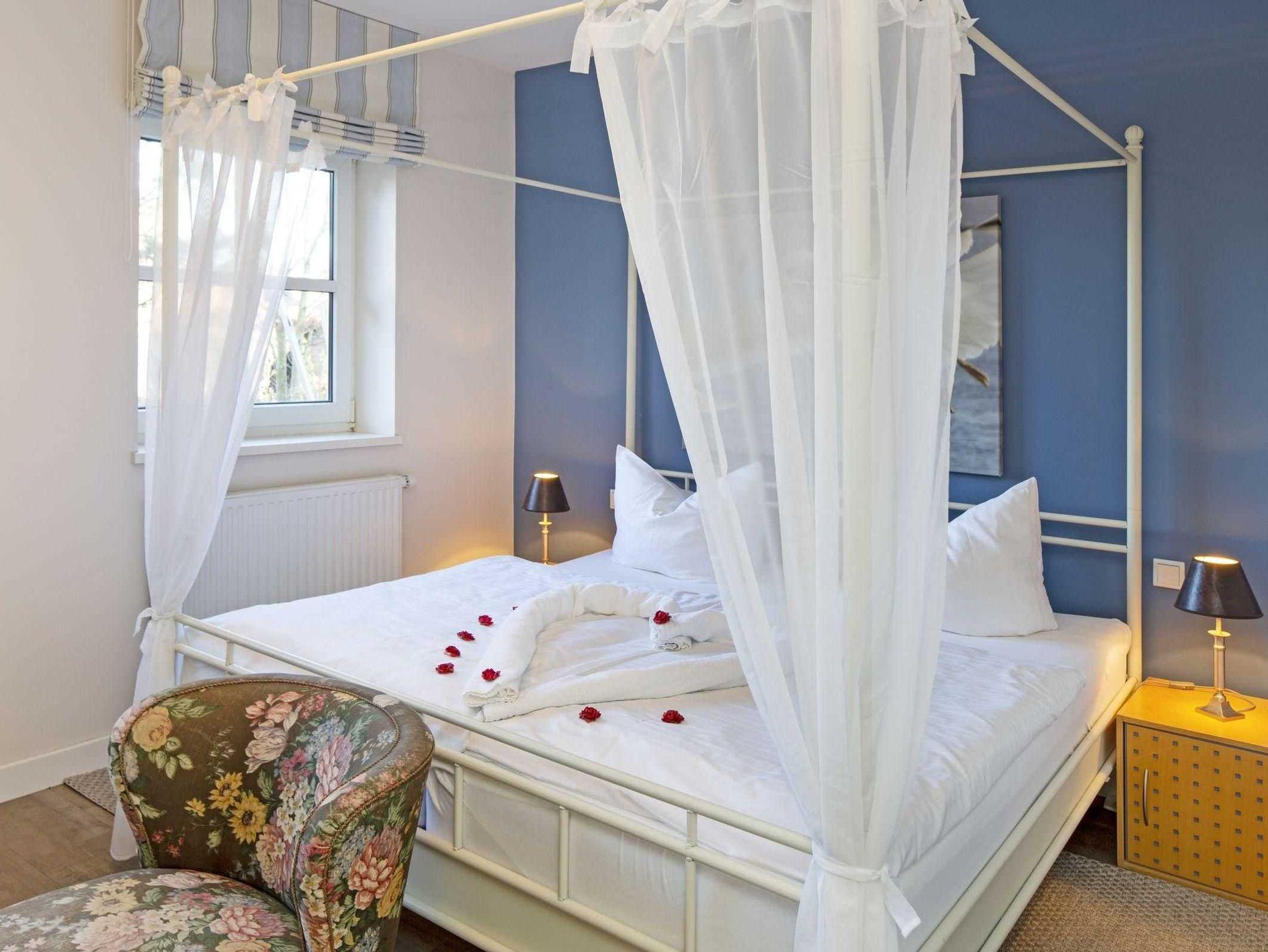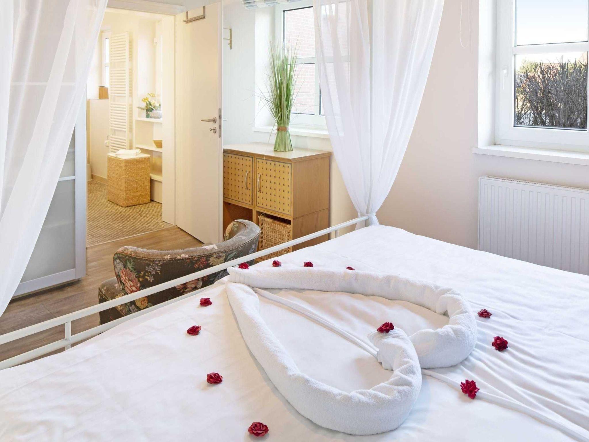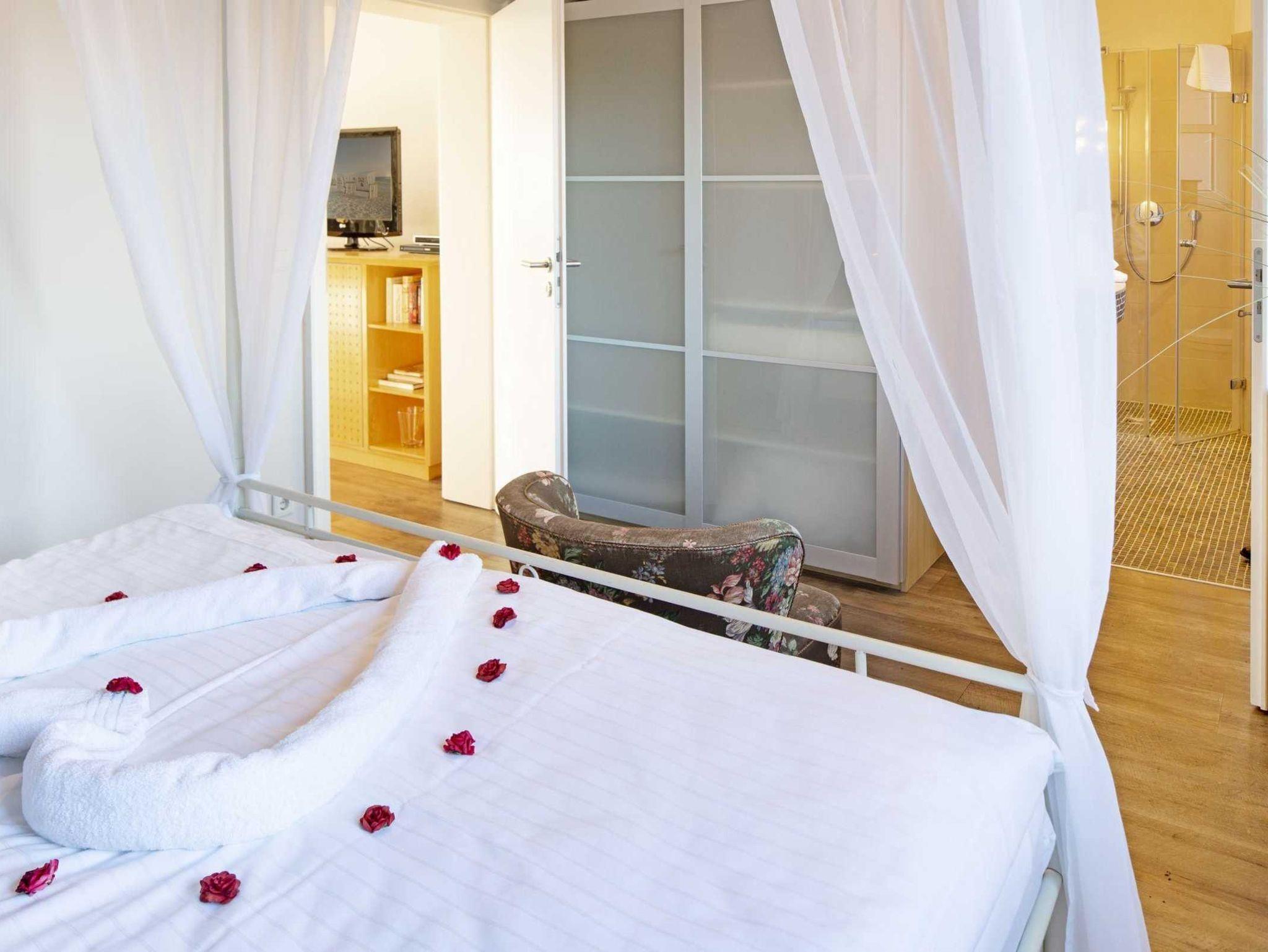 Wer es elegant und zeitlos mag, wird sich in unserem Apartment „Pure Wonne Mandö“ besonders wohlfühlen. Die Ferienwohnung ist mit 50 m2 für 2 Personen ausgelegt und bietet mit ihrem schön geschnittenen Wohn- und Essbereich den perfekten Rahmen für einen komfortablen Urlaub. Neben einer offenen Küche stehen ein separates Schlafzimmer mit Baldachin-Doppelbett sowie ein großzügiges Duschbad zur Verfügung. Je nach Witterung und Saison können zusätzlich die Gartenmöbel und Strandkörbe auf der Terrasse genutzt werden.