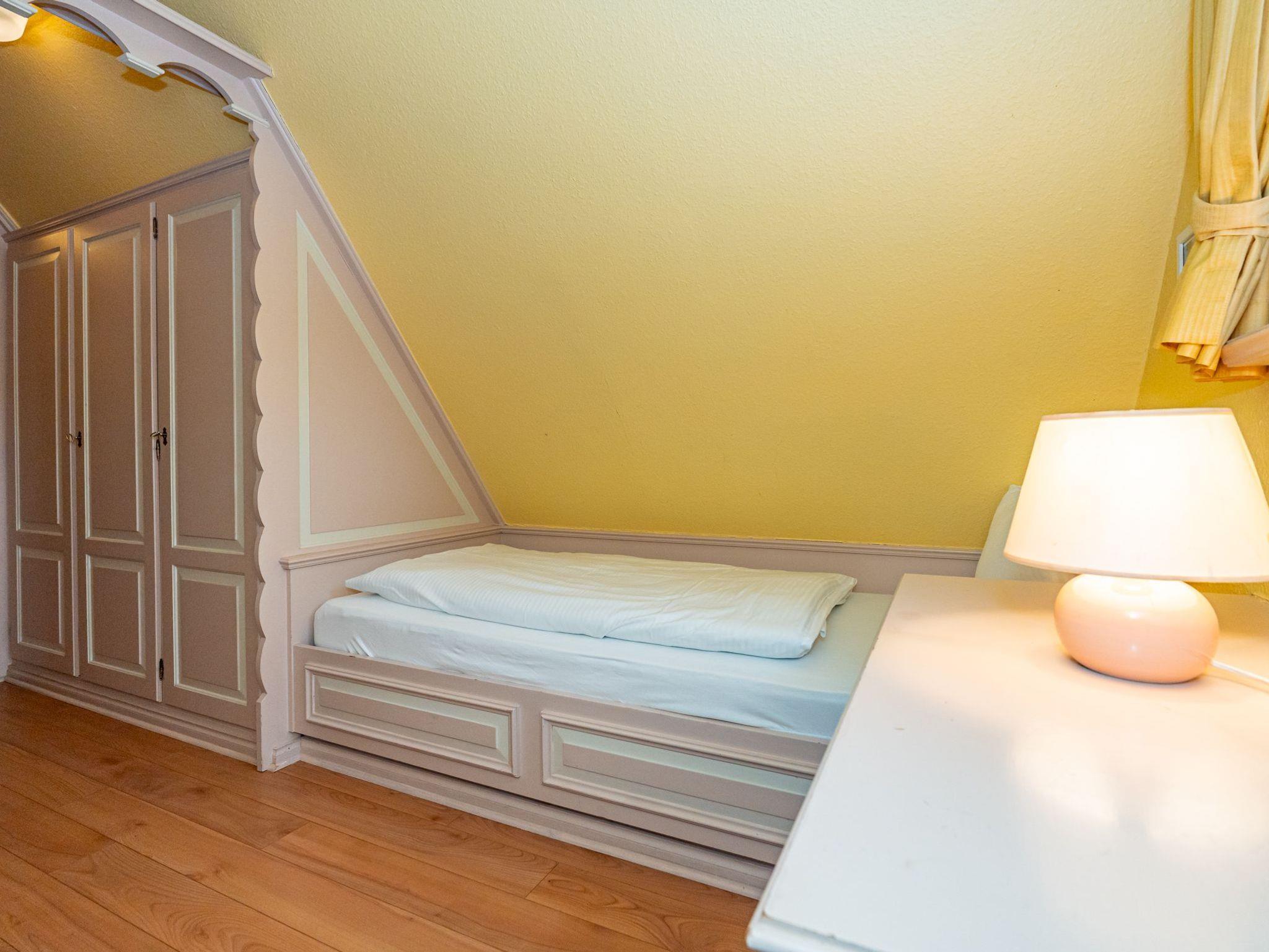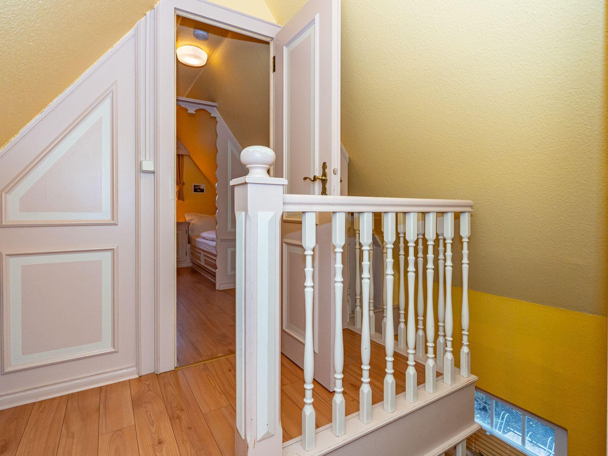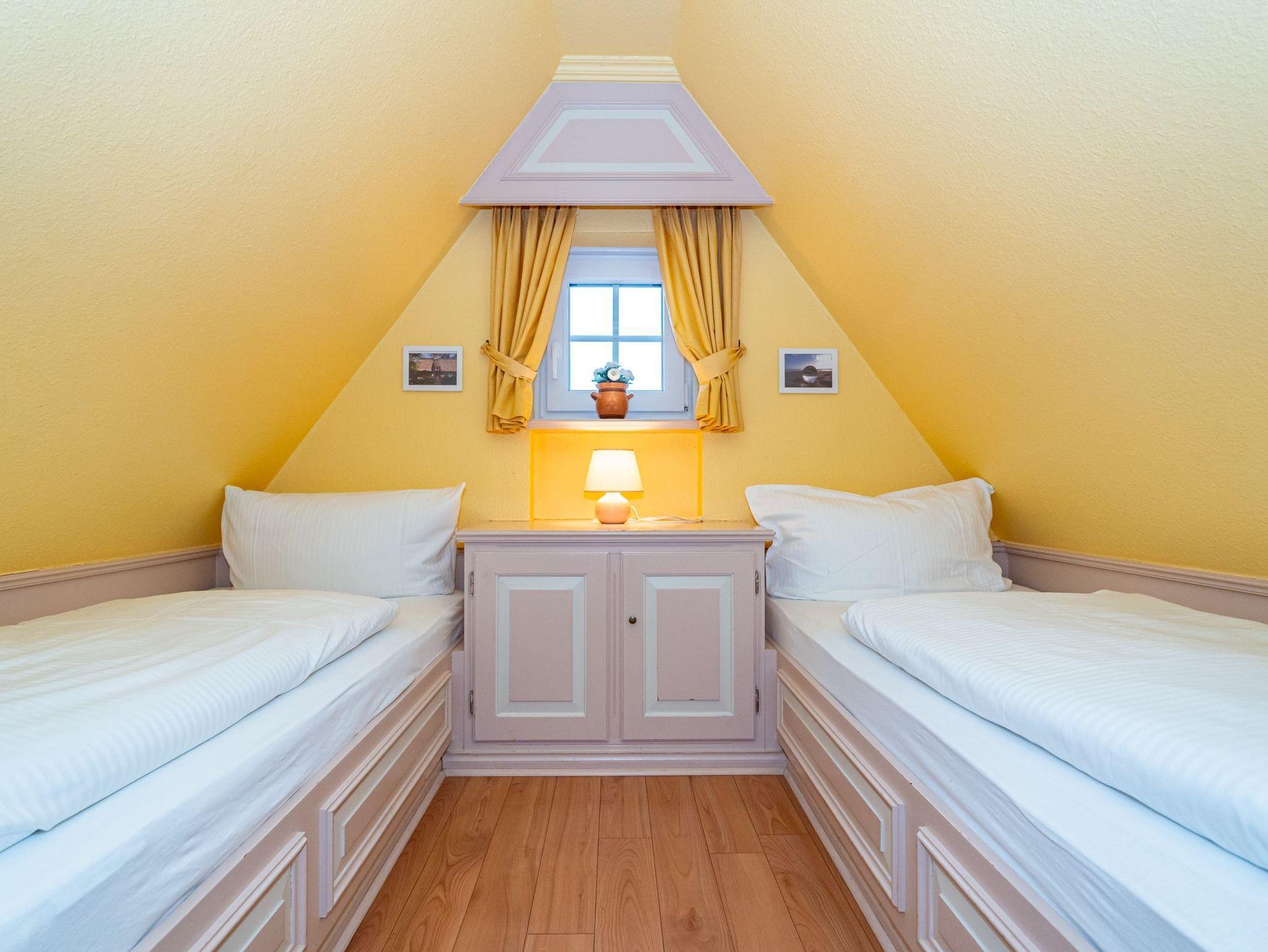 In einem kleinen separaten Haus liegt das neunte Apartment, welches sich über 2 Etagen erstreckt. Es bietet auf 50 Quadratmeter Platz für 4 Personen. Der Wohn- und Essbereich befindet sich im Erdgeschoss und verfügt über ein Schlafsofa. Im Obergeschoss befindet sich eine lauschige Schlafkoje mit 2 Einzelbetten. Das Badezimmer ist ausgestattet mit Dusche, WC und Waschbecken.