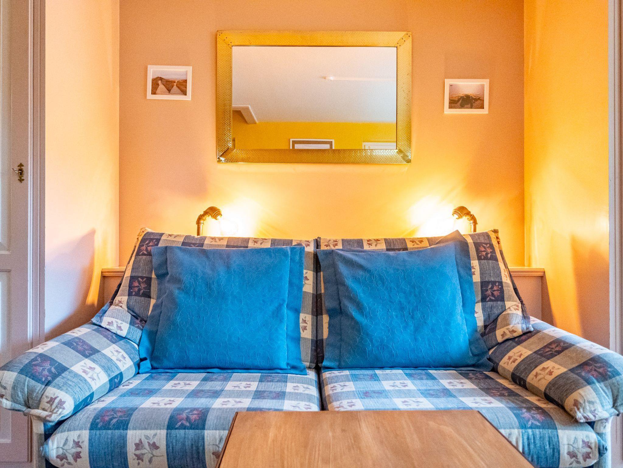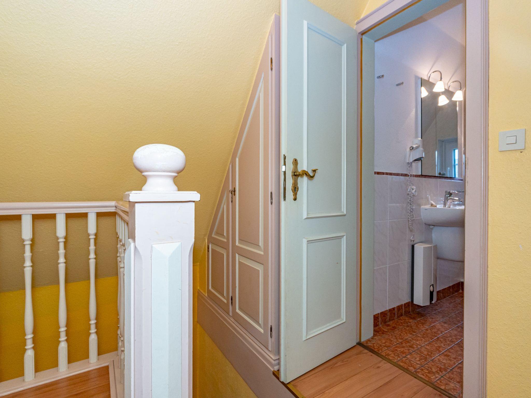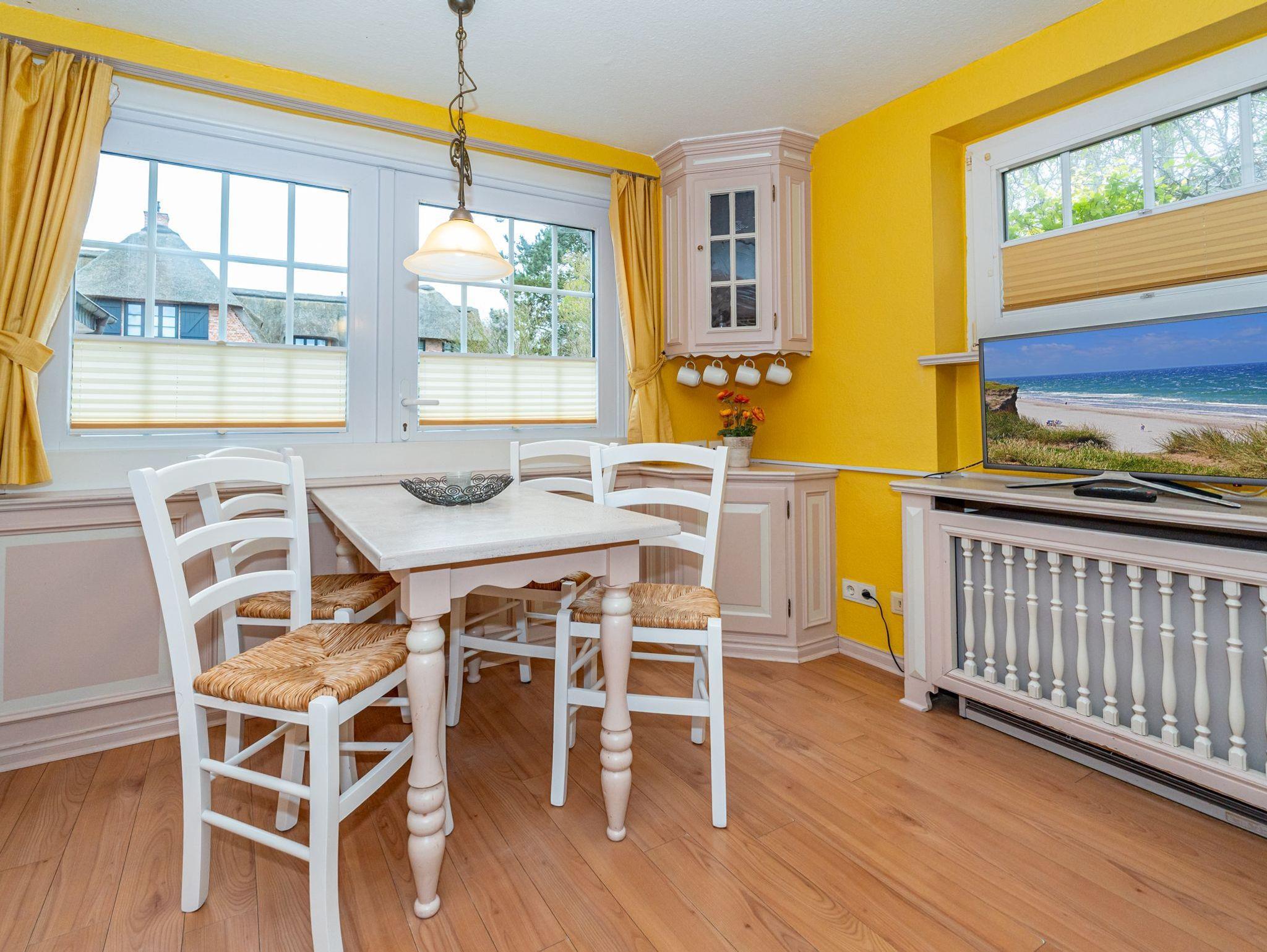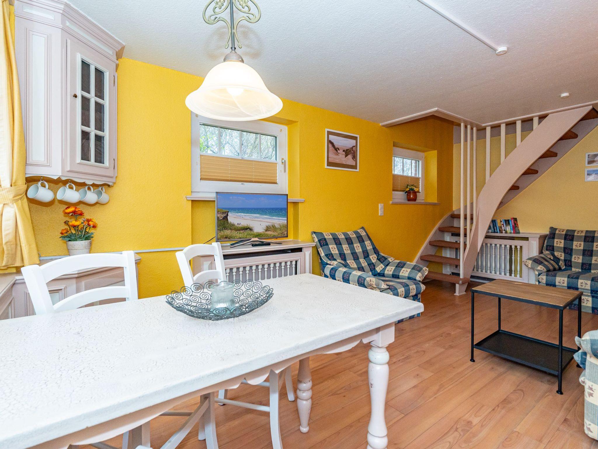 In einem kleinen separaten Haus liegt das neunte Apartment, welches sich über 2 Etagen erstreckt. Es bietet auf 50 Quadratmeter Platz für 4 Personen. Der Wohn- und Essbereich befindet sich im Erdgeschoss und verfügt über ein Schlafsofa. Im Obergeschoss befindet sich eine lauschige Schlafkoje mit 2 Einzelbetten. Das Badezimmer ist ausgestattet mit Dusche, WC und Waschbecken.