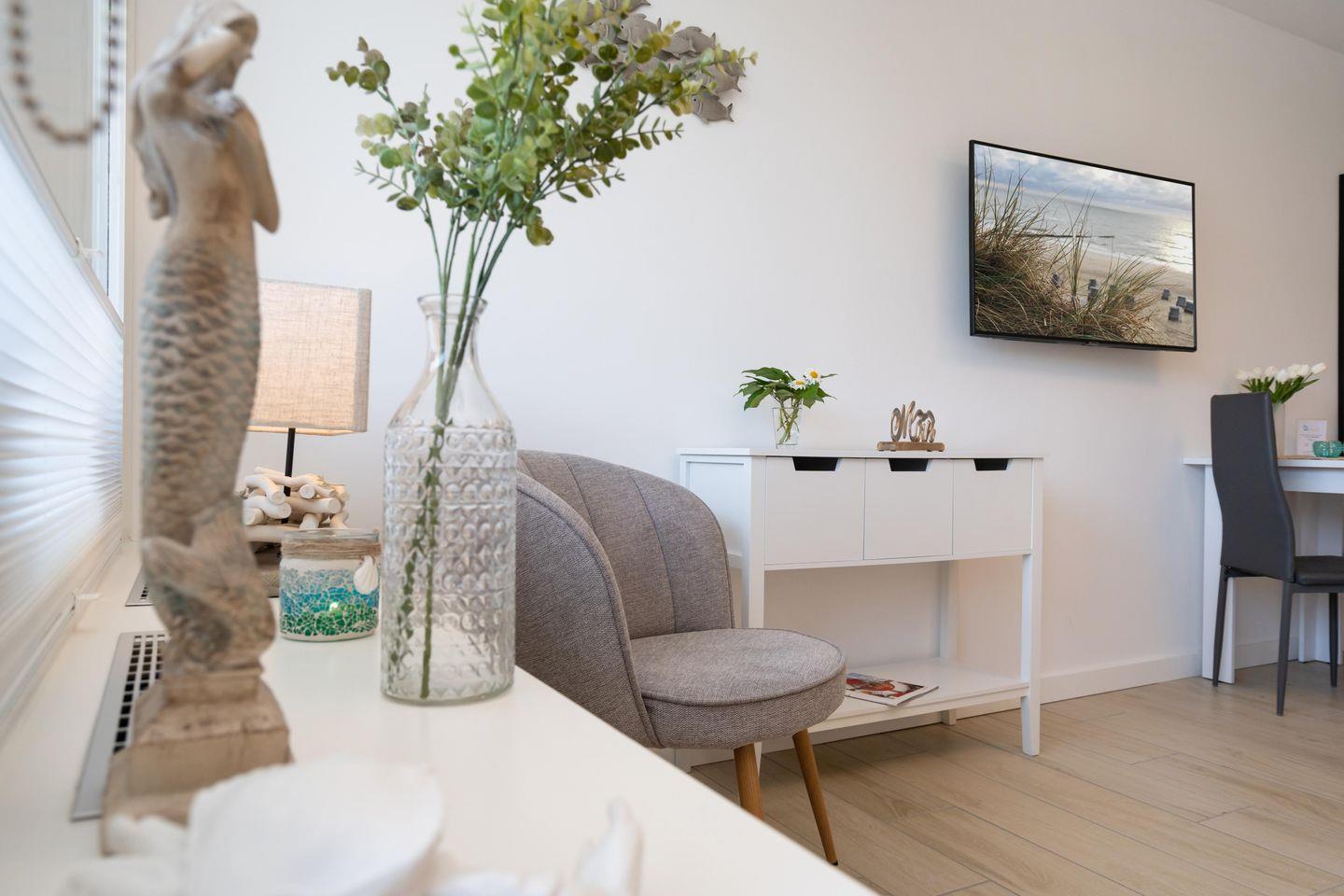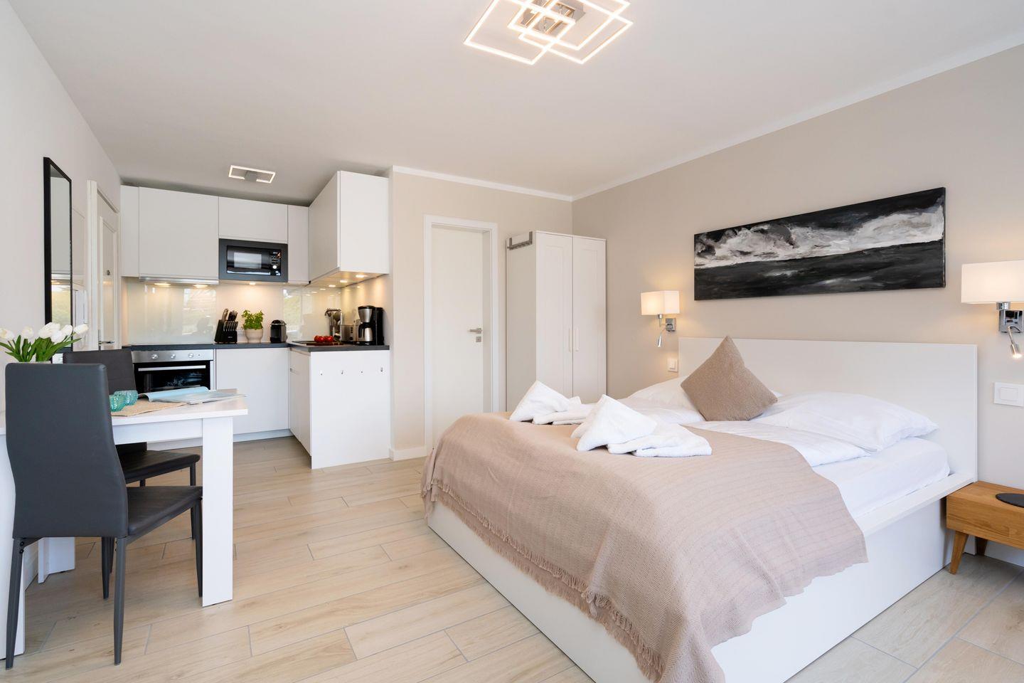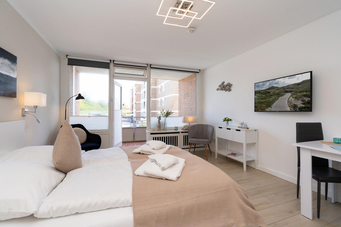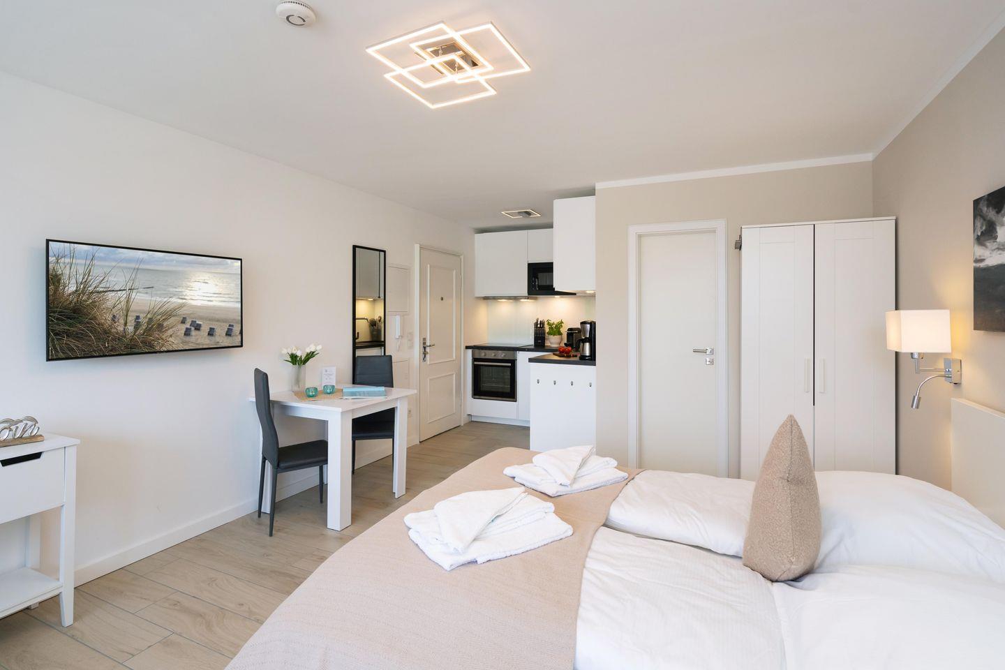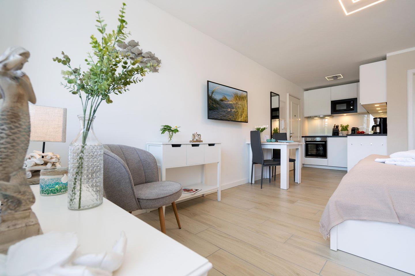 Modernes 1-Zimmer App. für 2 Pers. mit schönem Balkon samt Meerblick in unmittelbarer Strandlage. Inklusive WLAN sowie zugehörigem PKW-Stellplatz.