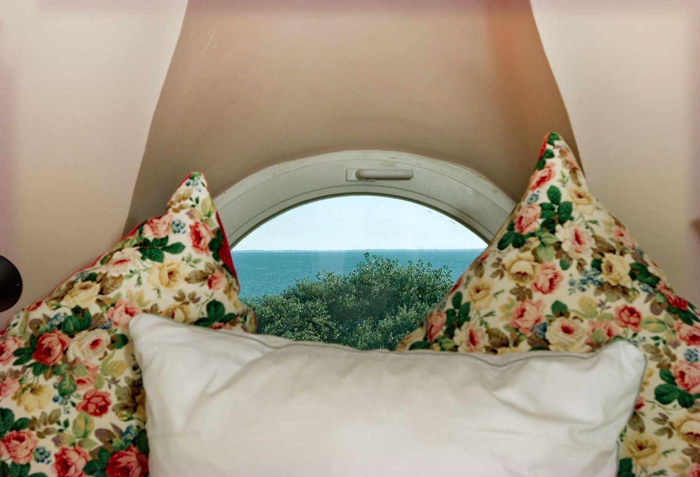 Die Dachschräge verleiht dem dritten Schlafzimmer mit breitem Doppelbett (180cm x 200cm low end) und „Ochsenauge“ samt Weitblick kuscheligen Charme. Hochwertige Tischlereinbauten setzen Akzente und runden das Wohlfühlambiente ab.