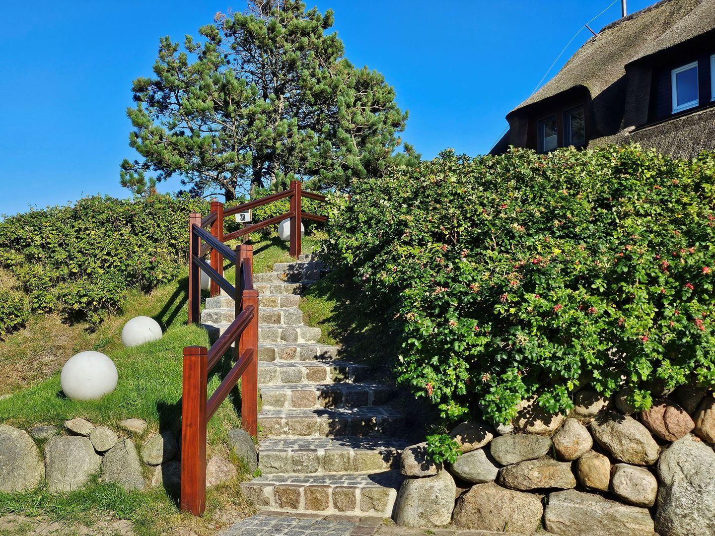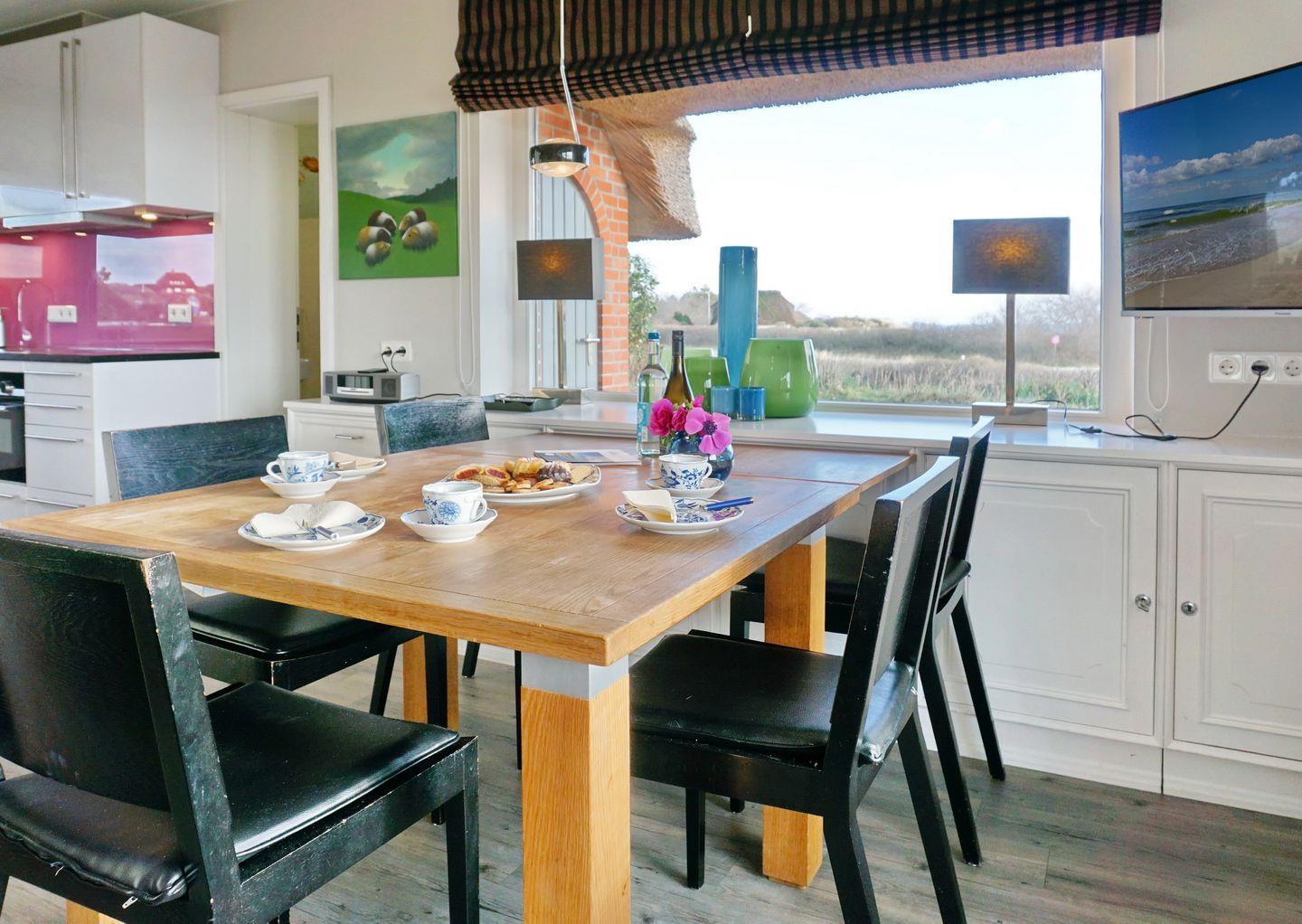 Im Erdgeschoss befindet sich der Wohn- und Essbereich mit offener Küche (Granitarbeitsplatte, KitchenAid Artisan Wasserkocher, Nespressomaschine, Alessi Saftpresse u.a.) mit direktem Blick auf das Wattenmeer, sowie ein Gäste WC. Auch von den zwei möblierten Terrassen – Weishäupl Teak-Gartenmöbel und original weiße Sylter Gartenmöbel - mit Strandkorb ( ca. April - Oktober ) hat man einen phantastischen Ausblick über die Heide, das Wattenmeer und die Blidselbucht und kann den ganzen Tag die Sonne genießen.