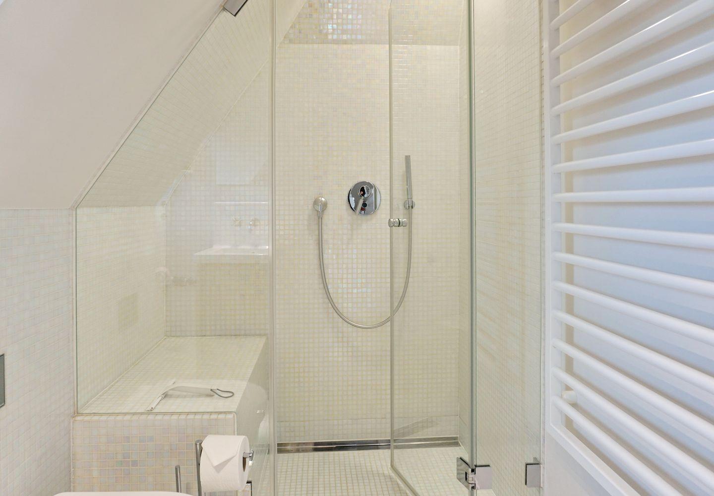 Eine Etage höher befinden sich zwei traumhaft gemütliche Schlafzimmer - das eine mit Doppelbett (180cm x 200cm low end) und das andere mit komfortablem Kojenbett (140cm x 200cm). Das daneben liegende Duschbad mit exklusiver Ausstattung und Bisazza Mosaik zeigt, dass man auch im Kleinen auf nichts verzichten muss, wenn alles klug angeordnet ist. Konzentrierte Kompaktheit ist hier das Motto, Weite vermisst man – allein durch den Ausblick – trotzdem nicht!