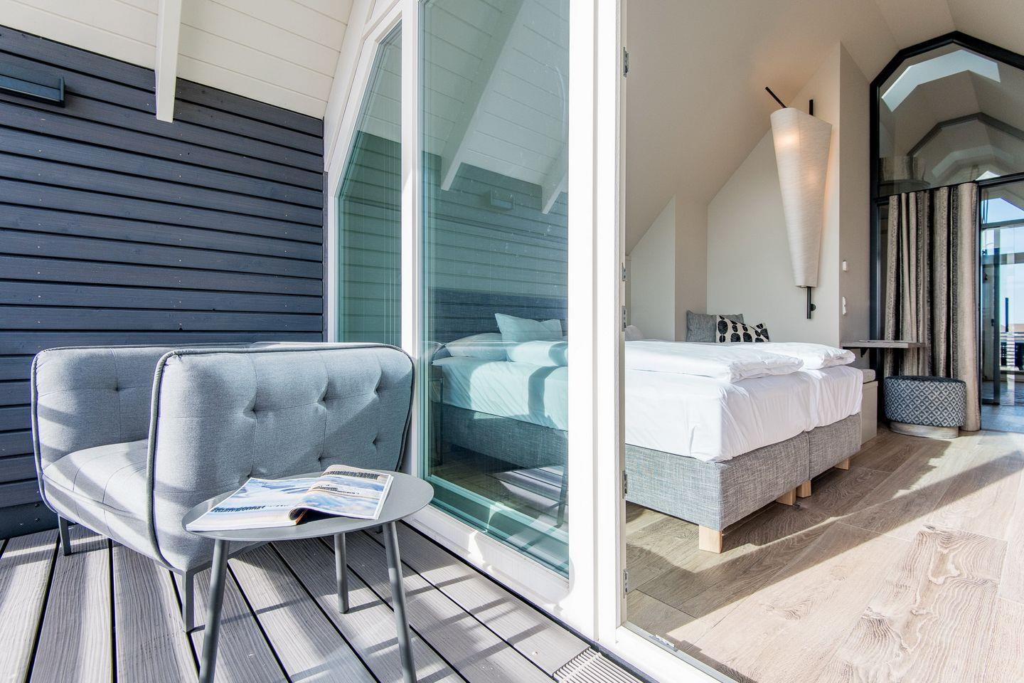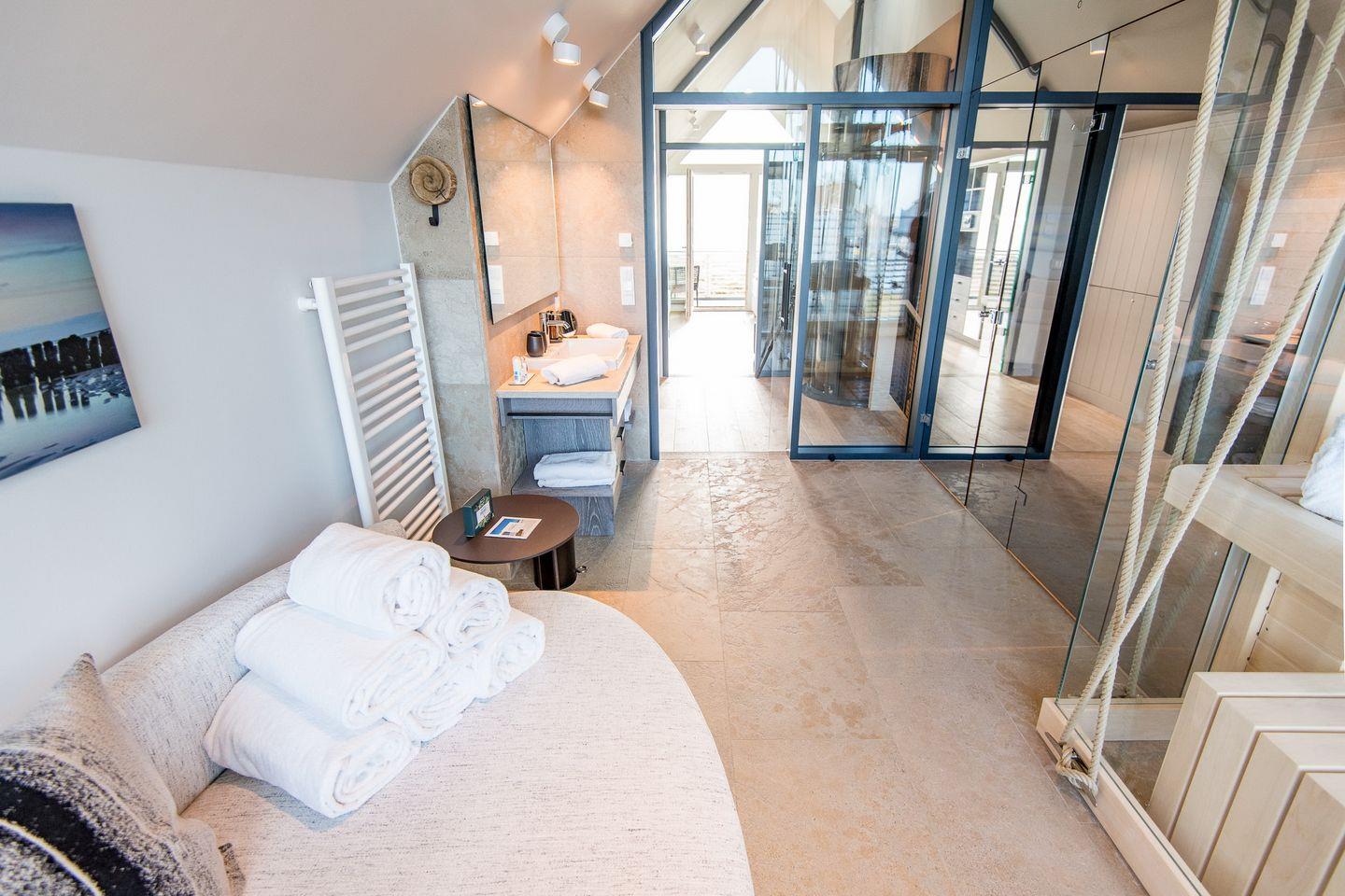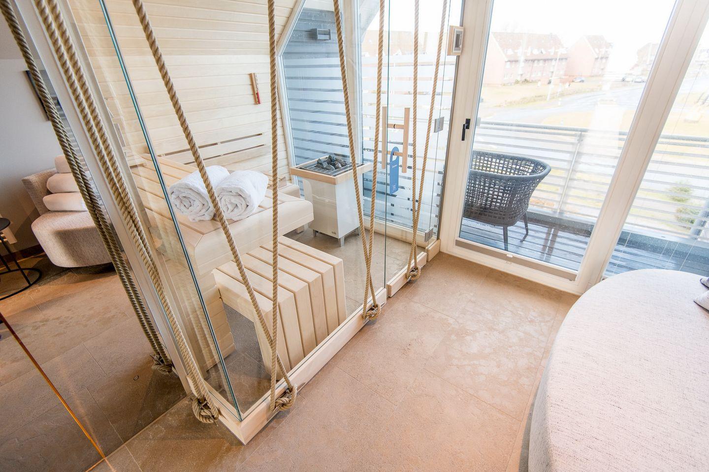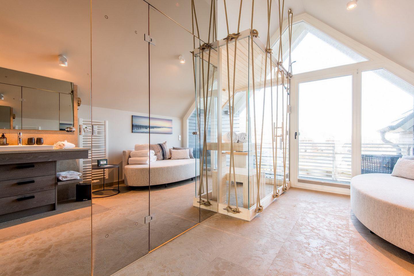 DG: ein Raum mit Doppelbett (1,80 x 2,00 m) und TV, eigener Balkon, offenes Duschbad mit separatem WC, Saunabereich mit Balkon.