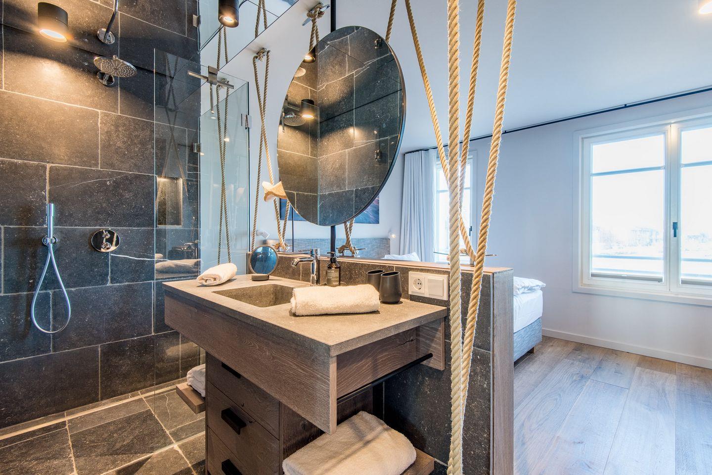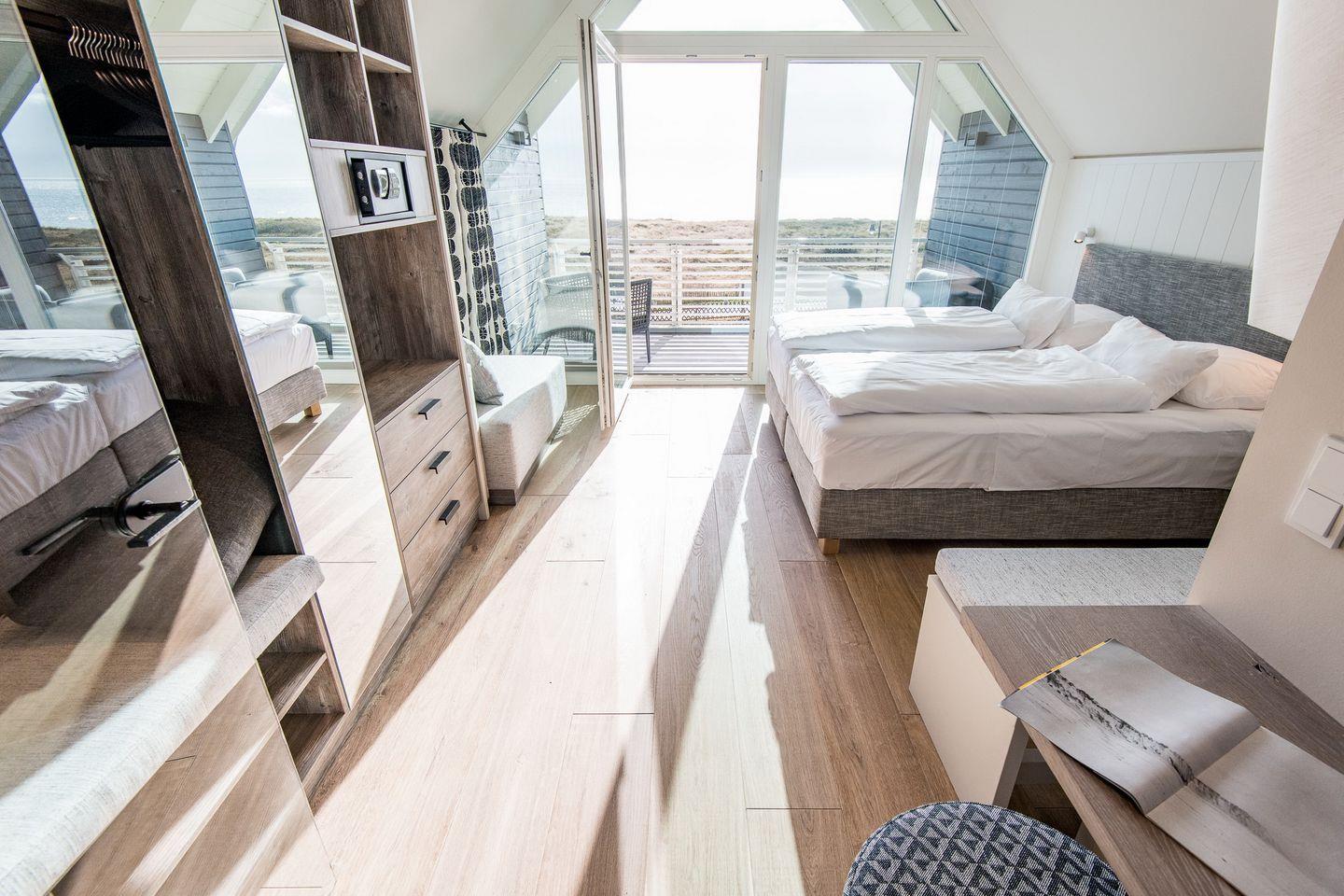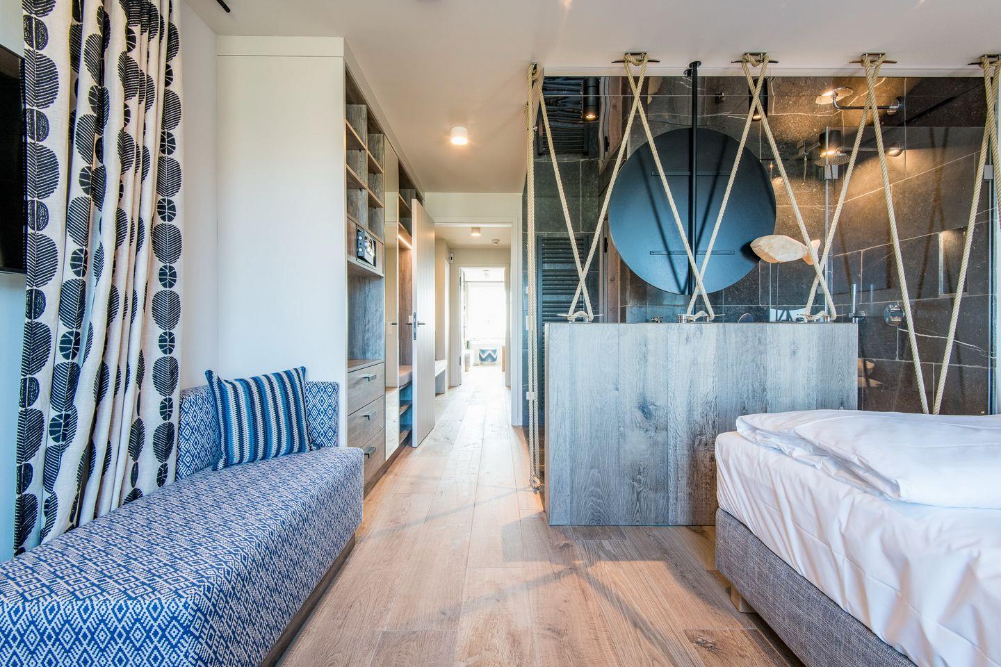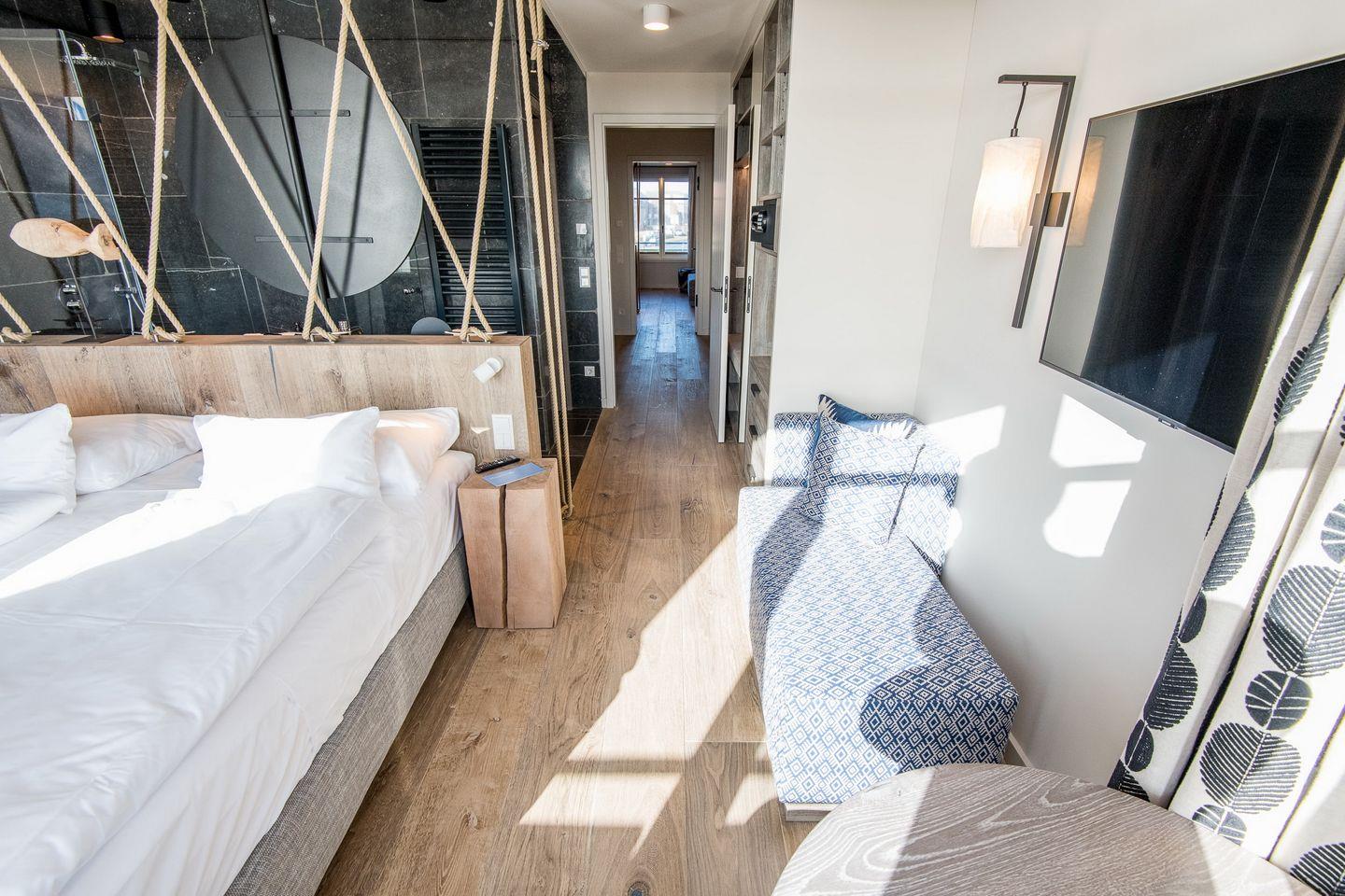 DG: ein Raum mit Doppelbett (1,80 x 2,00 m) und TV, eigener Balkon, offenes Duschbad mit separatem WC, Saunabereich mit Balkon.