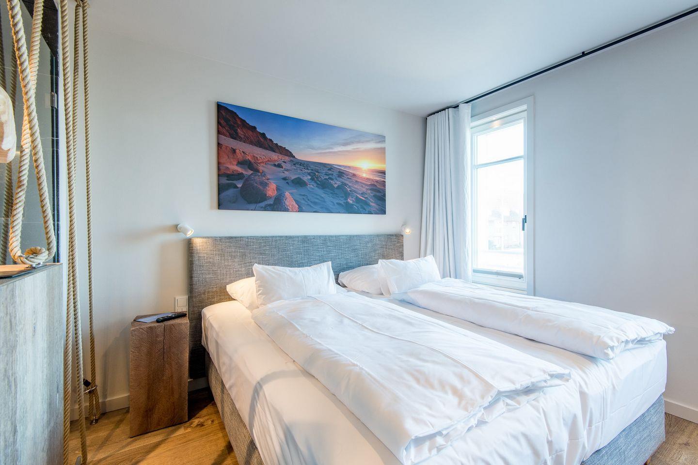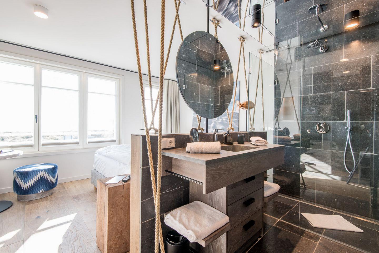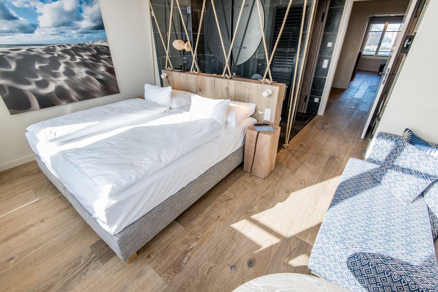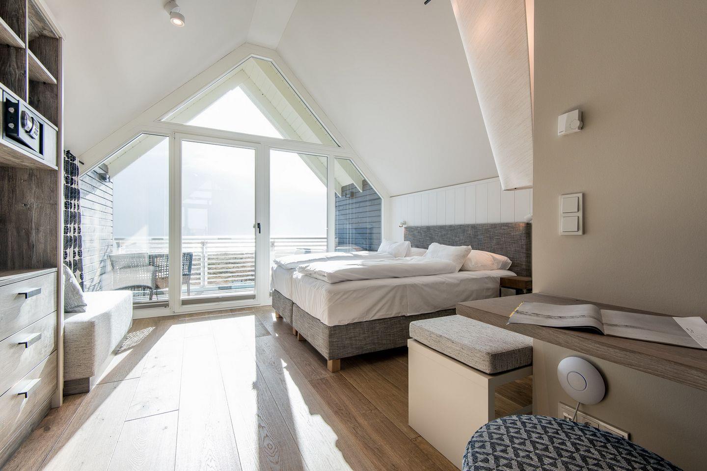 DG: ein Raum mit Doppelbett (1,80 x 2,00 m) und TV, eigener Balkon, offenes Duschbad mit separatem WC, Saunabereich mit Balkon.