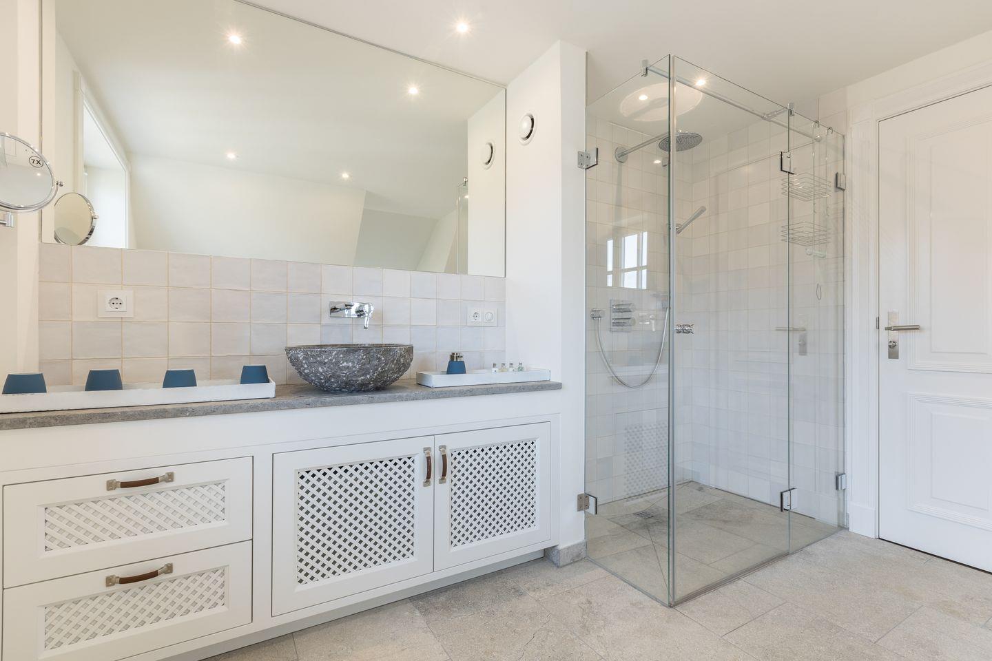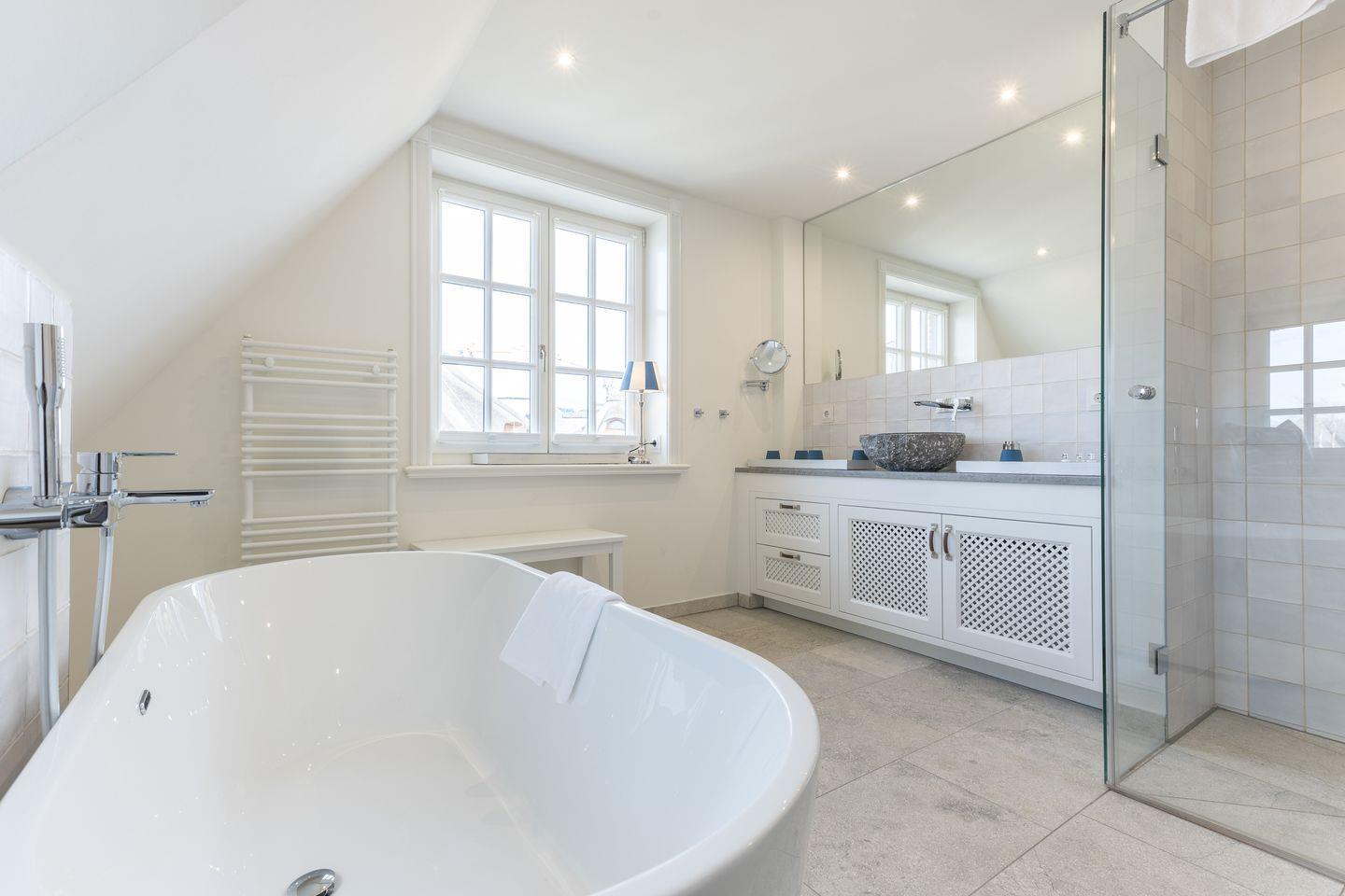 OG: ein Schlafraum mit Doppelbett (1,80 x 2,00 m), Flatscreen-TV und begehbarem Kleiderschrank, Vollbad mit freistehender Badewanne und Dusche, separates WC