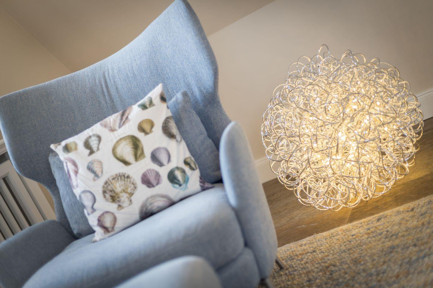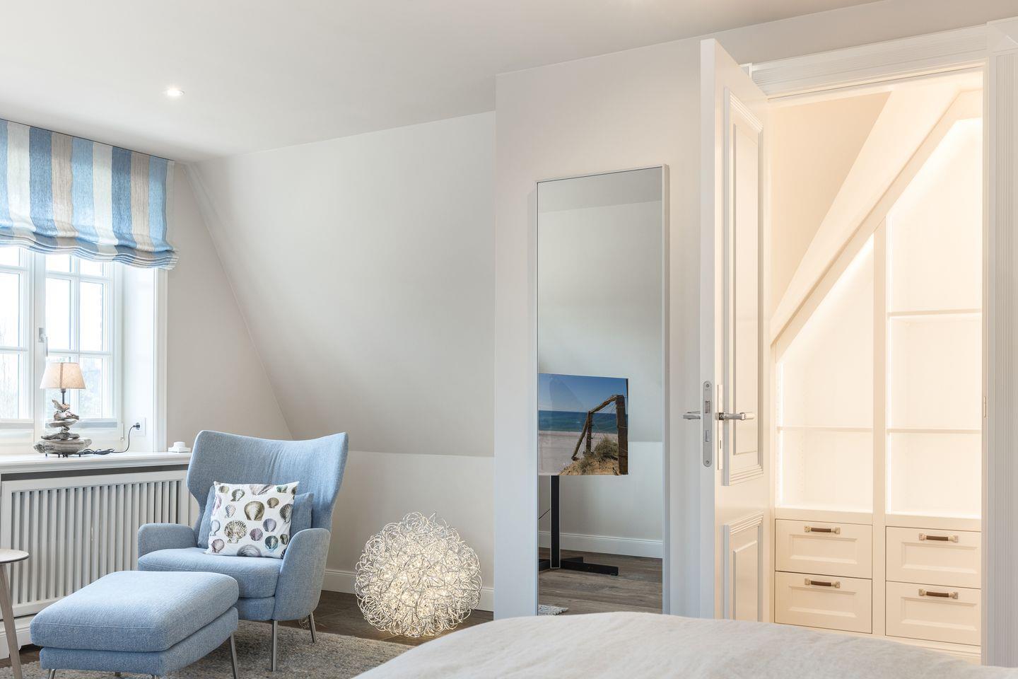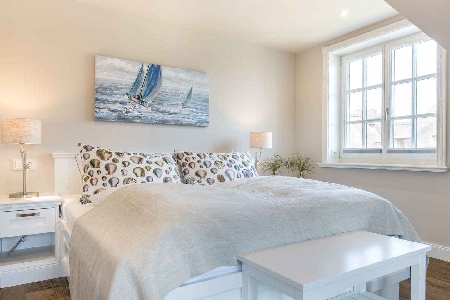 Im Obergeschoss des Hauses finden Sie ein lichtdurchflutetes, großzügiges Schlafzimmer mit Doppelbett, Flatscreen-TV und begehbarem Kleiderschrank. Auf gleicher Ebene erwartet Sie ein Vollbad mit freistehender Badewanne und Dusche sowie einem separaten WC.