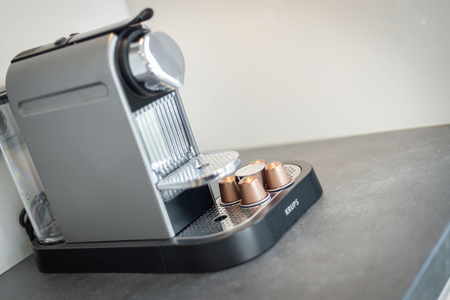 Obergeschoss: Wohnbereich mit Flatscreen-TV und einer Magenta Box, Radio, Soundsystem, CD Player, Entertain TV und Satelliten TV, offene Küchenzeile mit hochwertiger Ausstattung, Backofen, Induktionsherd, Geschirrspüler, Kaffeemaschine, Nespresso-Maschine.