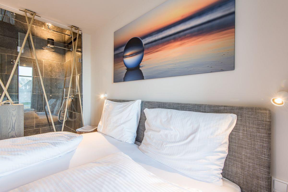 OG: zwei Räume mit Doppelbett (1,80 x 2,00 m), TV und offenem Duschbädern und separatem WC.