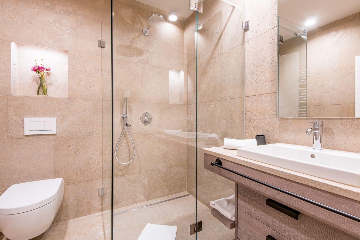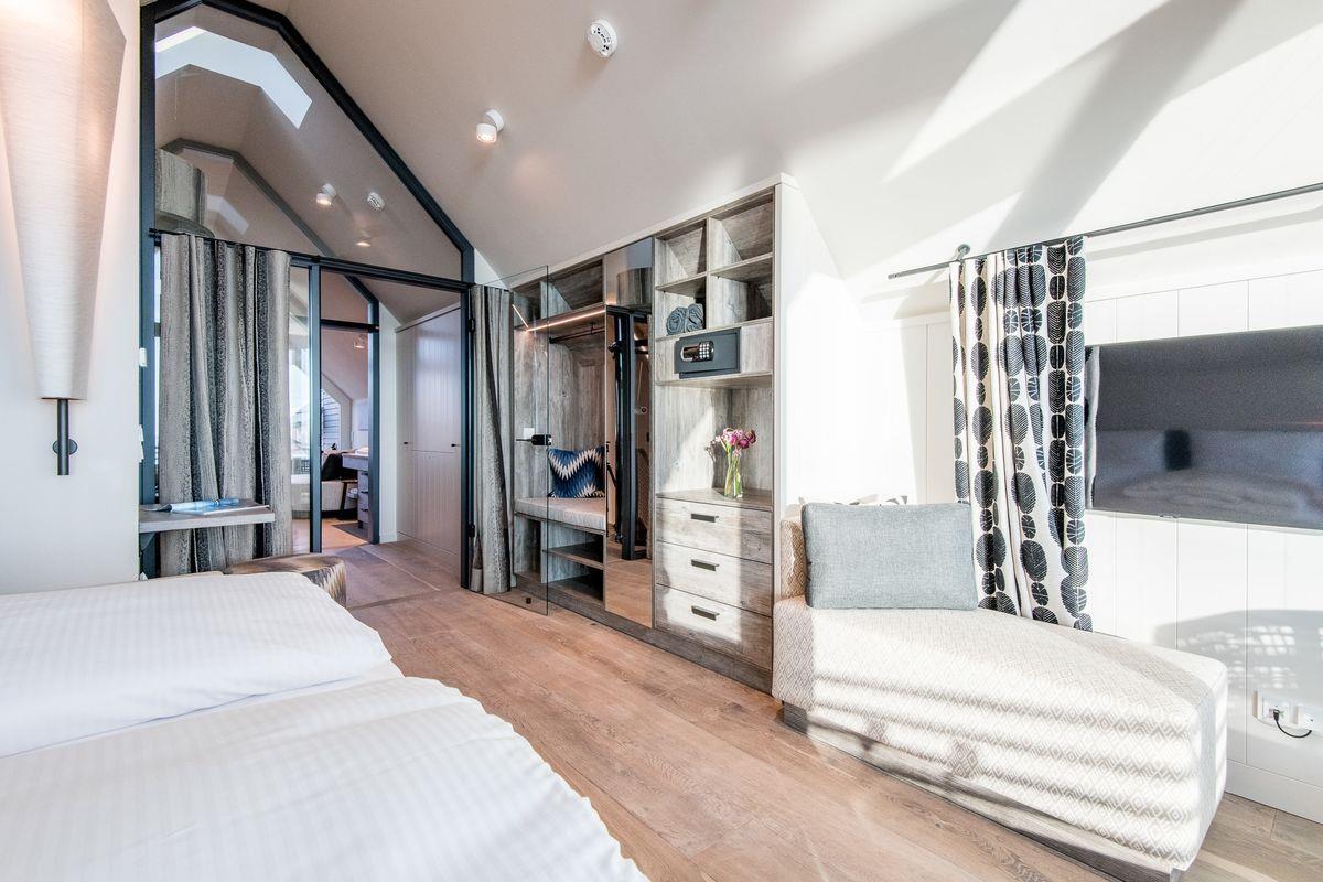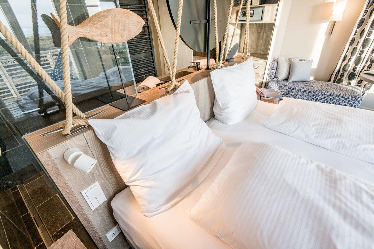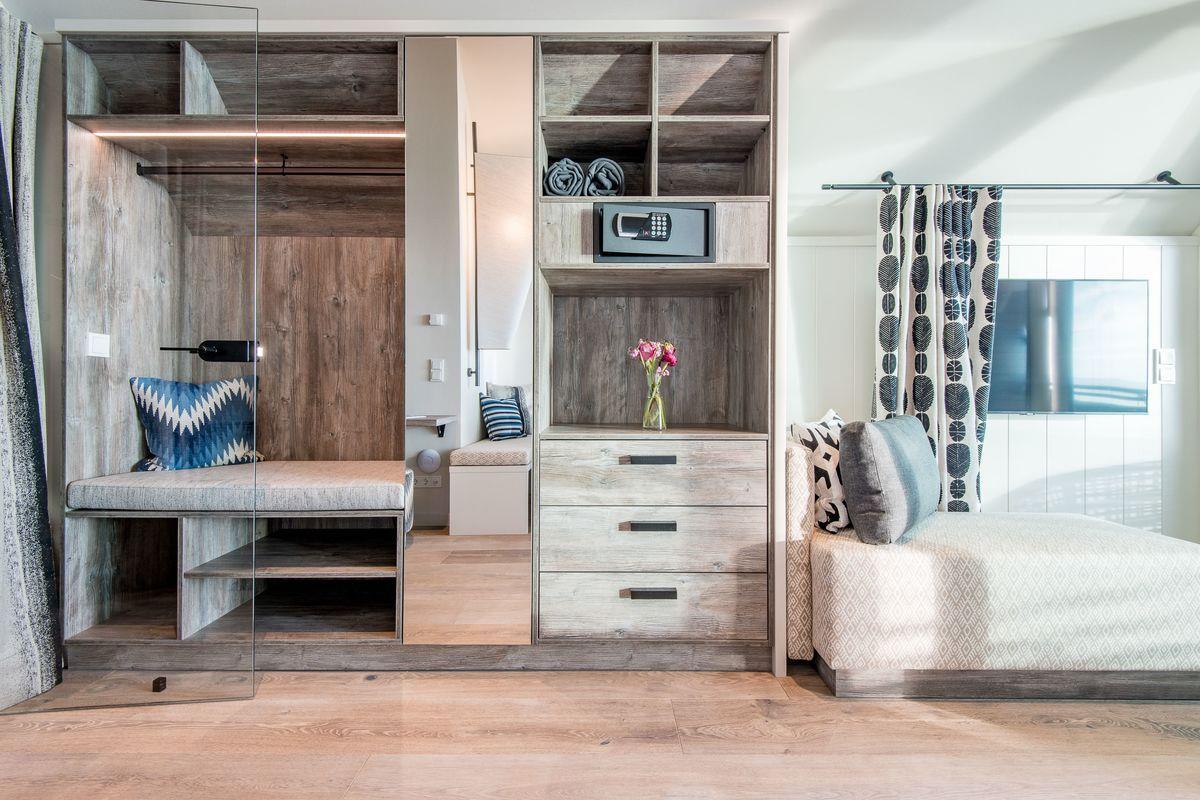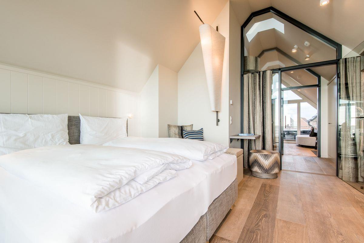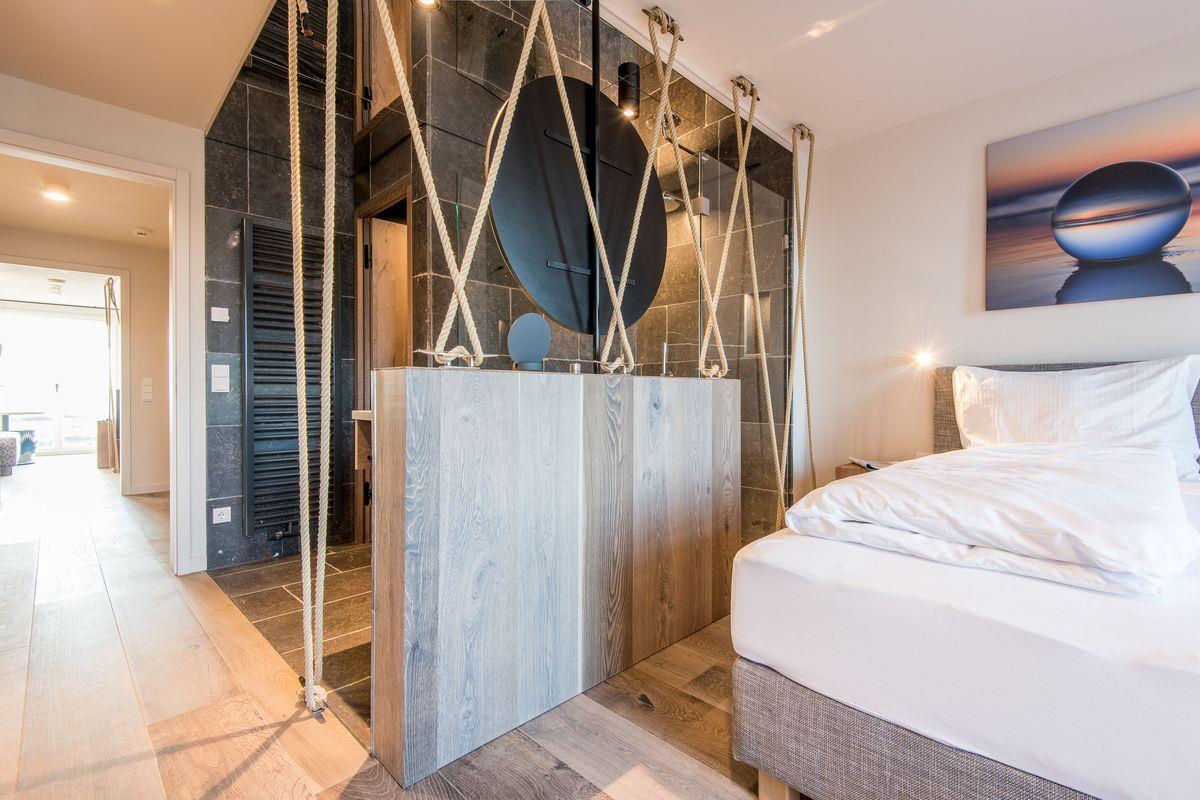 DG: ein Raum mit Doppelbett (1,80 x 2,00 m) und TV, eigener Balkon, offenes Duschbad mit separatem WC, Saunabereich mit Balkon.