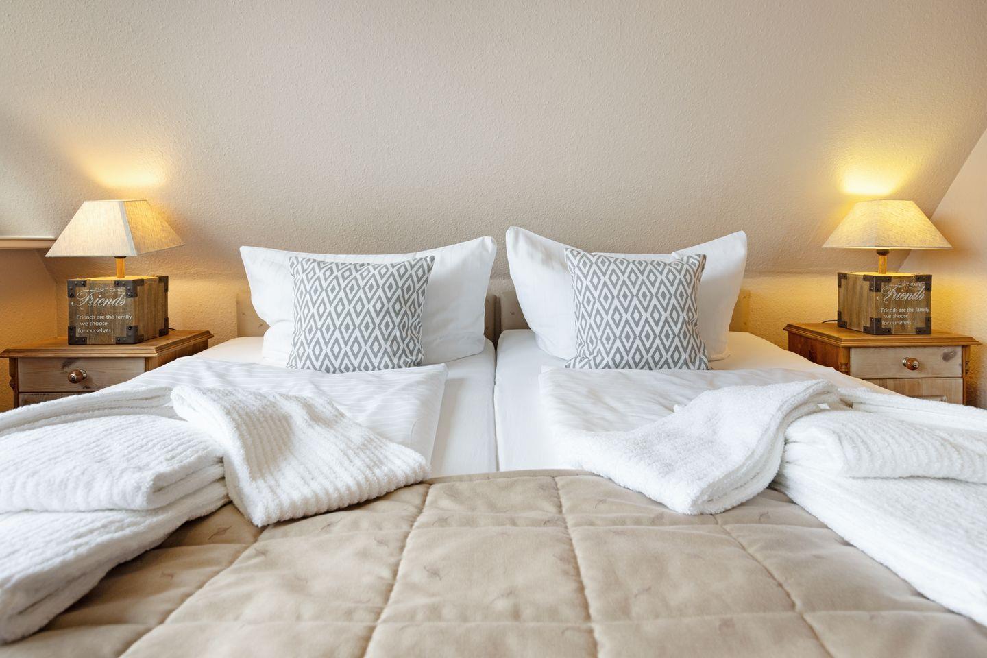 Die Ferienwohnung verfügt über ein Schlafzimmer mit Doppelbett (im zweiten Obergeschoss) und eine Schlafcouch für zwei Personen mit zusätzlichen Topper im Wohnzimmer.