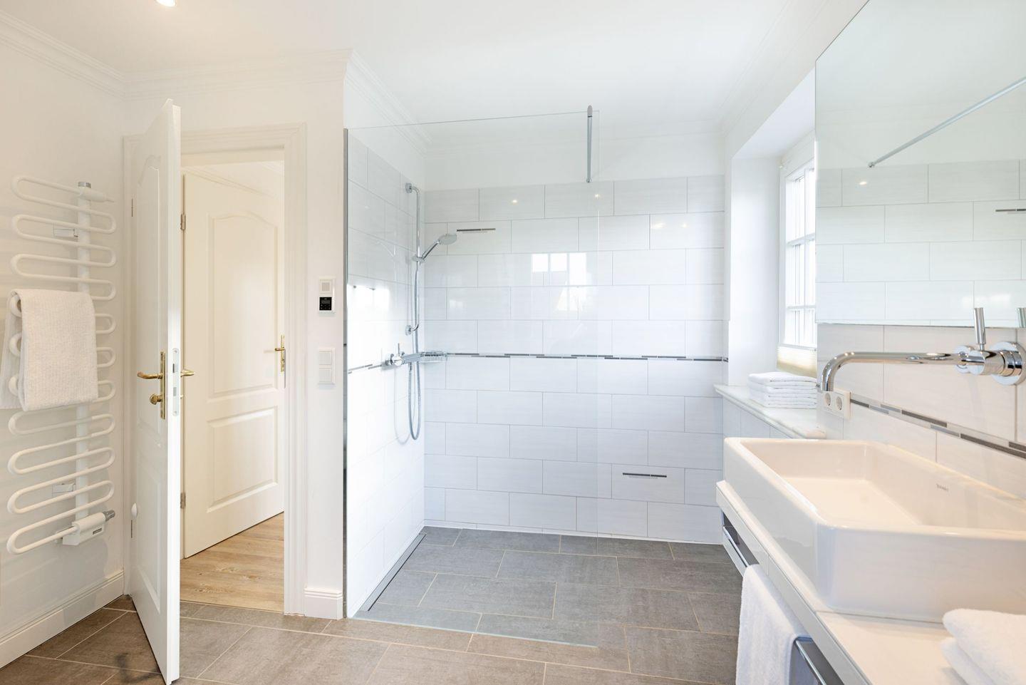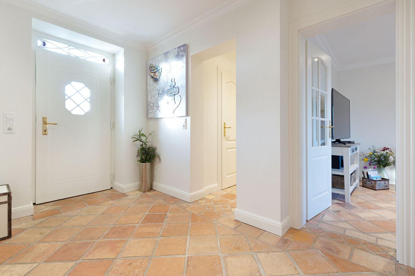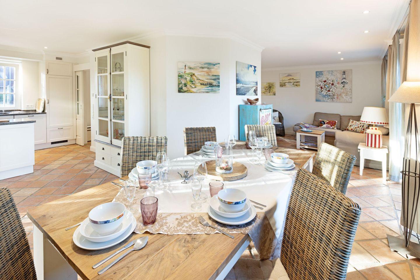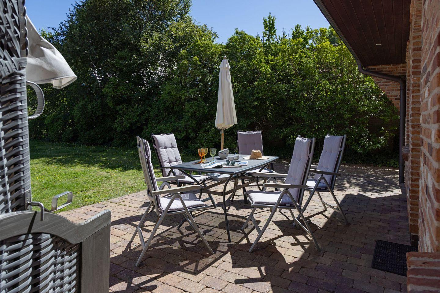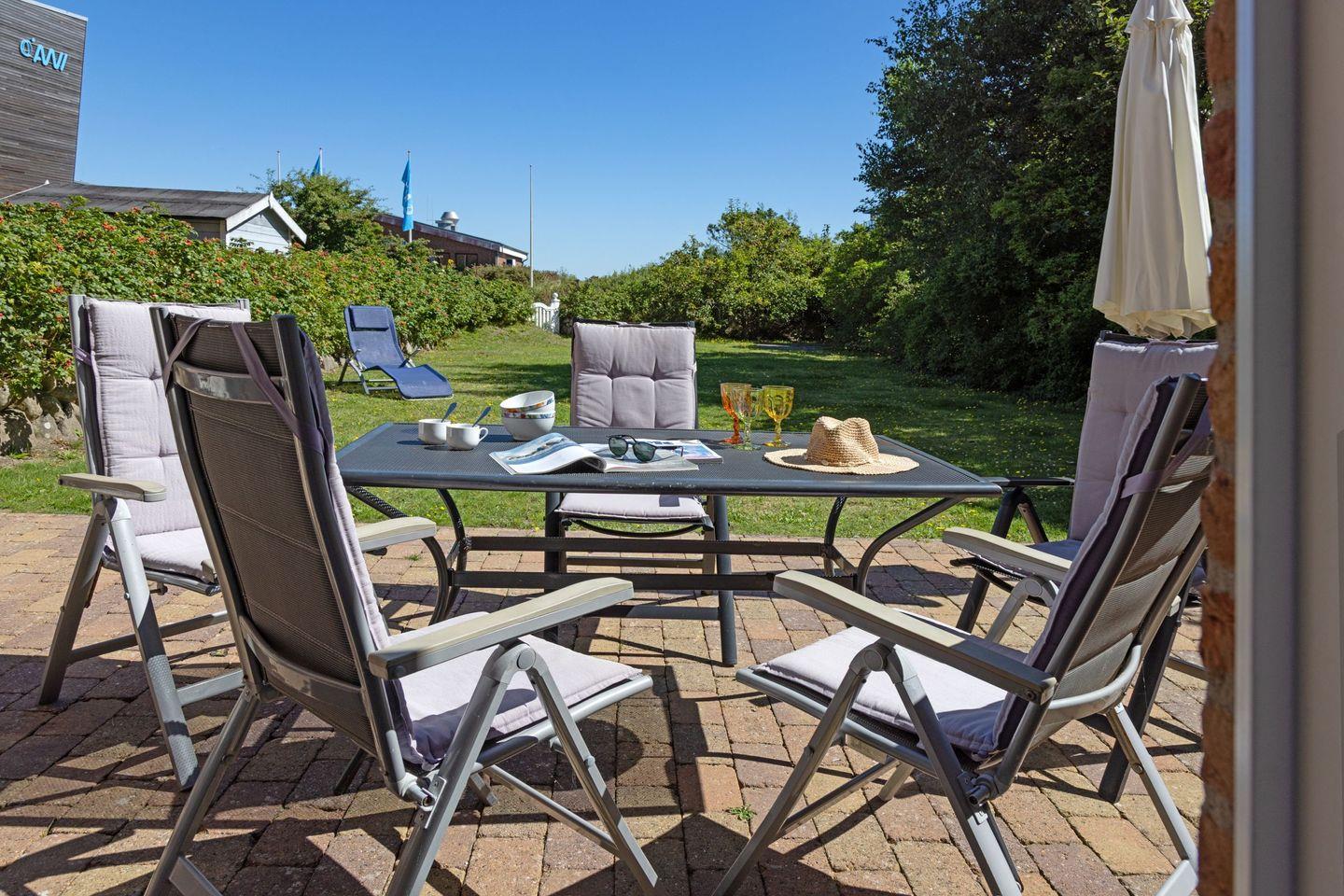 Vom Garten mit großer Terrasse, Gartenmöbel und ein Strandkorb sind vorhanden sind Sie in ca. 66 Metern am Strand.