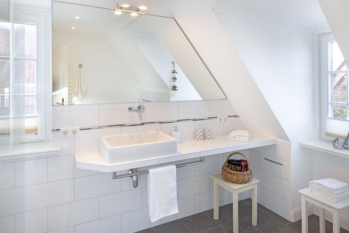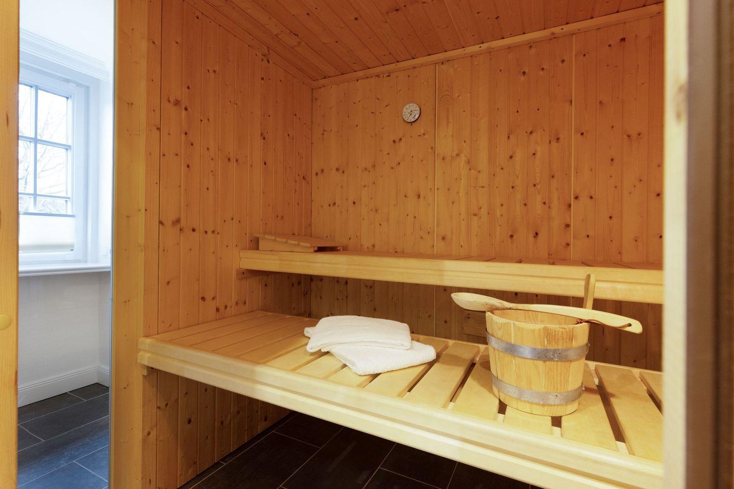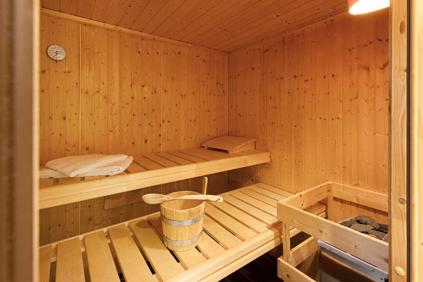 Ein Badezimmer mit Dusche, ein zweites Badezimmer mit einer Dusch/Badewanne und eine große Sauna.