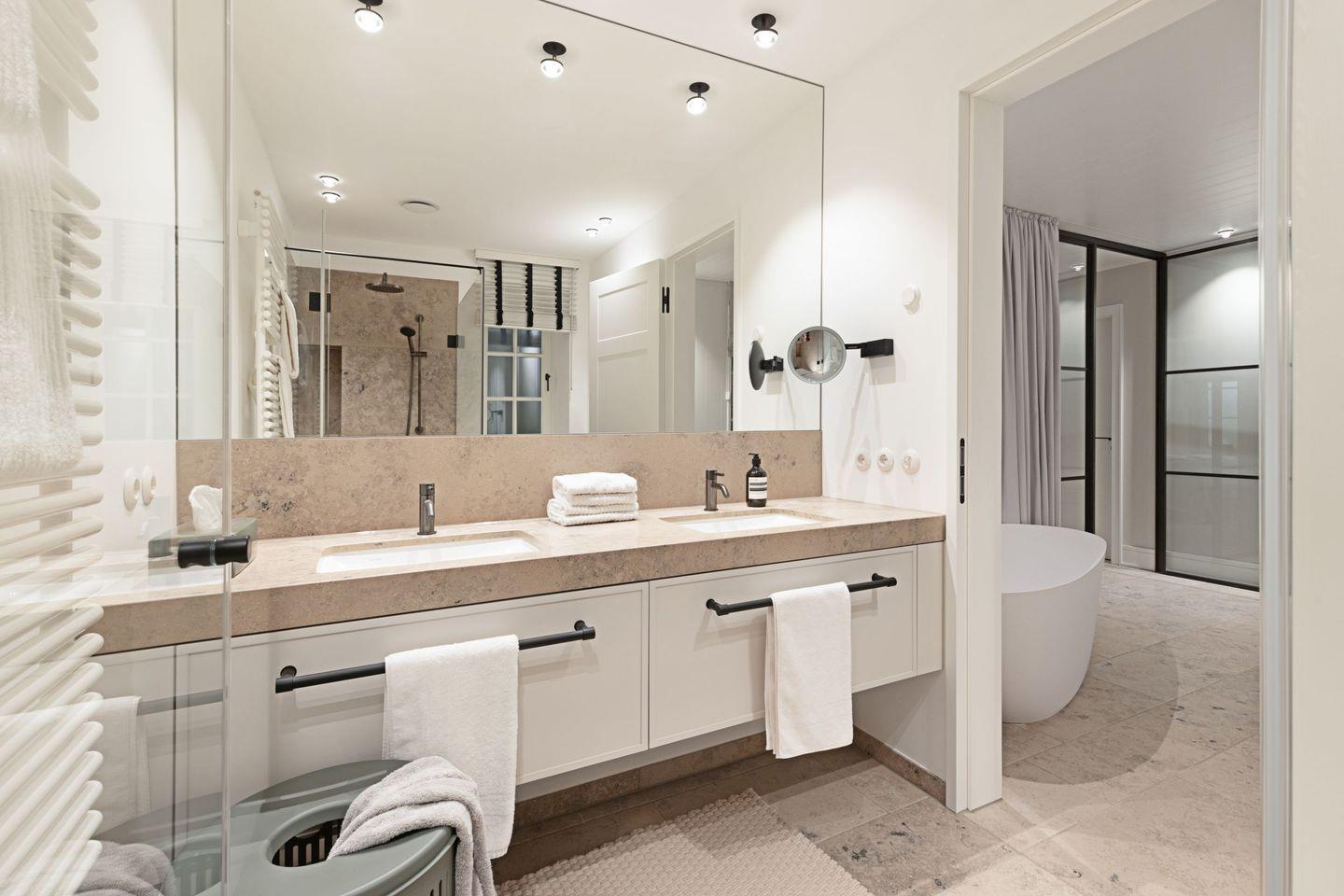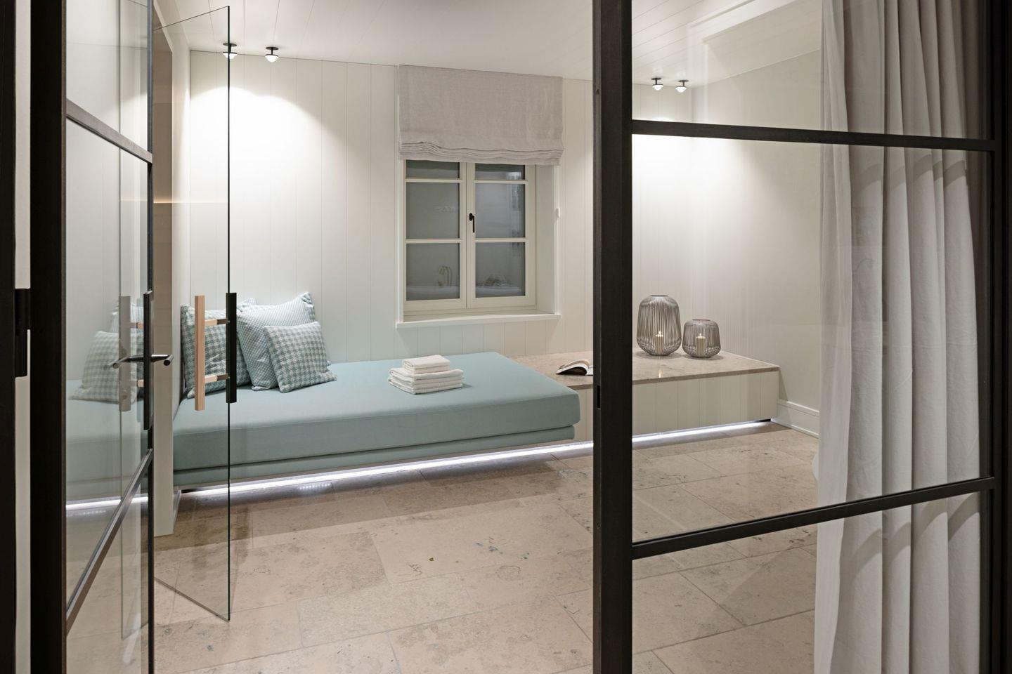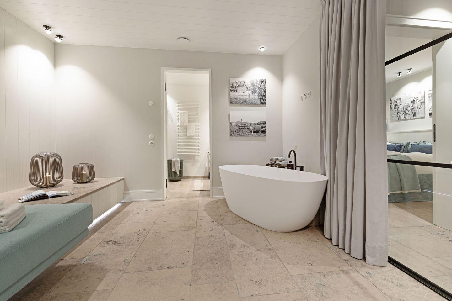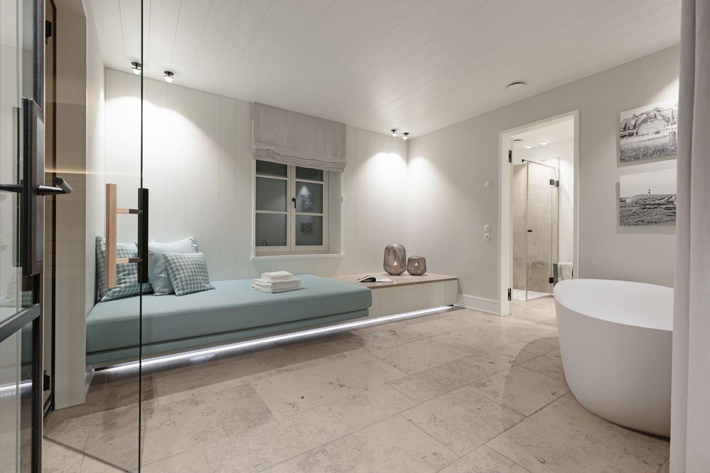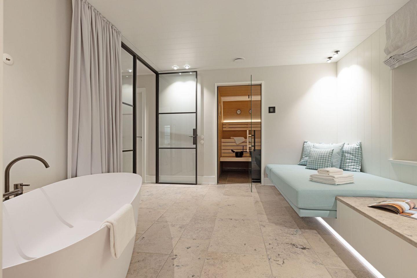 Der große Wellnessbereich mit Sauna, freistehender Badewanne und Sitzecke bietet Ihnen viele Möglichkeiten zum entspannen.