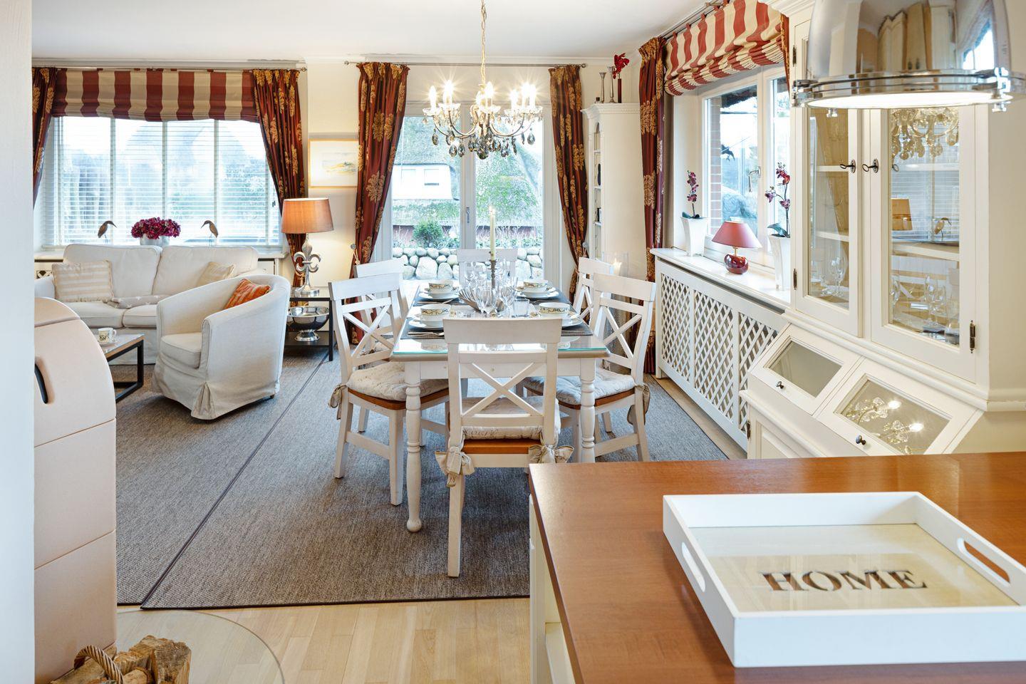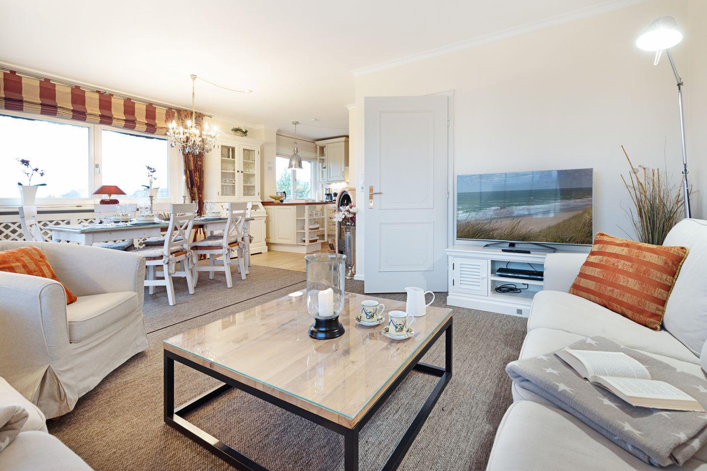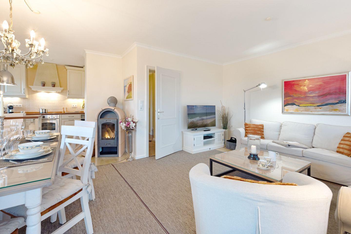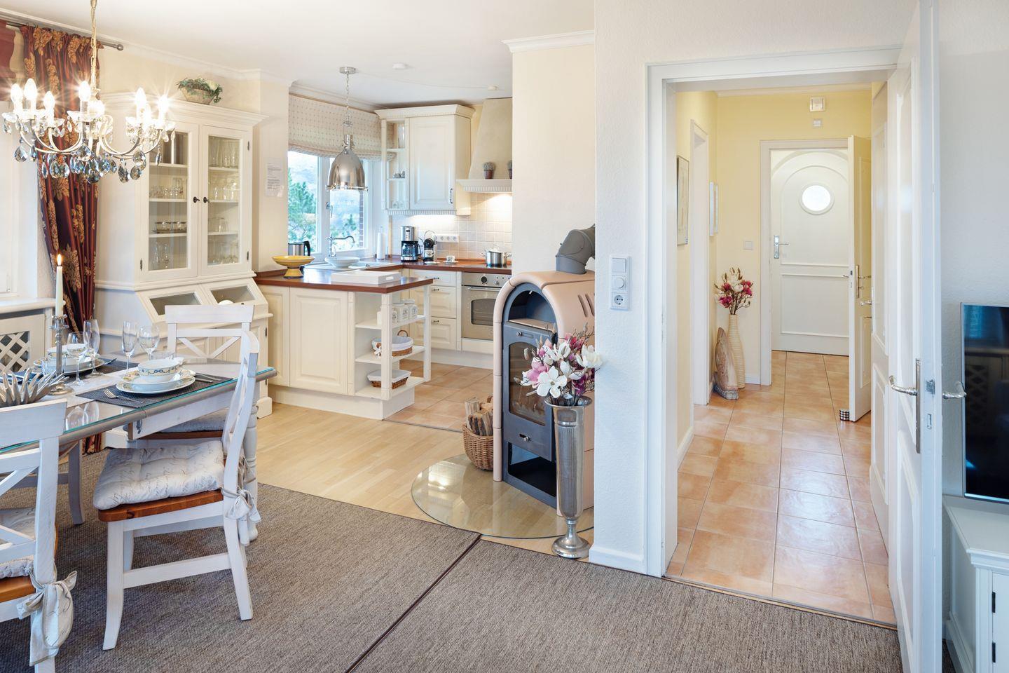 Ihr Feriendomizil verfügt über hochwertige Einrichtung und Ausstattung, Terracotta Fliesen, großes Wohn/Esszimmer, offene Landhausküche mit hochwertiger Küchentechnik, Kaminofen, Schlafplätze für 4 Personen, 1 Vollbad, 2 Duschbäder, Sauna, Gäste-WC, 3 Sat- LCD- TV, DVD, W-LAN/Glasfaseranschluss, große möblierte Terrasse mit Südausrichtung, 2 Strandkörbe, 2 Parkplätze.