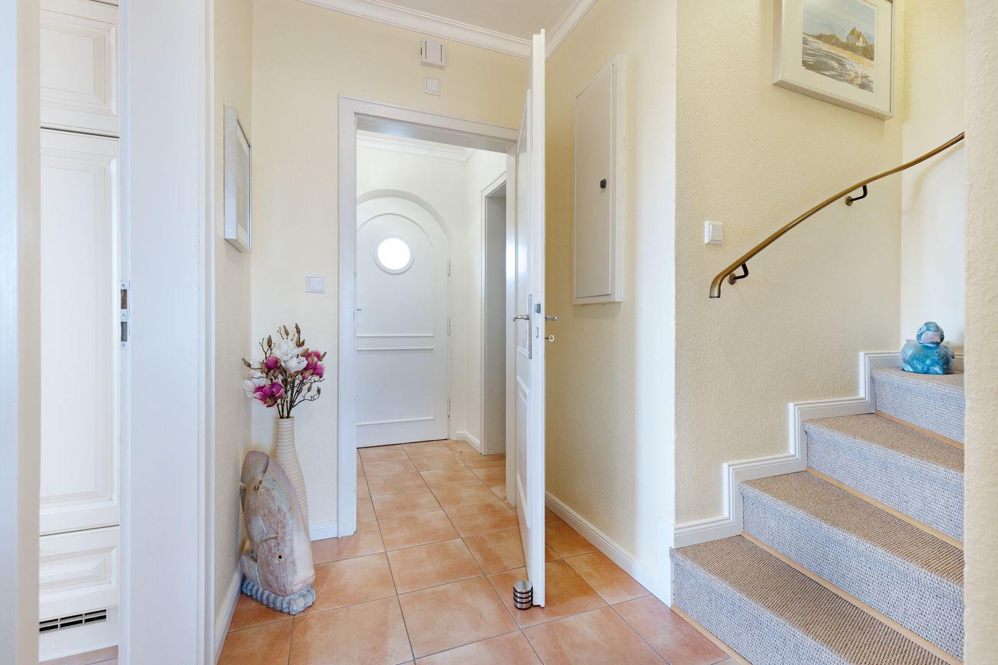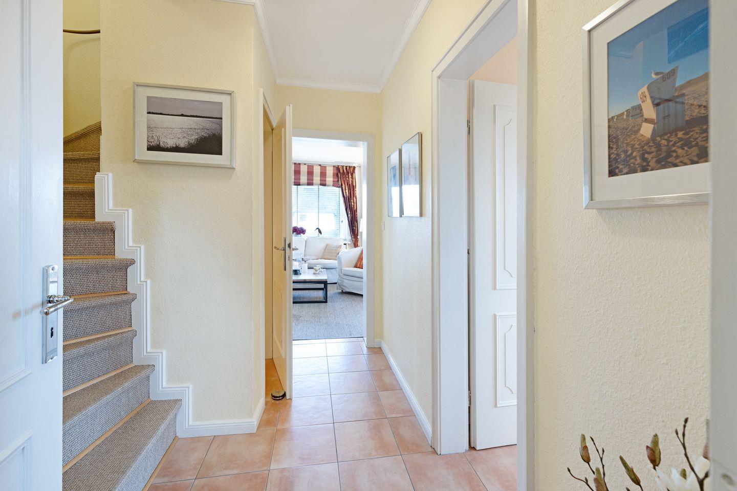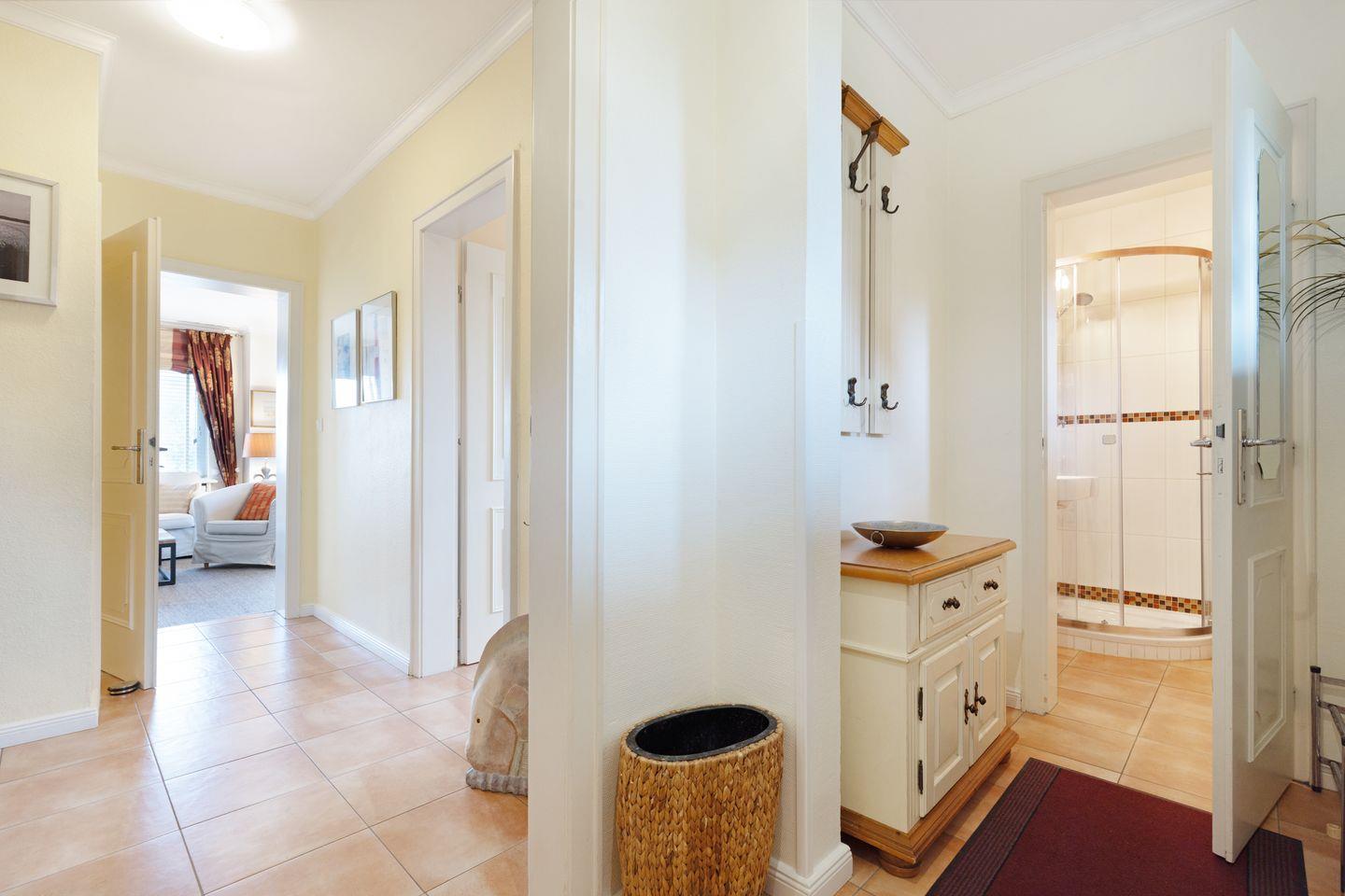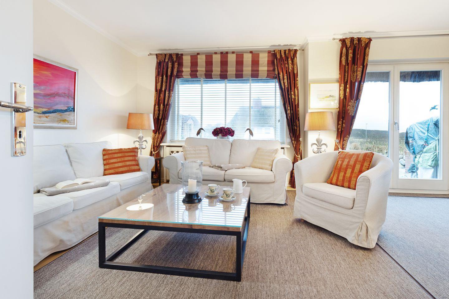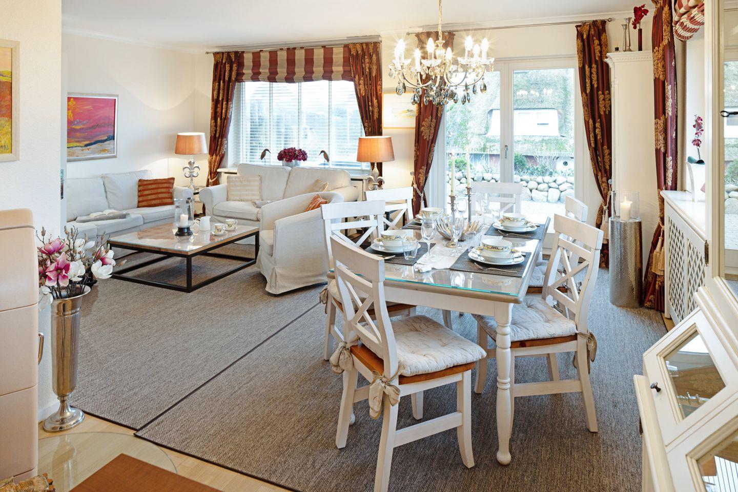 Ihr Feriendomizil verfügt über hochwertige Einrichtung und Ausstattung, Terracotta Fliesen, großes Wohn/Esszimmer, offene Landhausküche mit hochwertiger Küchentechnik, Kaminofen, Schlafplätze für 4 Personen, 1 Vollbad, 2 Duschbäder, Sauna, Gäste-WC, 3 Sat- LCD- TV, DVD, W-LAN/Glasfaseranschluss, große möblierte Terrasse mit Südausrichtung, 2 Strandkörbe, 2 Parkplätze.
