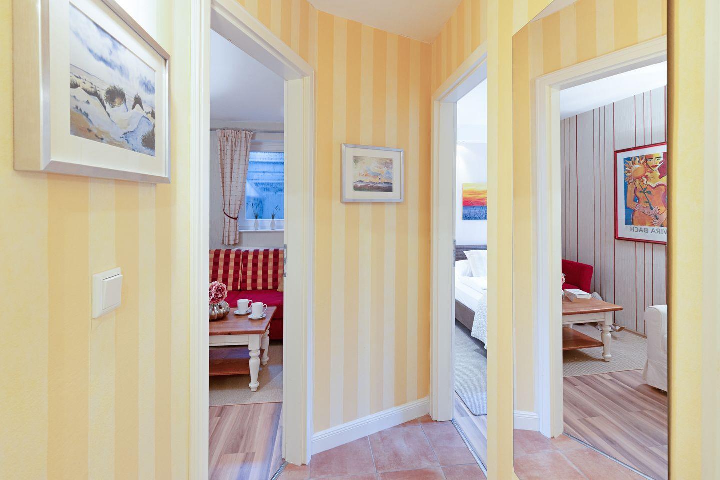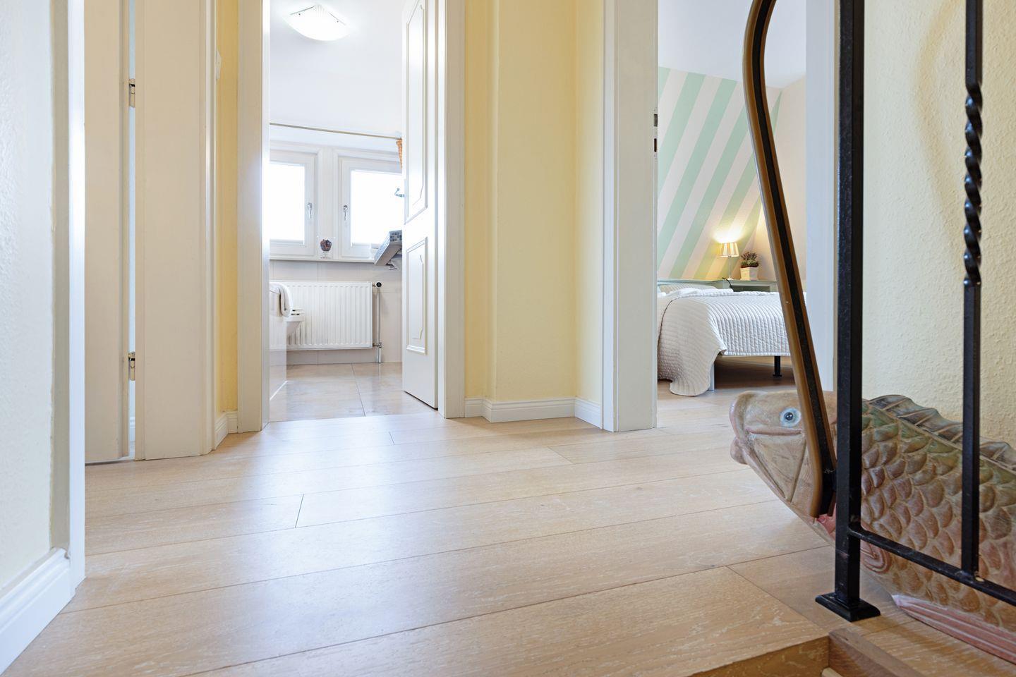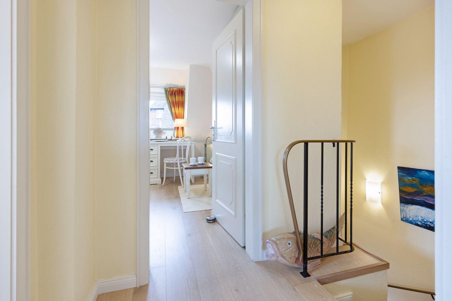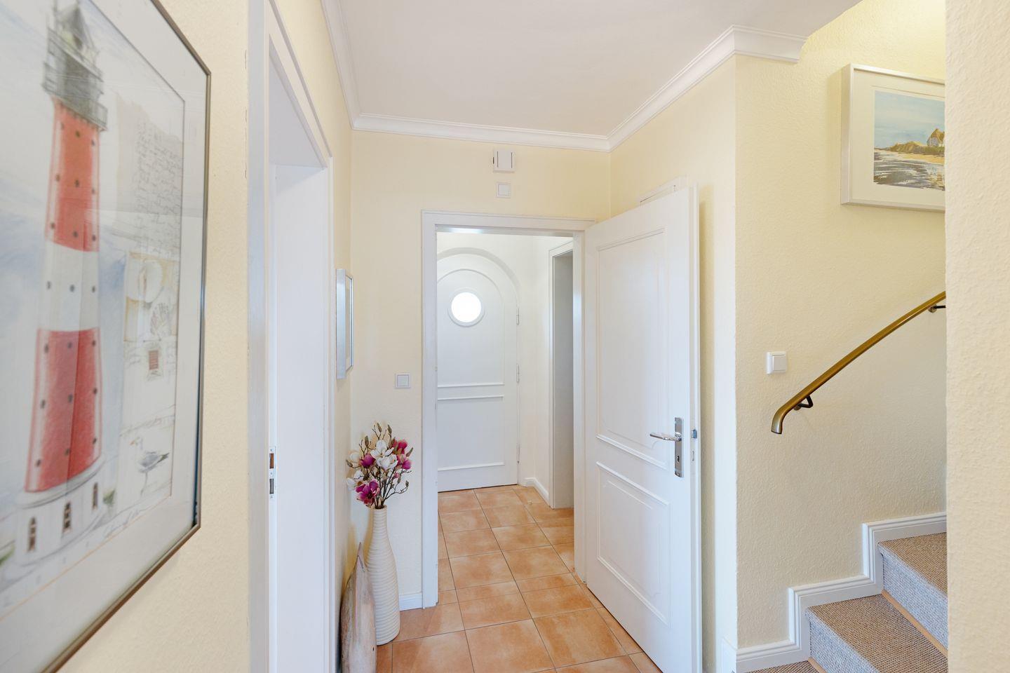 Ihr Feriendomizil verfügt über hochwertige Einrichtung und Ausstattung, Terracotta Fliesen, großes Wohn/Esszimmer, offene Landhausküche mit hochwertiger Küchentechnik, Kaminofen, Schlafplätze für 4 Personen, 1 Vollbad, 2 Duschbäder, Sauna, Gäste-WC, 3 Sat- LCD- TV, DVD, W-LAN/Glasfaseranschluss, große möblierte Terrasse mit Südausrichtung, 2 Strandkörbe, 2 Parkplätze.