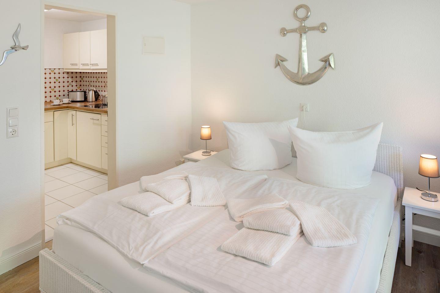 Das 42 qm große Appartement für 2 Personen befindet sich im Erdgeschoss und verfügt über einen kombinierten Wohn/Schlafraum mit Couchgarnitur, eine Essecke, ein Doppelbett sowie eine separate Küche und Duschbad.