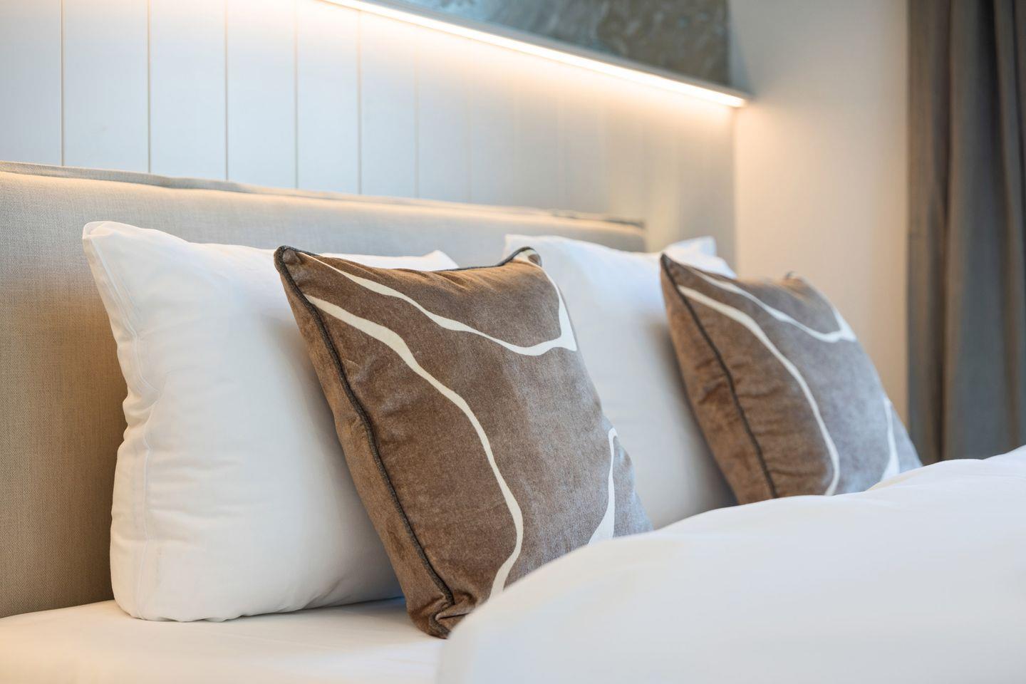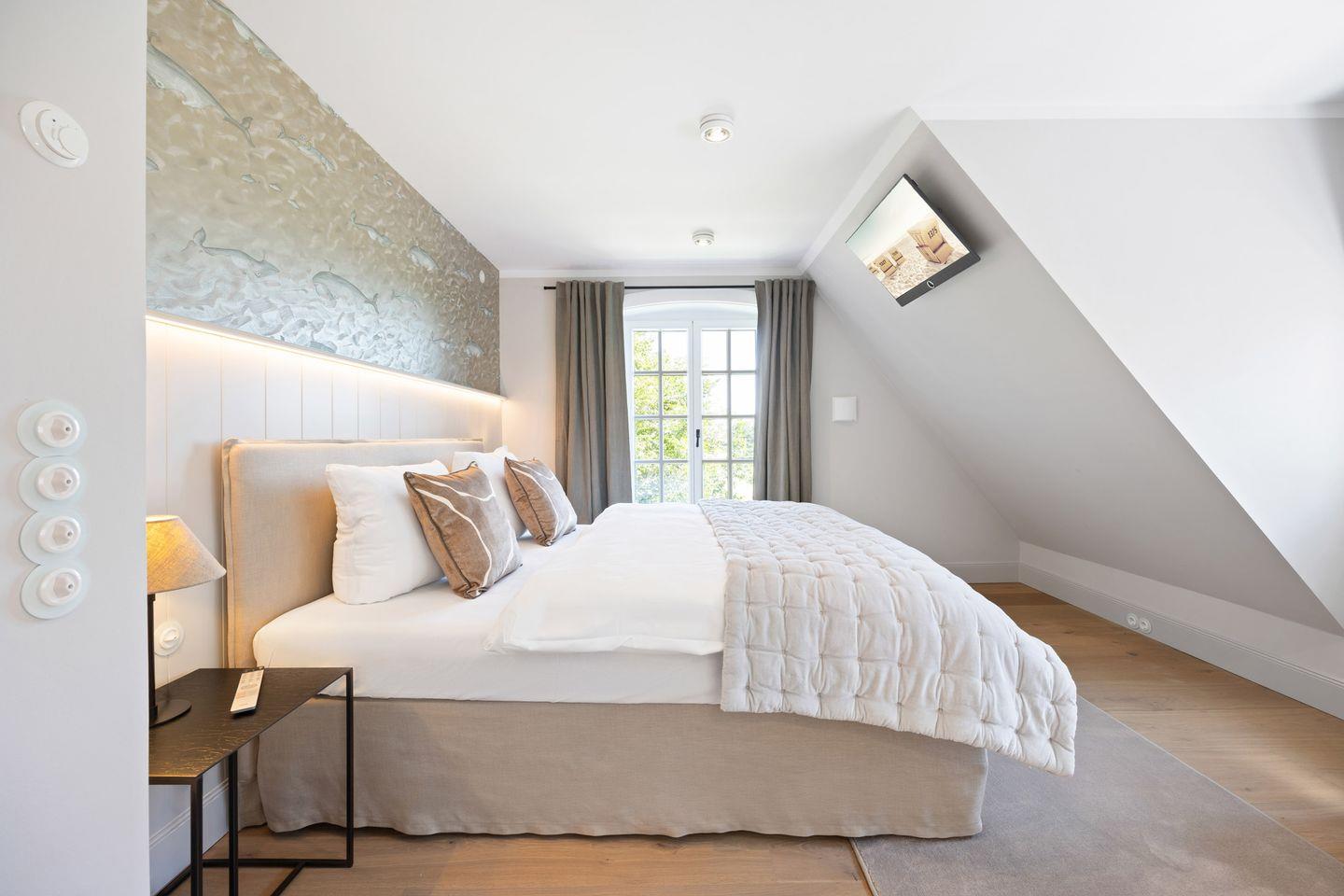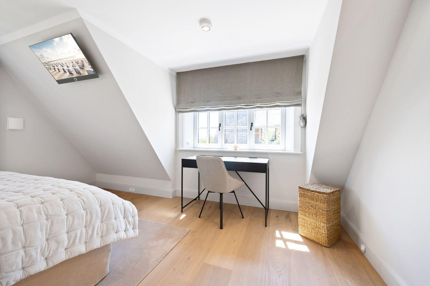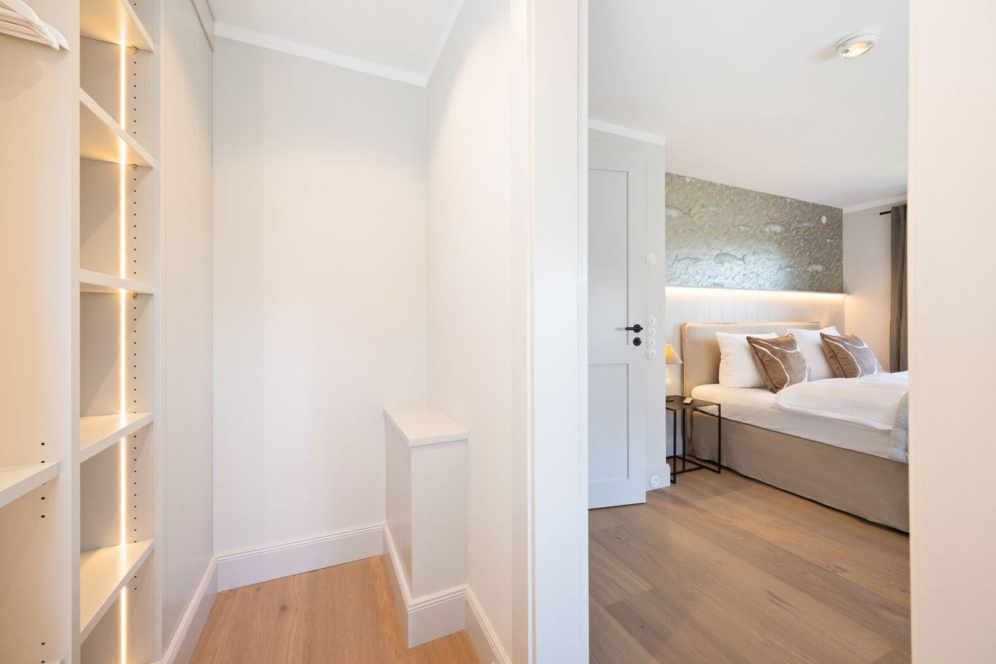 Die Doppelhaushälfte bietet ein stilvoll eingerichtetes Schlafzimmer: ausgestattet mit einem komfortablen Boxspringbett sowie einem eigenen Ankleideraum ausgestattet. So genießen Sie höchsten Komfort und erholsame Nächte.