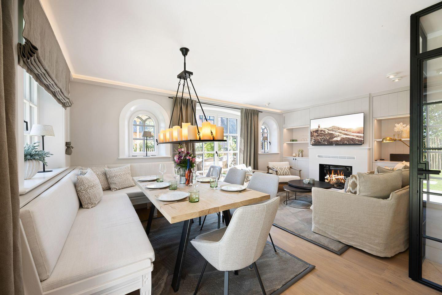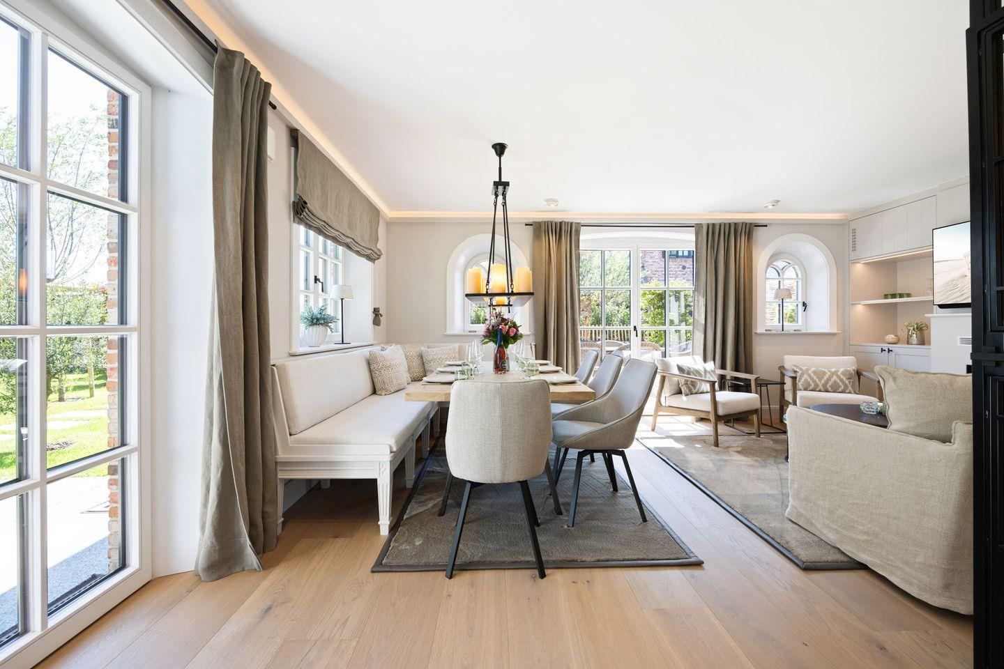 Der offene Wohn- und Essbereich bietet eine einladende Atmosphäre, in der Sie sich sofort wohlfühlen werden. Machen Sie es sich auf dem bequemen Sofa oder in den zwei Sesseln vor dem Kamin gemütlich, während Sie den Blick in den Garten genießen. Die zwei Freisitze in süd-östlicher Ausrichtung laden dazu ein, die frische Nordseeluft und den Sonnenschein zu genießen.