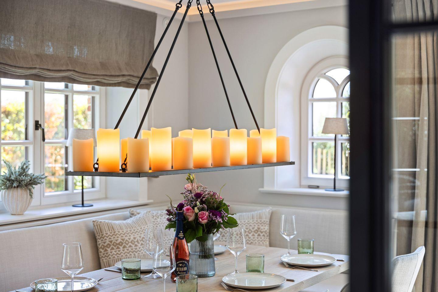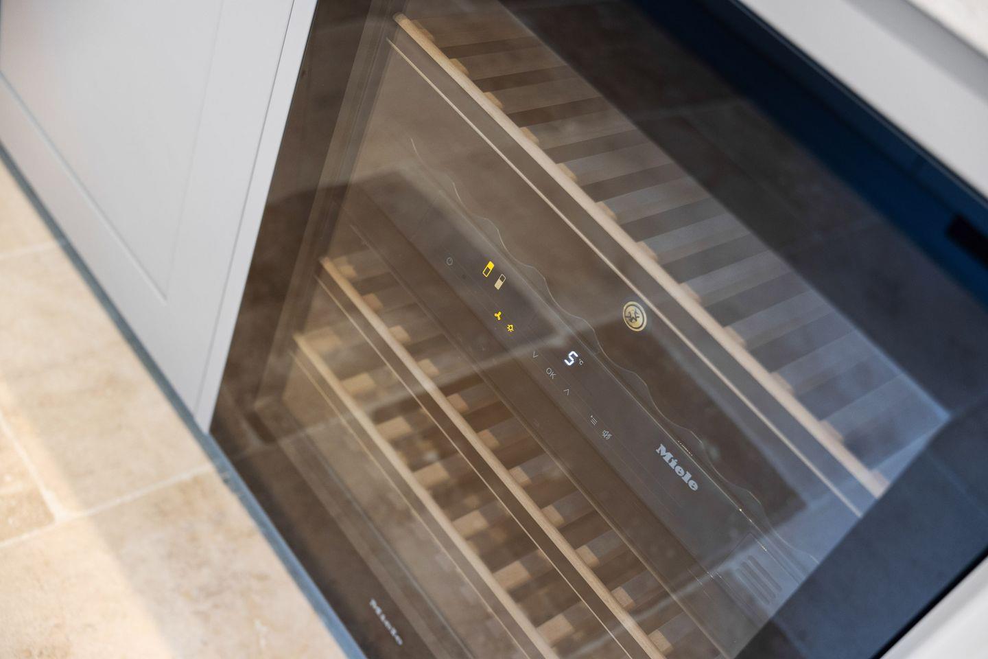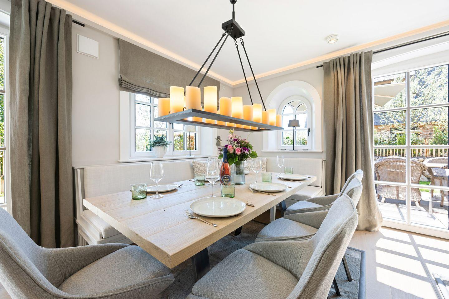 Die in den Wohnbereich integrierte, offene Küche ist mit hochwertigen Miele-Einbaugeräten und einem BORA Kochfeld ausgestattet. Weitere Highlights sind der Dampfgarer, der Weinkühlschrank und die Moccamaster Kaffeemaschine. Am großen Esstisch finden bis zu 6 Personen Platz – perfekt für gesellige Abende.