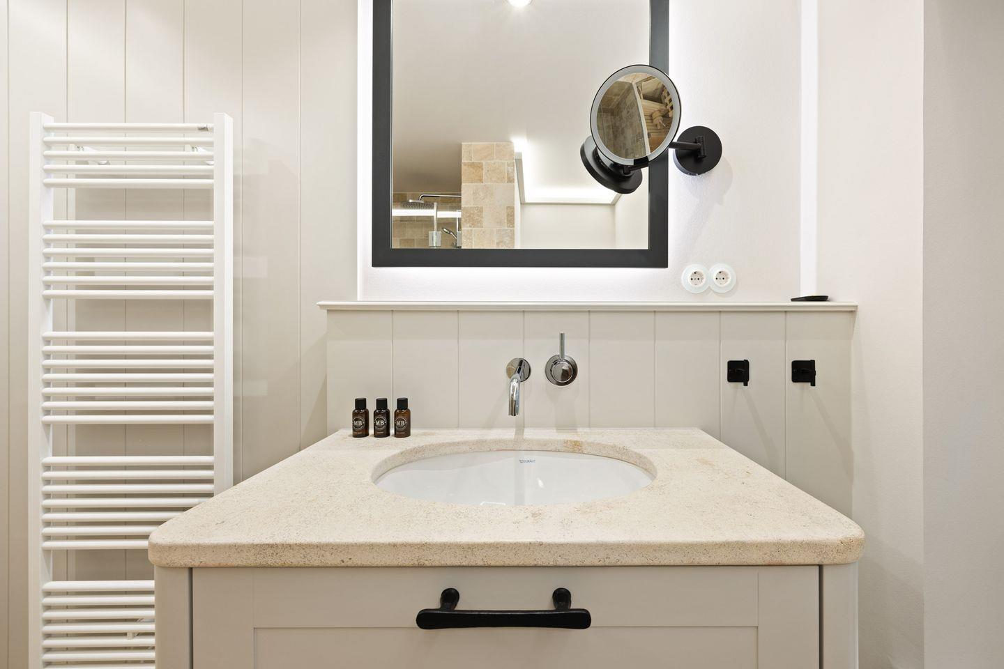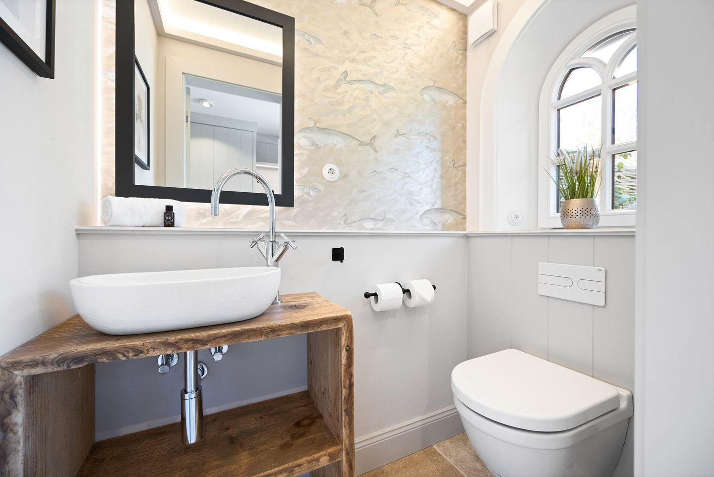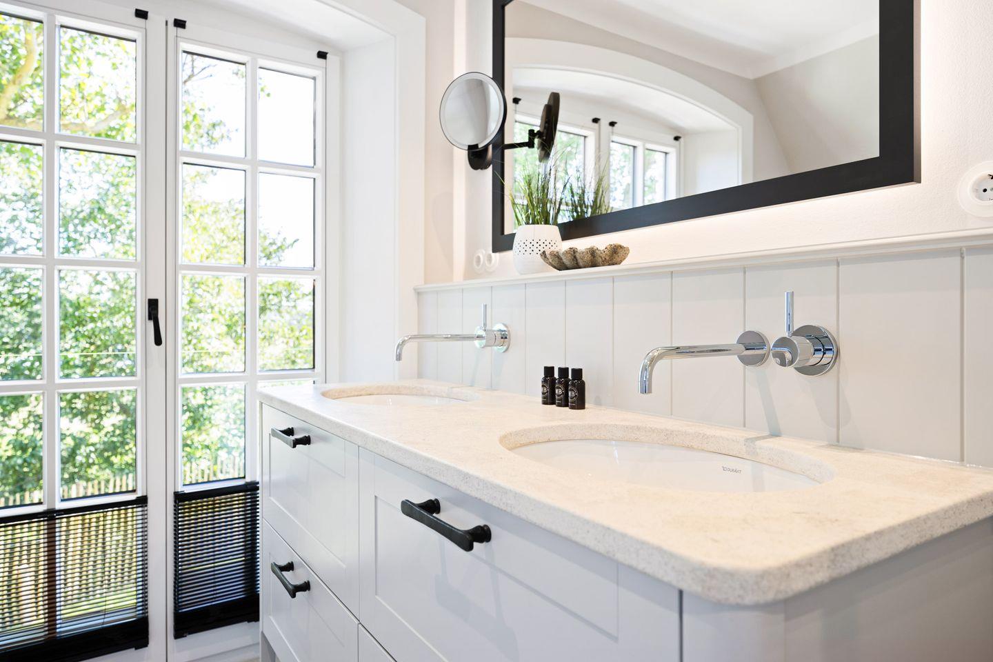 Die Doppelhaushälfte verfügt über zwei luxuriöse Badezimmer. Eines der Badezimmer ist mit einer bodengleichen Dusche, Tageslicht und einem Föhn ausgestattet. Das Wellnessbad besticht durch eine Sauna, eine freistehende Badewanne und eine bodengleiche Dusche – ideal für entspannte Stunden nach einem Tag auf der Insel. Ein separates Gäste-WC rundet das Angebot ab.