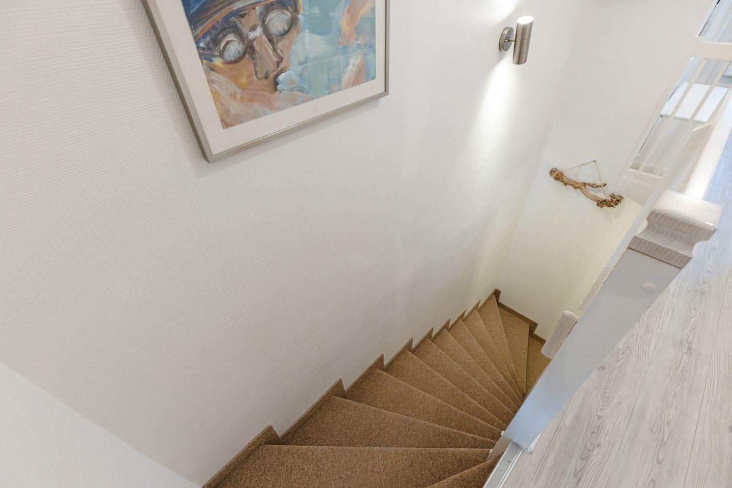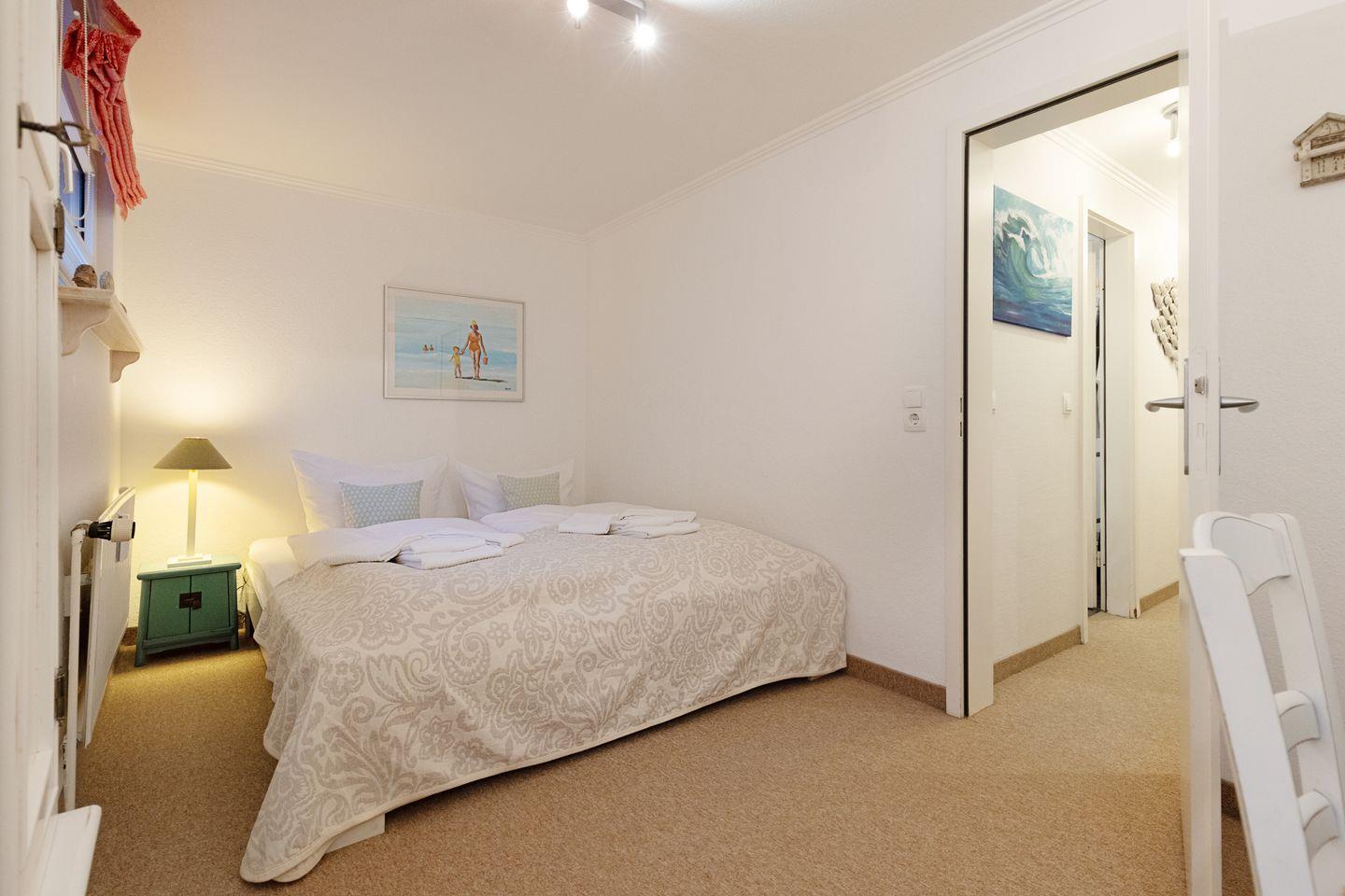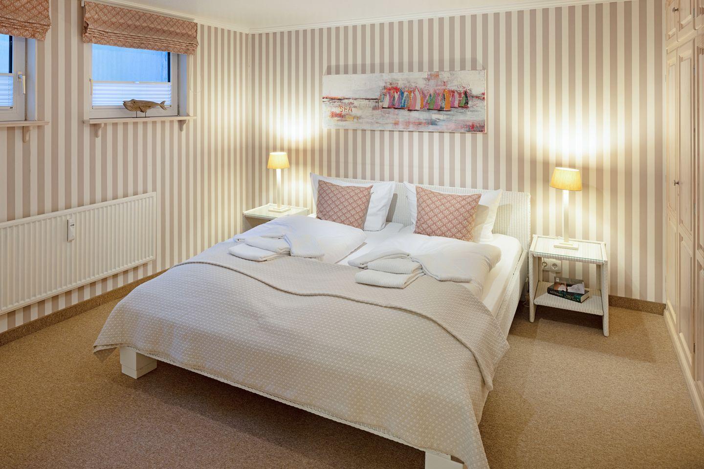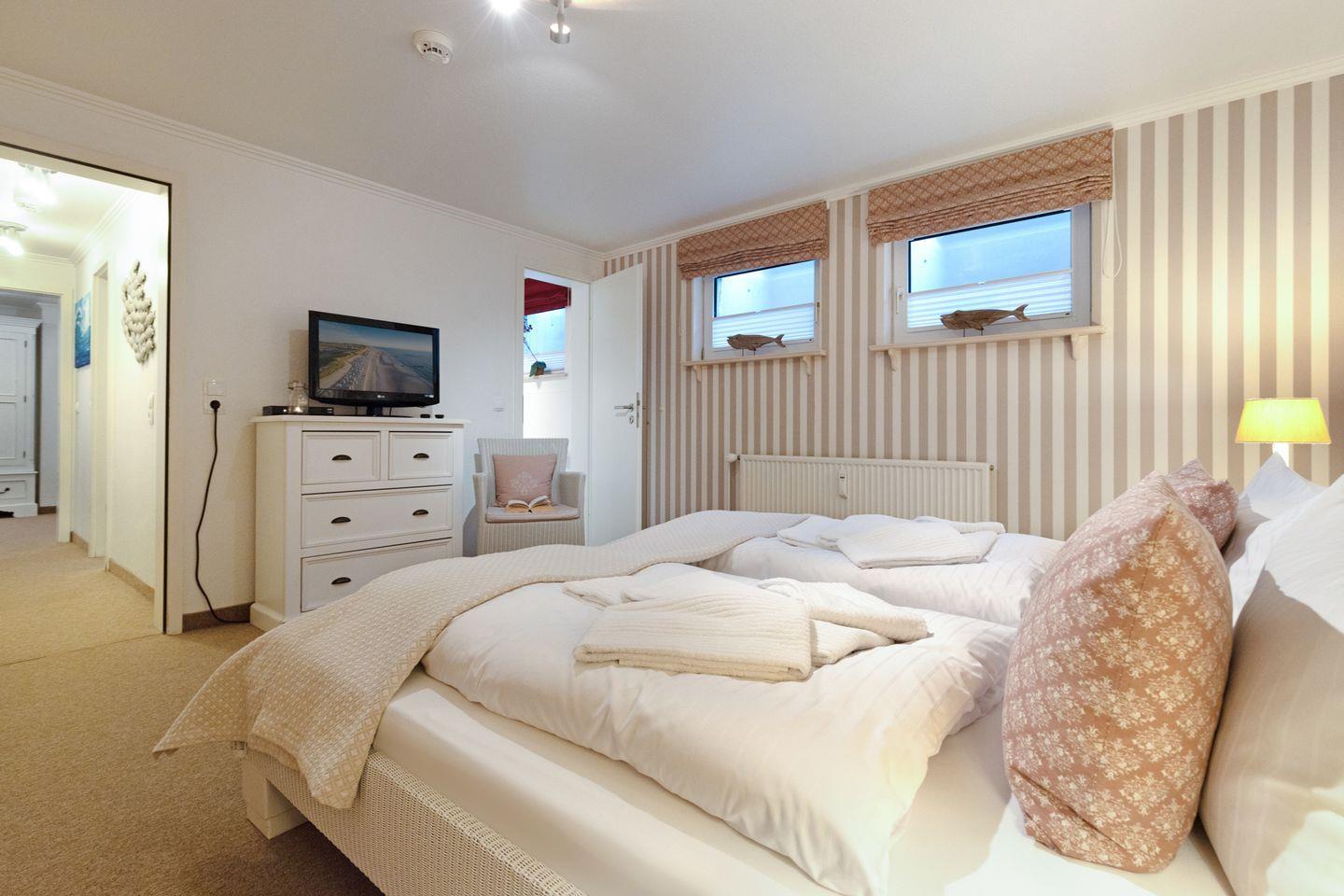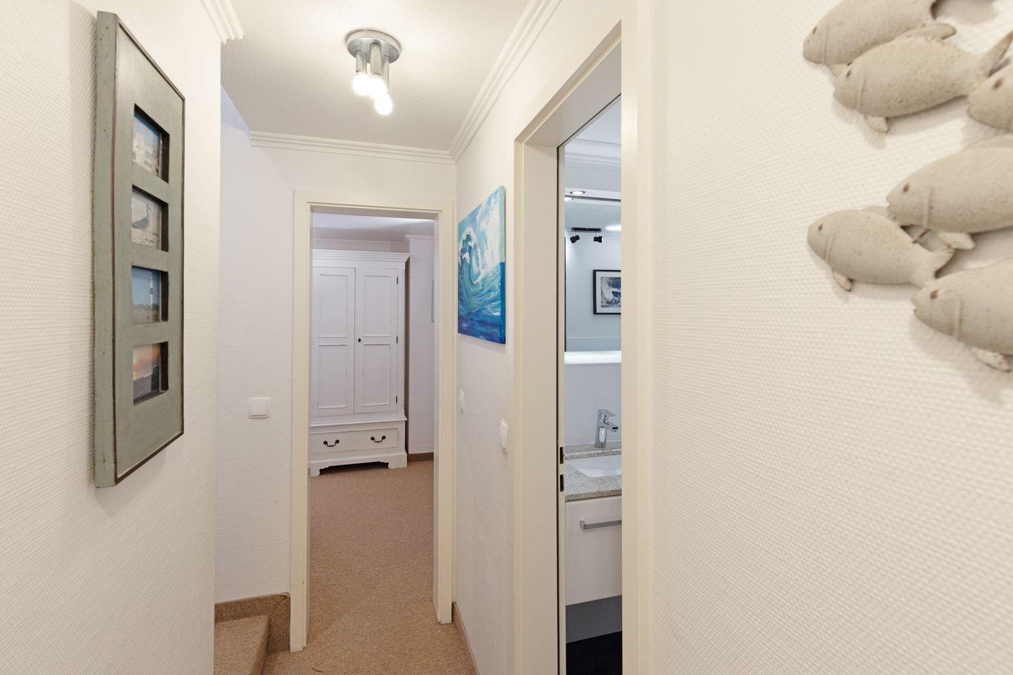 Auf der mit Gartenmöbeln ausgestatteten Terrasse finden Sie auch einen Strandkorb. Der hübsch gestaltete Flur führt nach unten, wo Sie zwei weitere Schlafzimmer finden, die jeweils mit Doppelbetten ausgestattet sind. Auch das Badezimmer und ein zusätzliches Gäste-WC finden Sie in dieser Ebene.