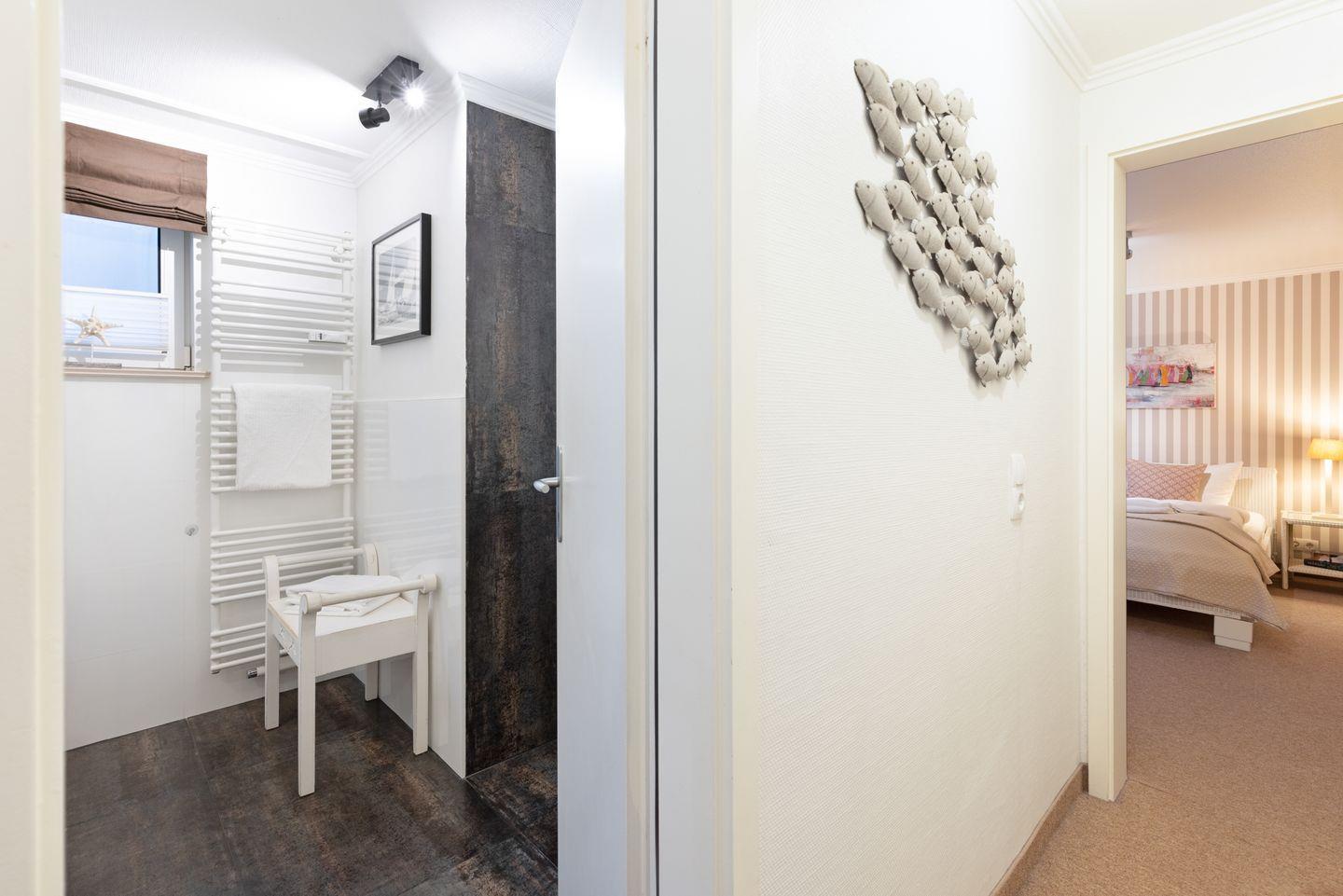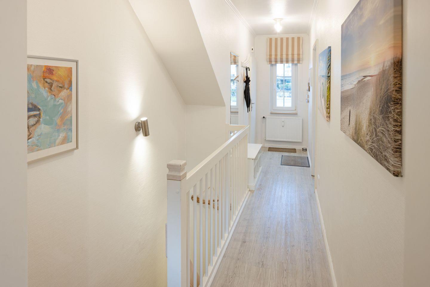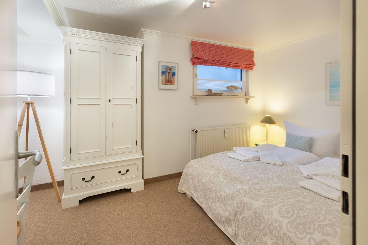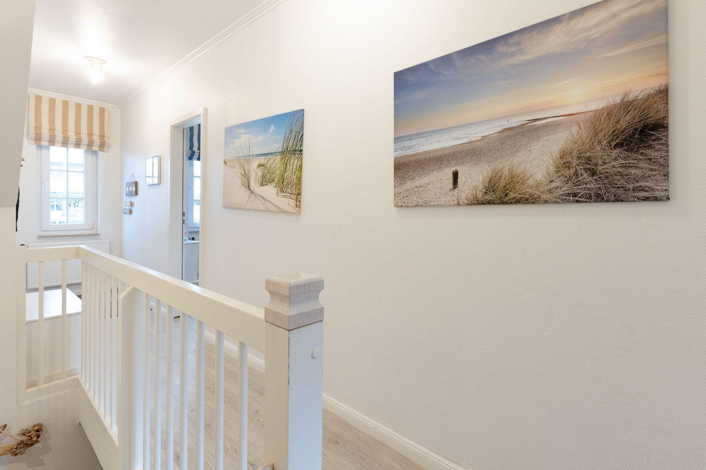 Auf der mit Gartenmöbeln ausgestatteten Terrasse finden Sie auch einen Strandkorb. Der hübsch gestaltete Flur führt nach unten, wo Sie zwei weitere Schlafzimmer finden, die jeweils mit Doppelbetten ausgestattet sind. Auch das Badezimmer und ein zusätzliches Gäste-WC finden Sie in dieser Ebene.