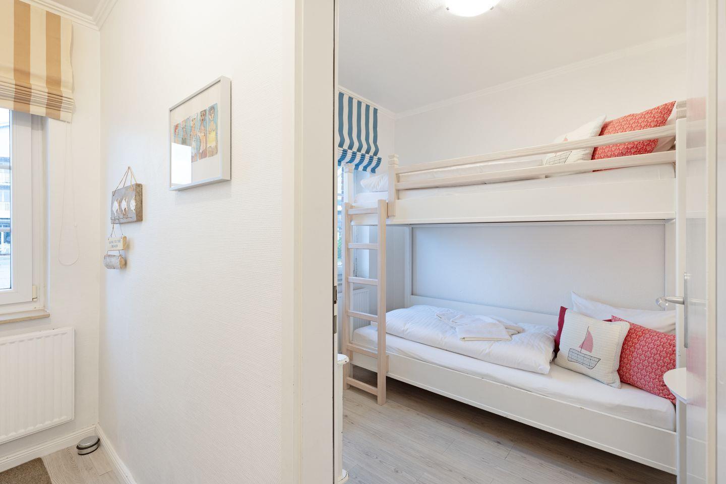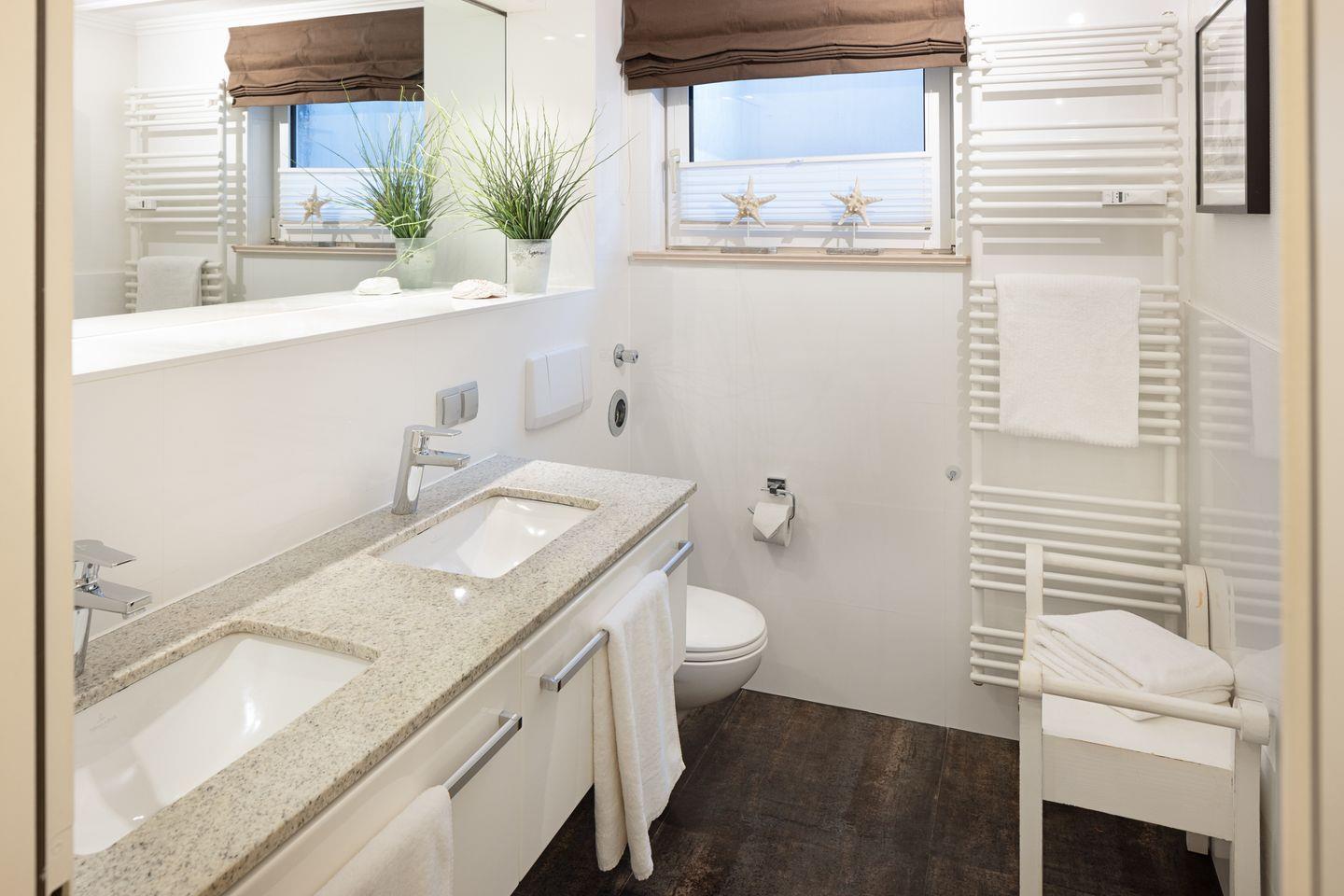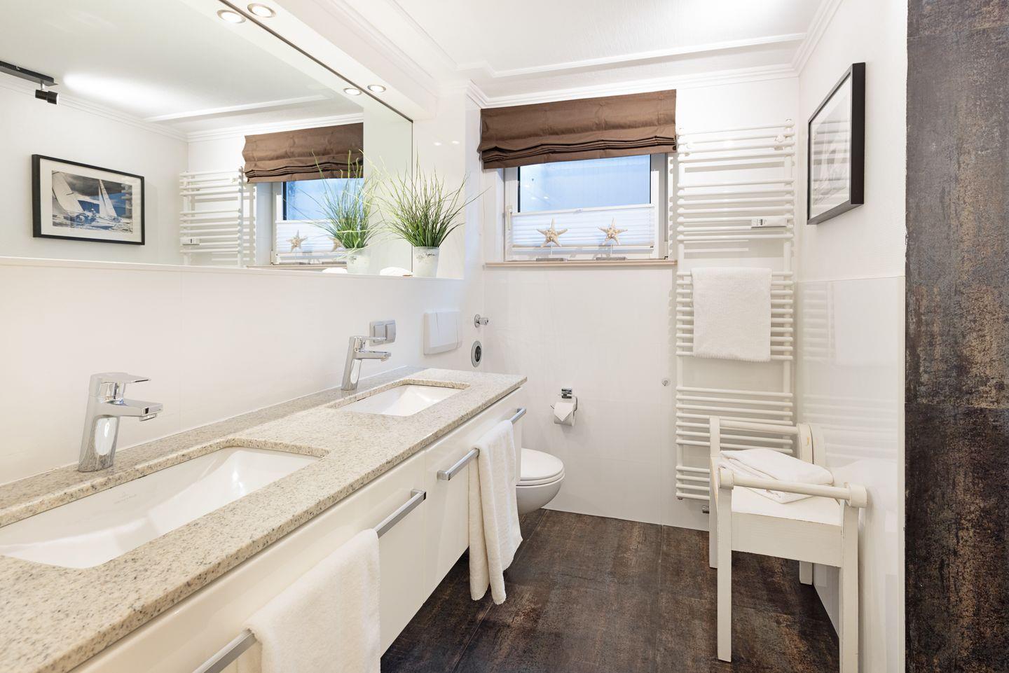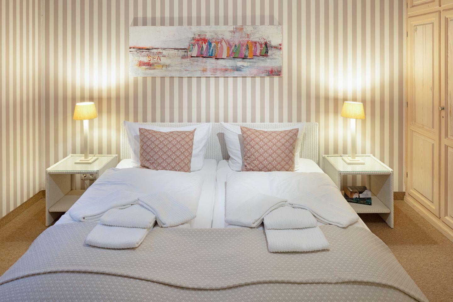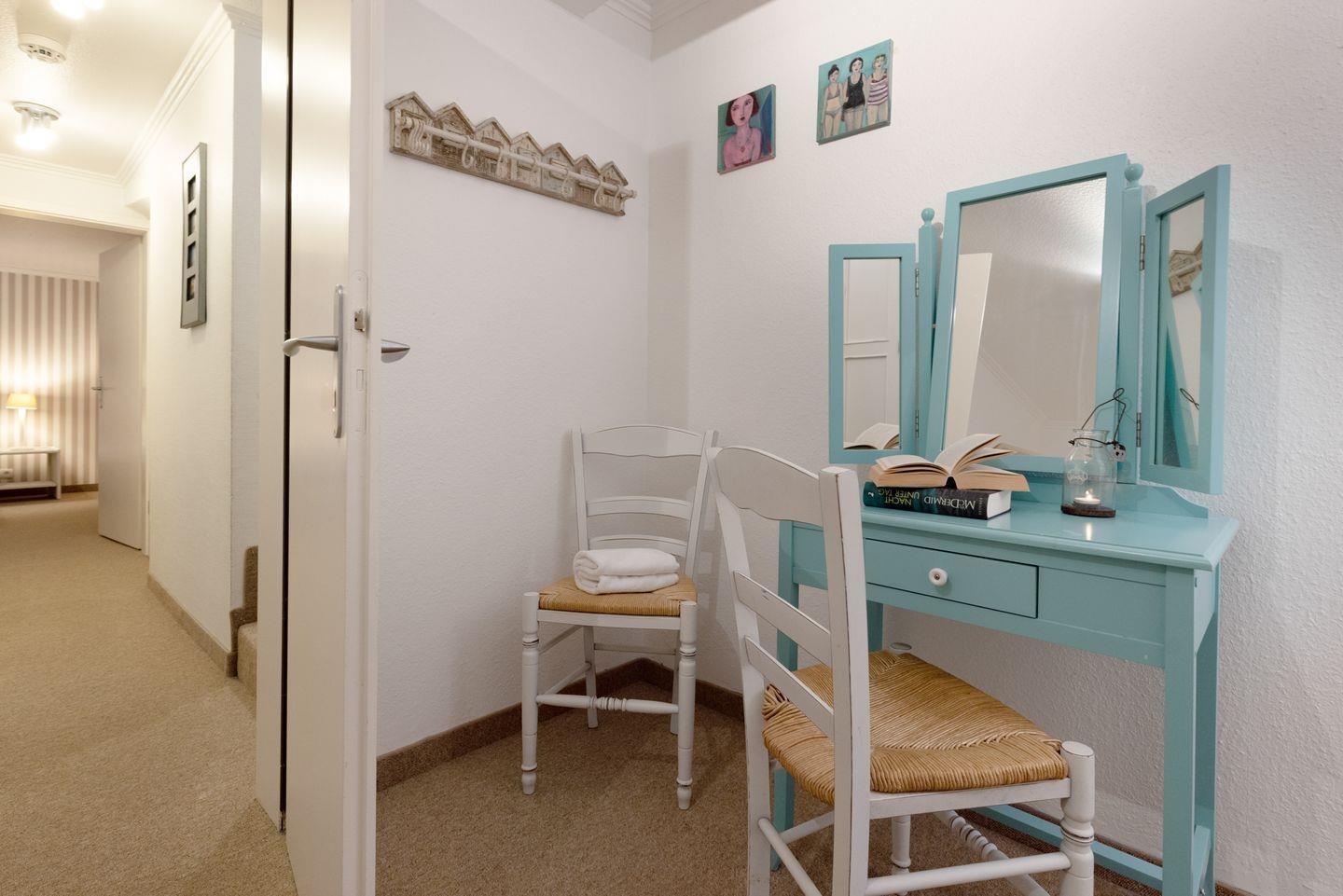 Auf der mit Gartenmöbeln ausgestatteten Terrasse finden Sie auch einen Strandkorb. Der hübsch gestaltete Flur führt nach unten, wo Sie zwei weitere Schlafzimmer finden, die jeweils mit Doppelbetten ausgestattet sind. Auch das Badezimmer und ein zusätzliches Gäste-WC finden Sie in dieser Ebene.