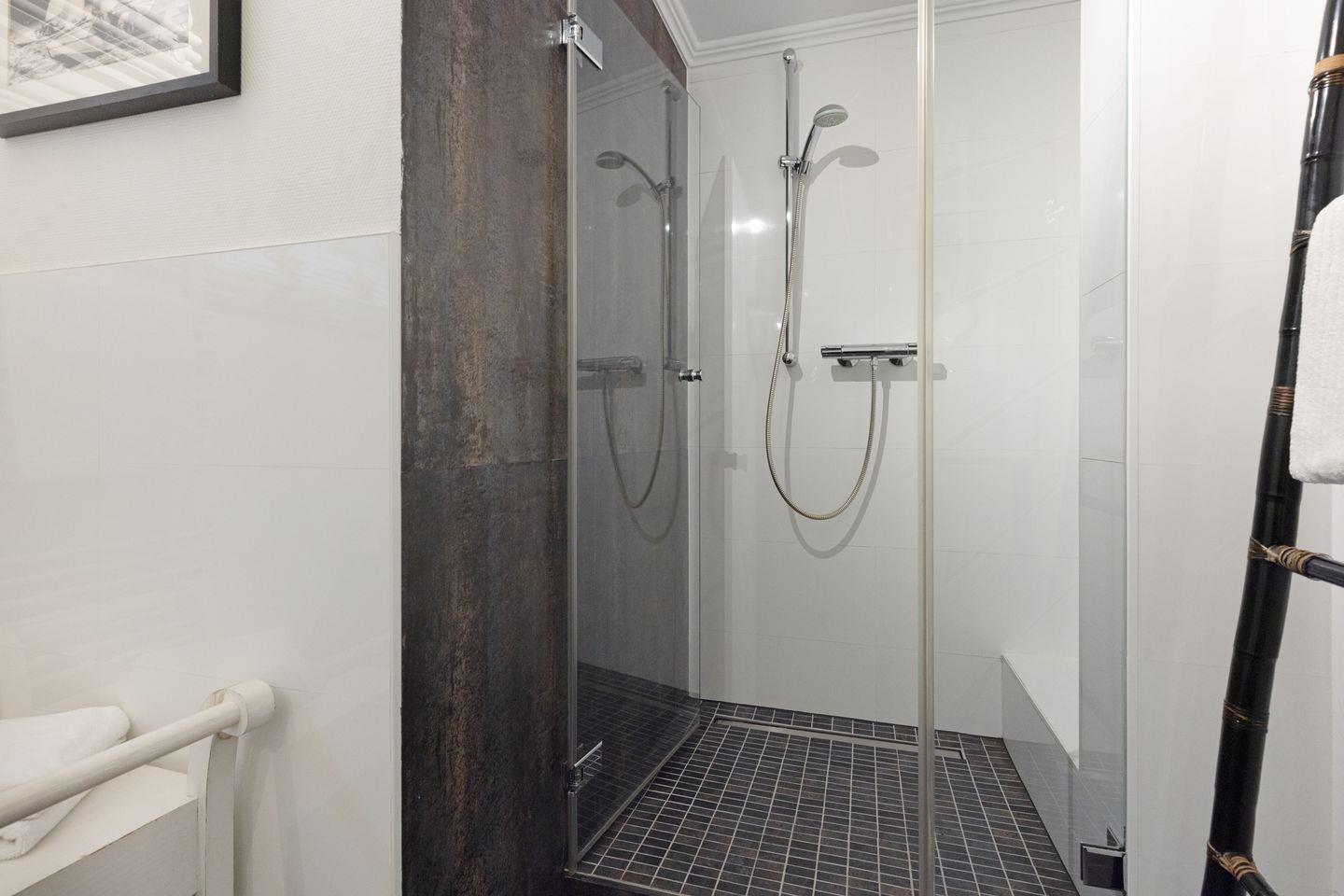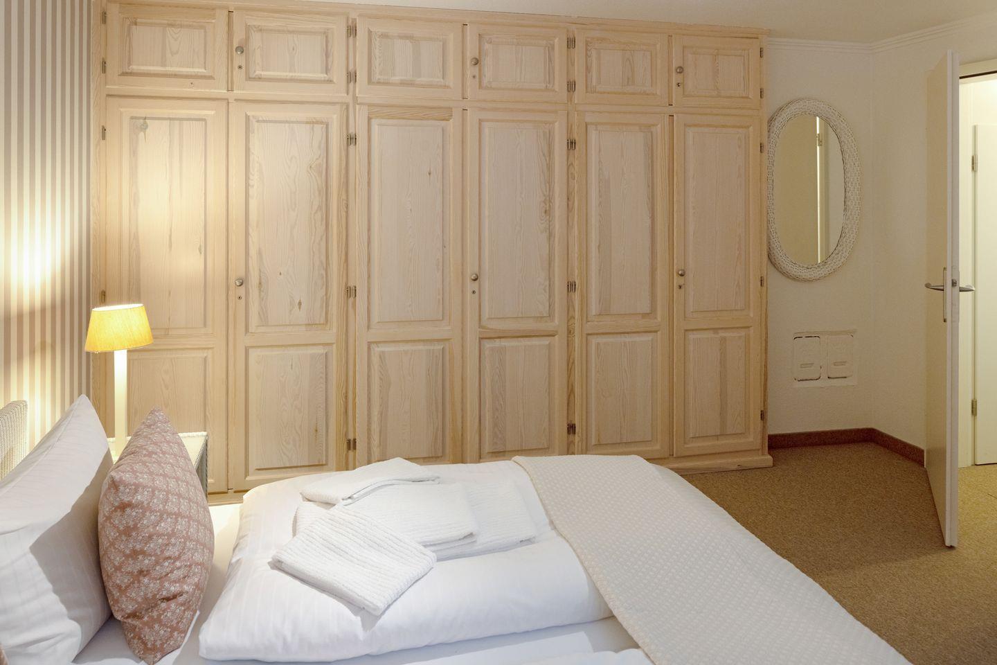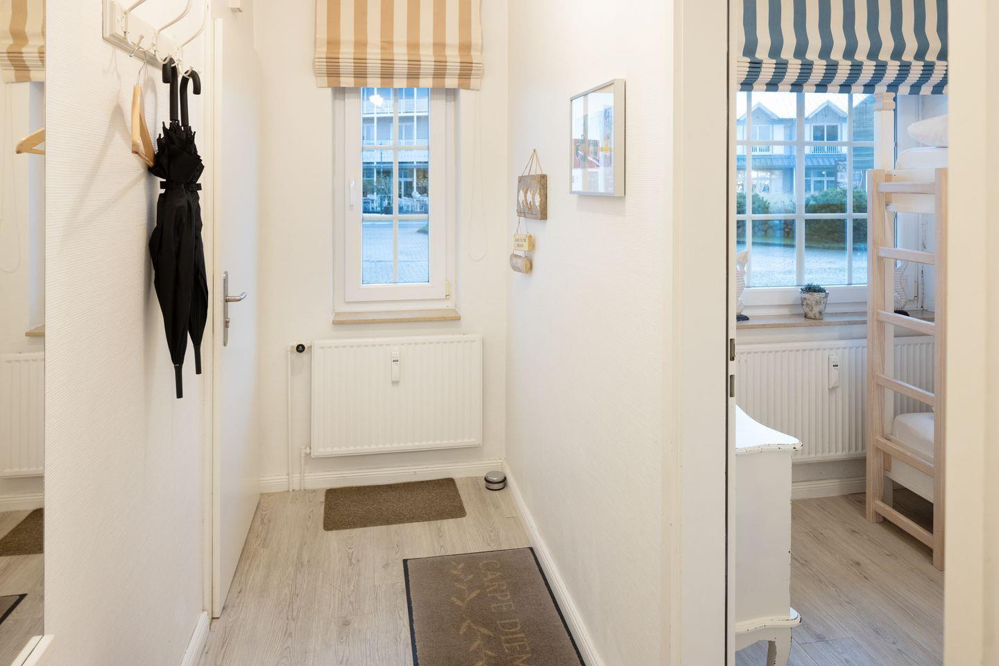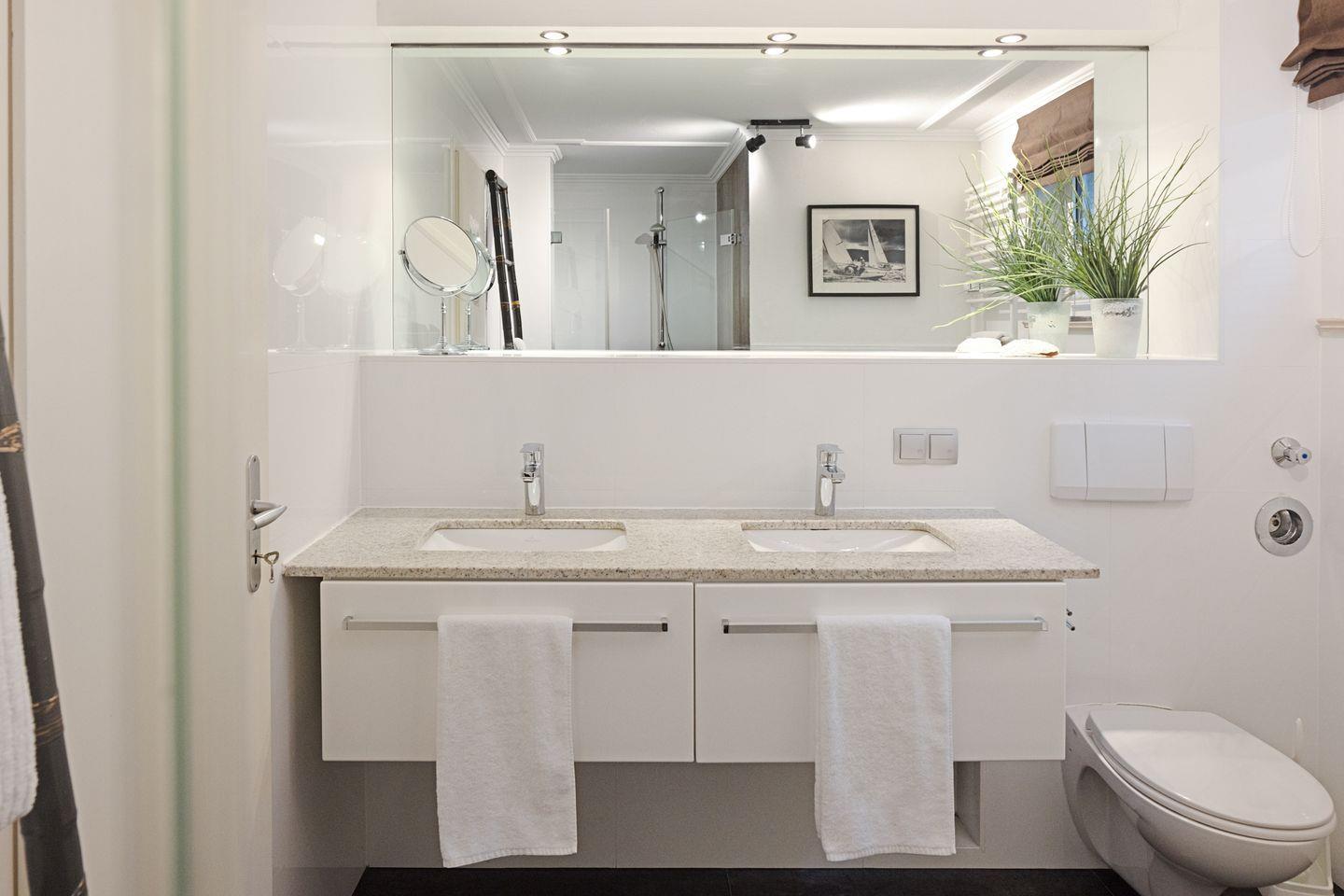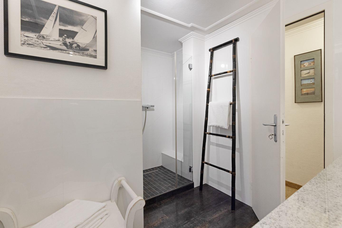 Auf der mit Gartenmöbeln ausgestatteten Terrasse finden Sie auch einen Strandkorb. Der hübsch gestaltete Flur führt nach unten, wo Sie zwei weitere Schlafzimmer finden, die jeweils mit Doppelbetten ausgestattet sind. Auch das Badezimmer und ein zusätzliches Gäste-WC finden Sie in dieser Ebene.