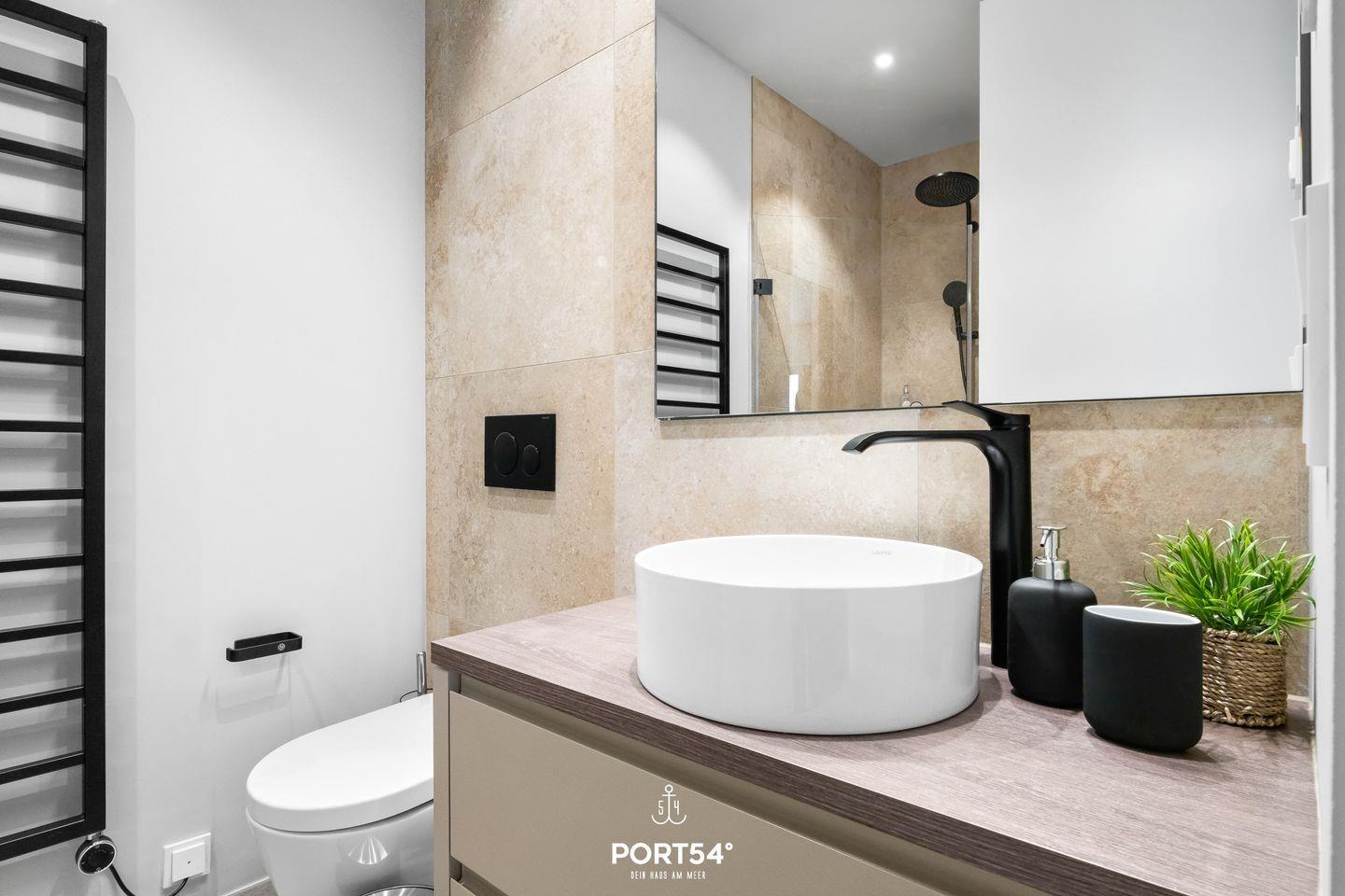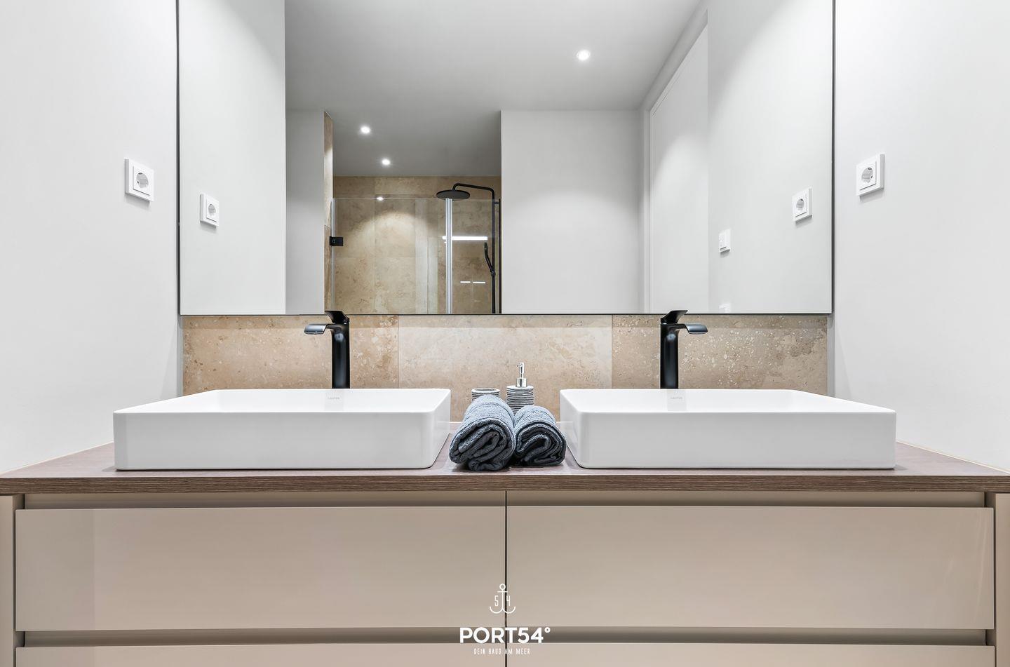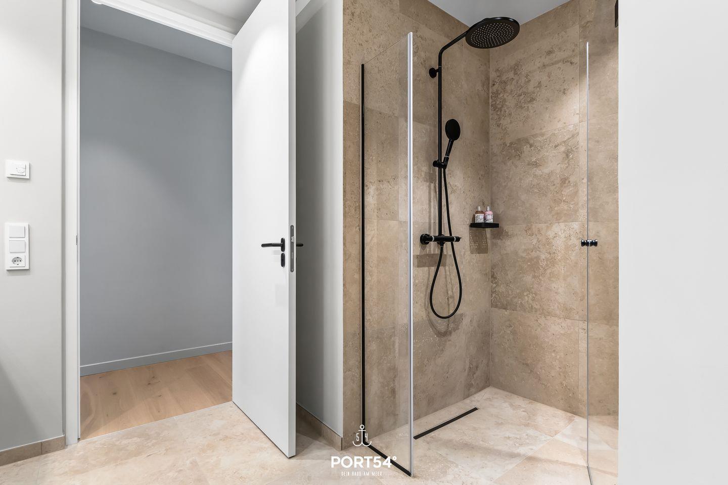 Im Badbereich erwarten Sie zwei moderne Badezimmer mit bodengleichen Duschen und einem ansprechenden Design, das sowohl Funktionalität als auch Stil vereint. Eine in die Dusche integrierte Infrarotsauna rundet das Wellnessangebot ab.