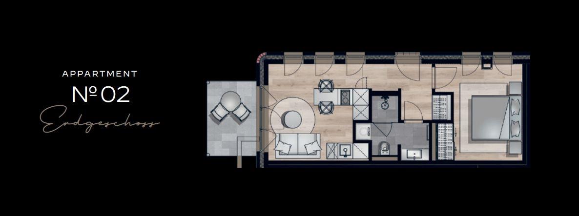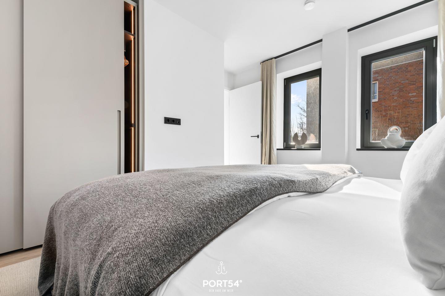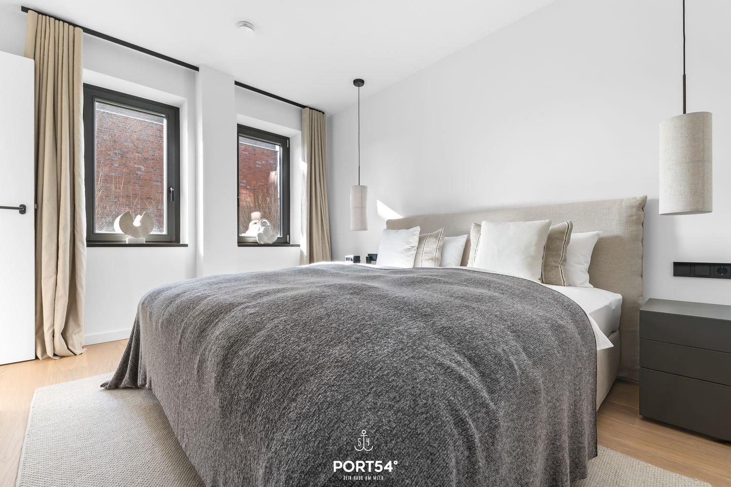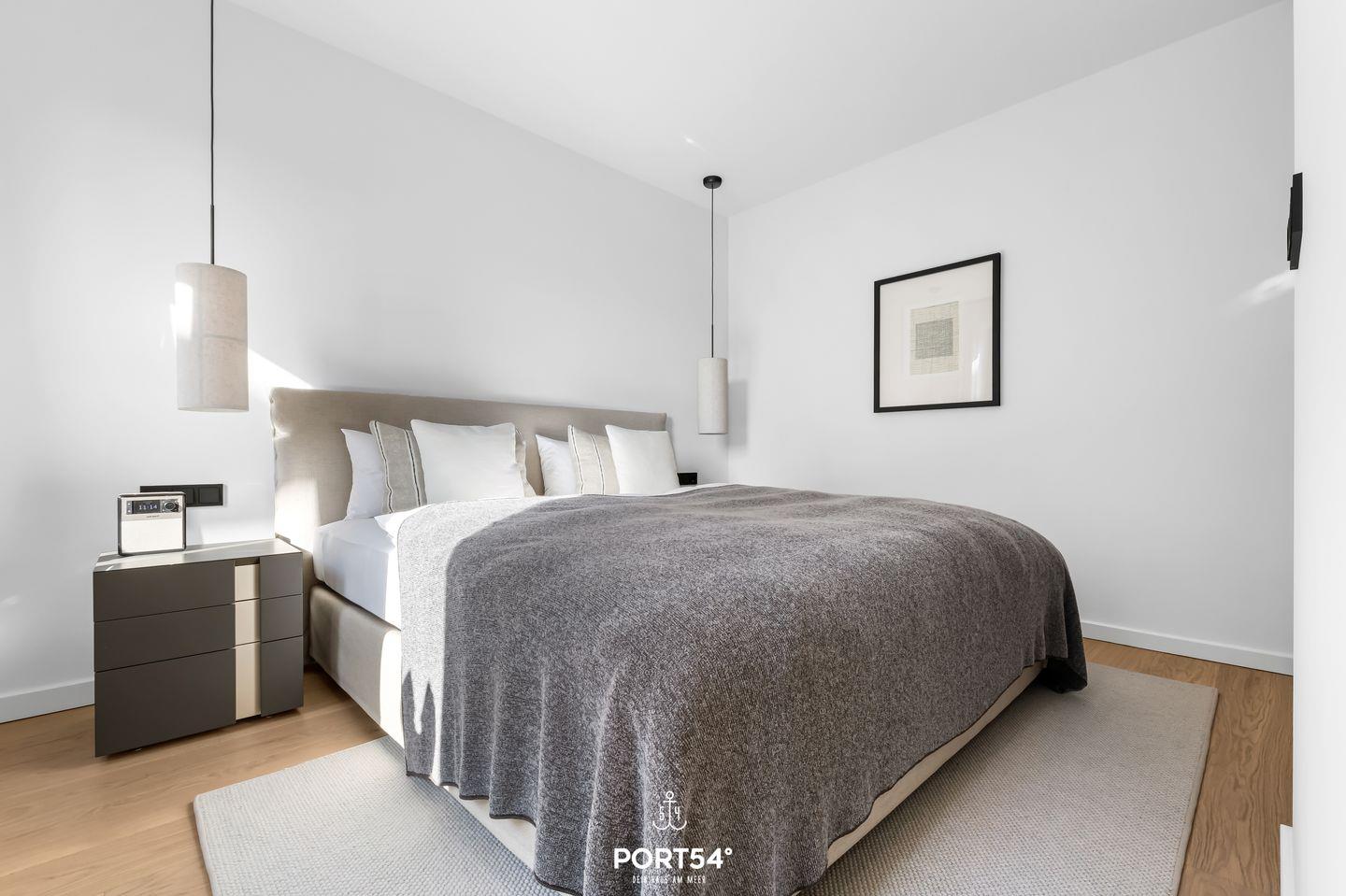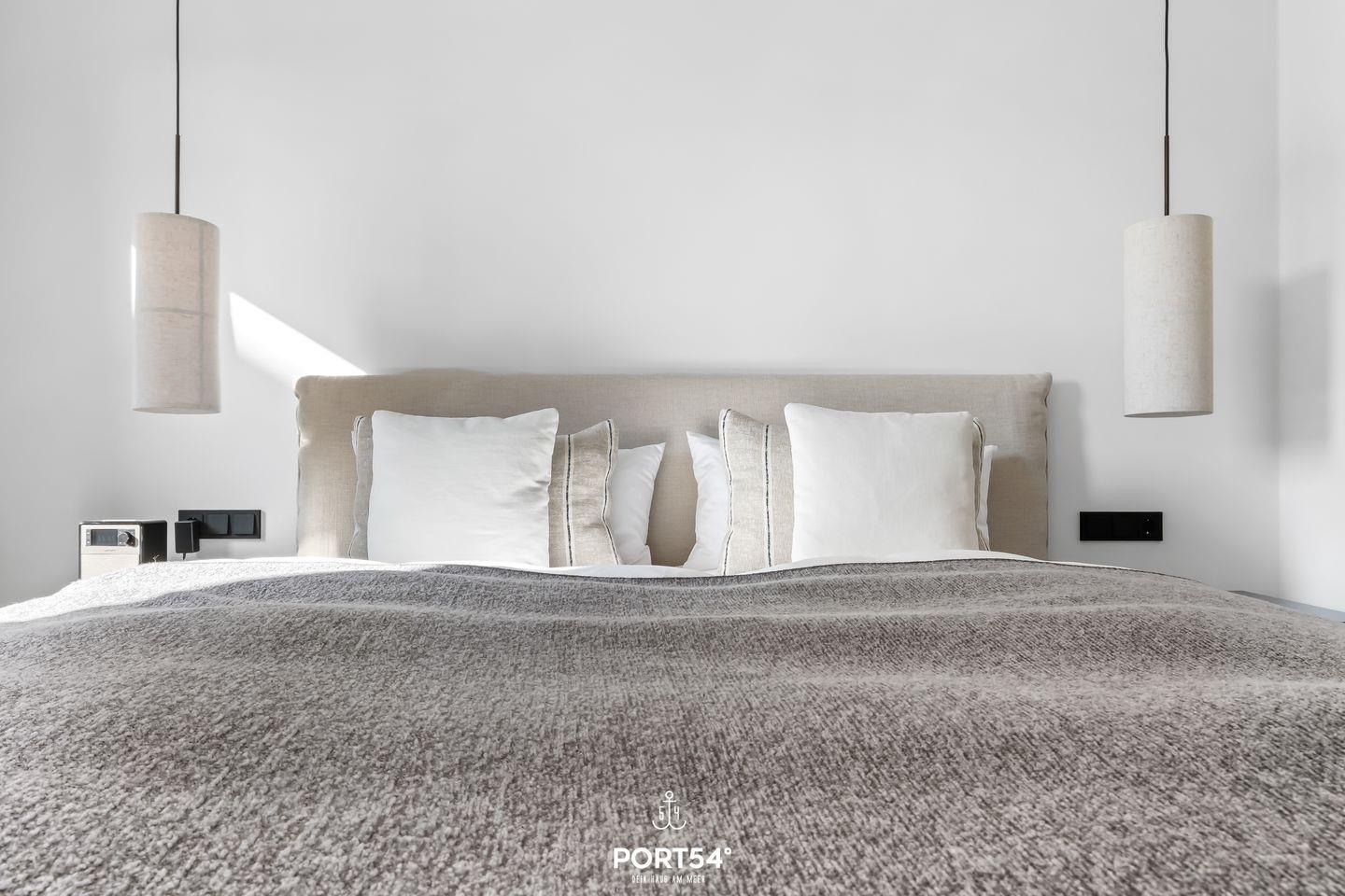 Das Schlafzimmer verfügt über ein komfortables, 180x200 cm großes Doppelboxspringbett der Marke Schramm sowie Verdunkelungsmöglichkeiten für eine erholsame Nachtruhe. Ein helles Badezimmer mit bodengleicher Dusche, WC und Haartrockner sorgt für frische Momente.