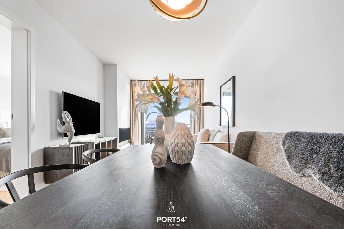 Die Ferienwohnung befindet sich im zweiten Stock und ist bequem über einen Aufzug erreichbar. Ein großzügiger Wohnraum mit einer offenen Küche von SieMatic lädt dazu ein, kulinarische Köstlichkeiten zuzubereiten und gesellige Abende zu verbringen. Die hochmodernen Küchengeräte, einschließlich einer Spülmaschine, Elektrobackofen und einem Quooker, damit lässt sich problemlos heißes Wasser sowie Sprudelwasser erzeugen, lassen keine Wünsche offen und ermöglichen es dir, dich wie zu Hause zu fühlen. Der Esstisch bietet genügend Platz, um gemeinsam zu speisen und schöne Erinnerungen zu schaffen.