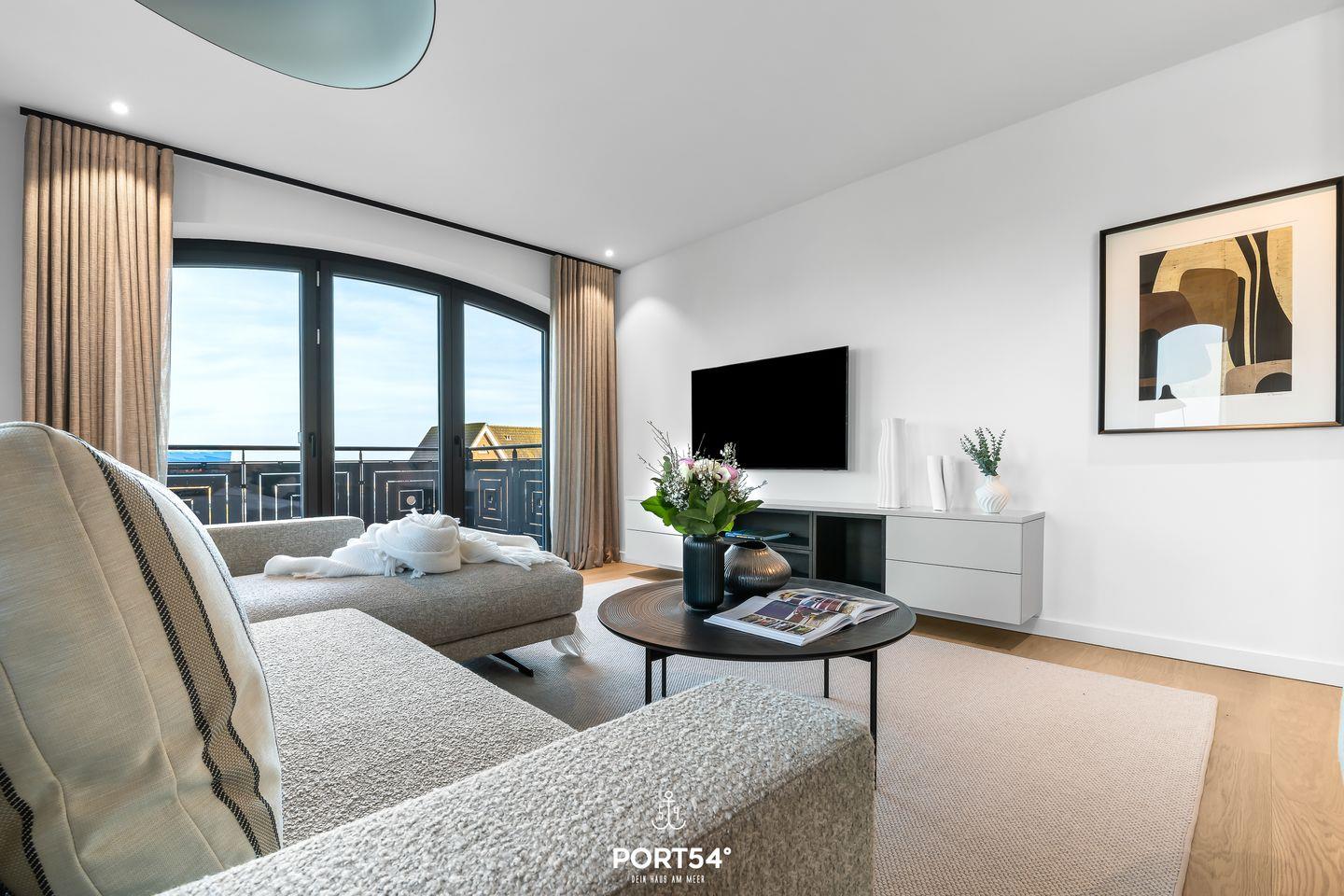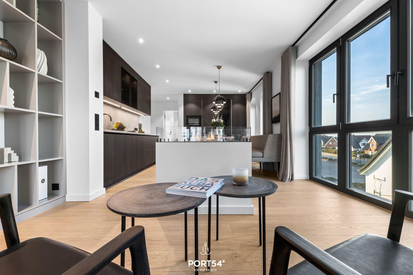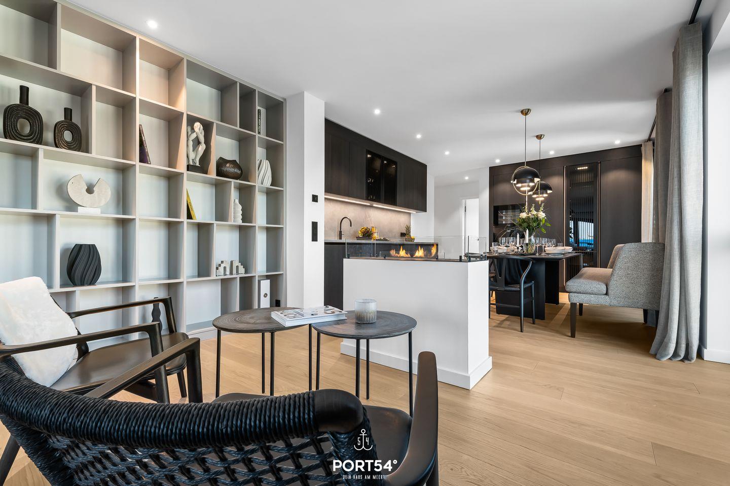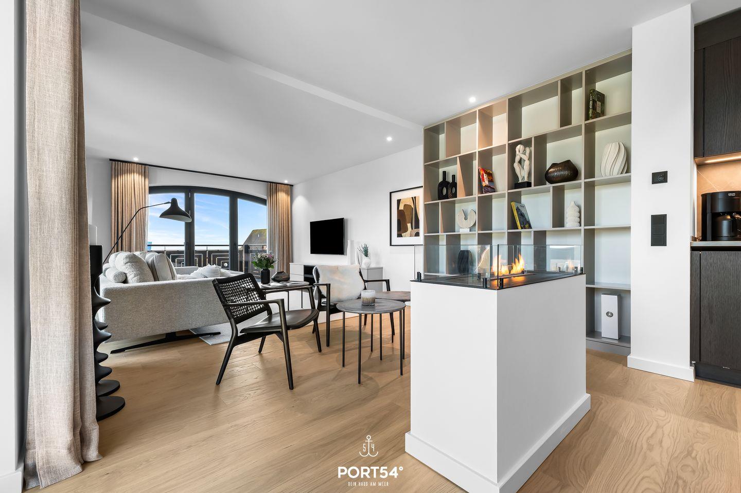 Der Wohnbereich ist ideal, um nach einem erlebnisreichen Tag zu entspannen. Ein gemütliches Sofa, ausgestattet mit einem offenen Ethanol-Kamin, lädt dazu ein, es sich mit einem guten Buch oder einem Film gemütlich zu machen. Von hier aus hast du direkten Zugang zu deinem eigenen Balkon, wo du den Blick auf die umliegende Landschaft oder einen romantischen Sonnenuntergang genießen kannst. Gartenmöbel stehen dir zur Verfügung, sodass du im Freien verweilen und die frische Nordseeluft genießen kannst.