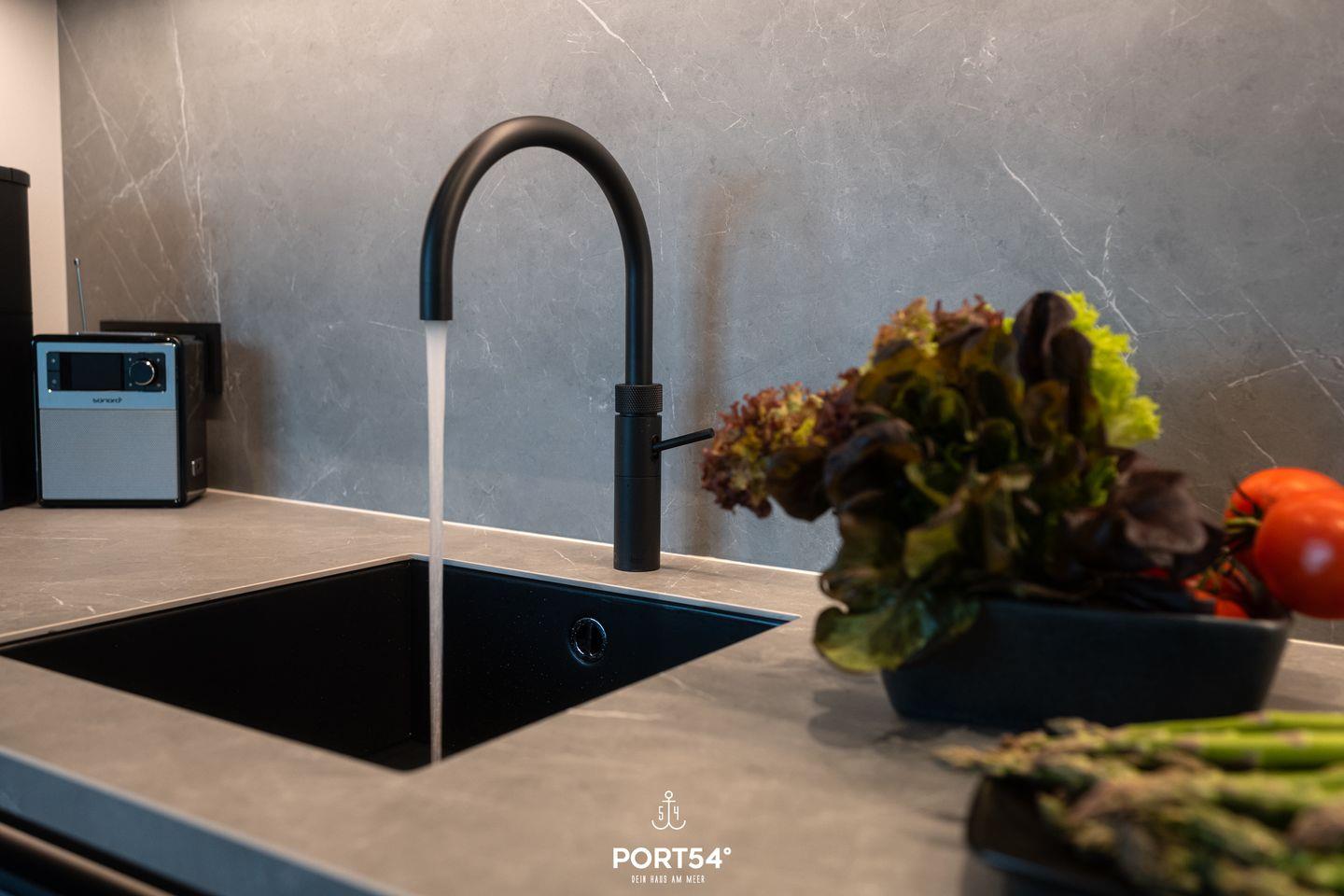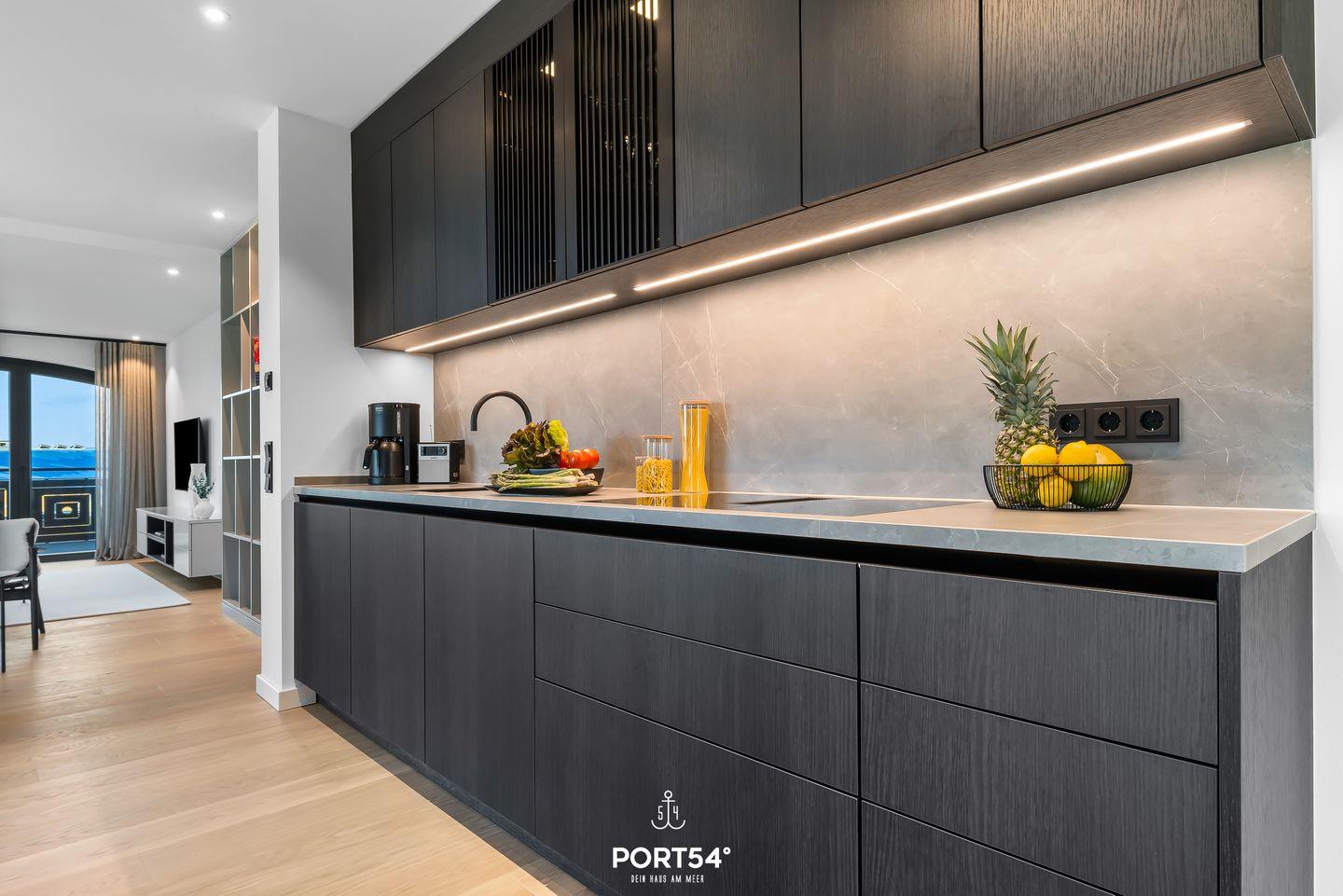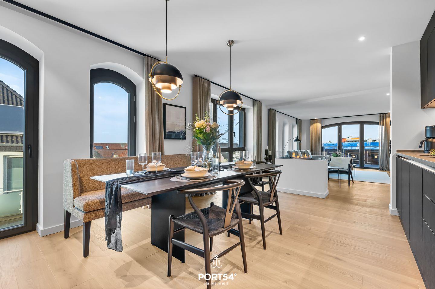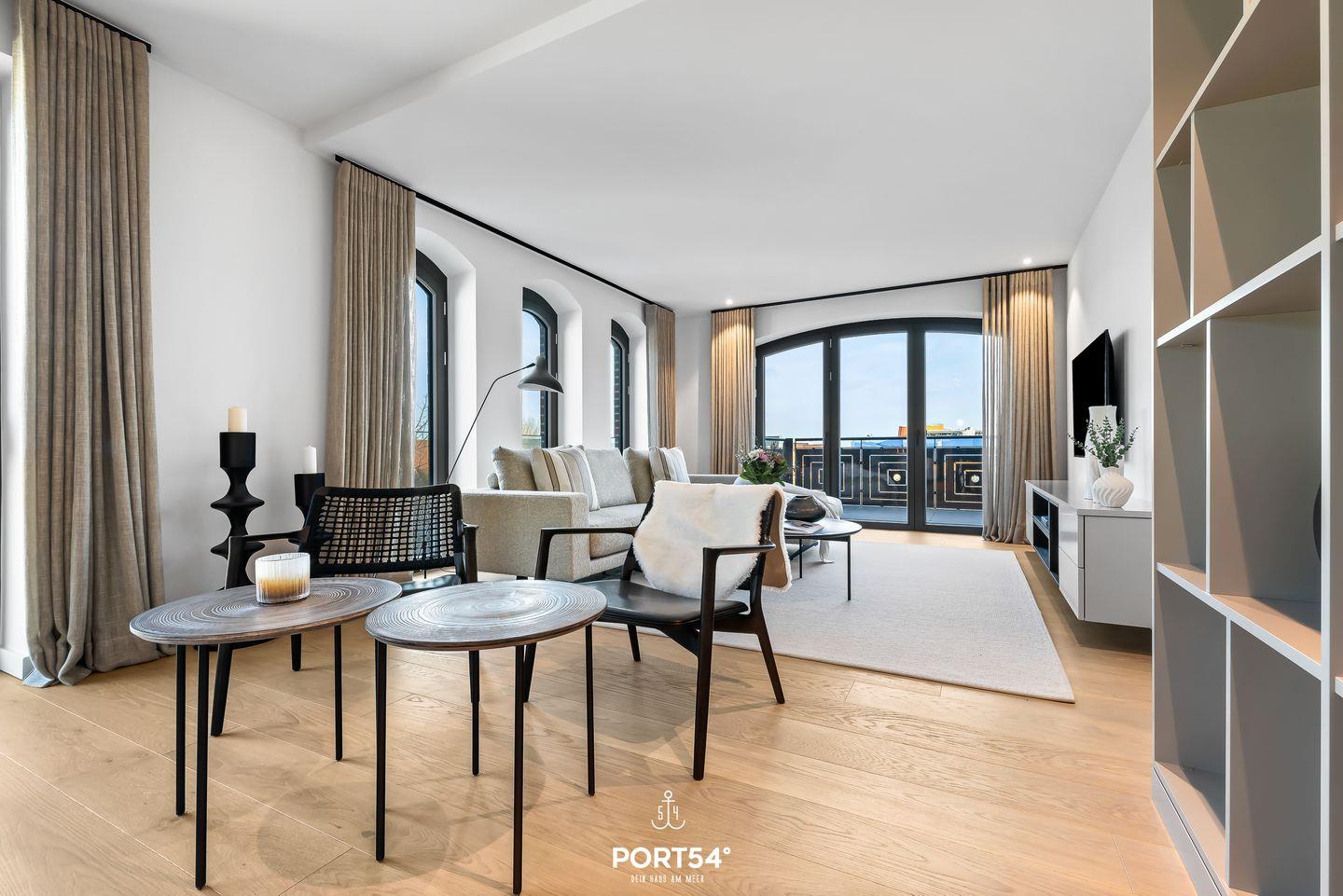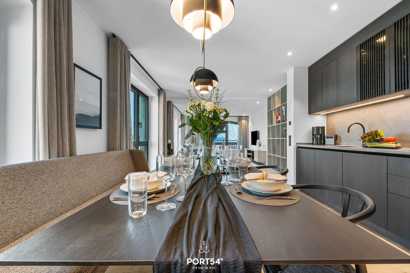 Der Wohnbereich ist ideal, um nach einem erlebnisreichen Tag zu entspannen. Ein gemütliches Sofa, ausgestattet mit einem offenen Ethanol-Kamin, lädt dazu ein, es sich mit einem guten Buch oder einem Film gemütlich zu machen. Von hier aus hast du direkten Zugang zu deinem eigenen Balkon, wo du den Blick auf die umliegende Landschaft oder einen romantischen Sonnenuntergang genießen kannst. Gartenmöbel stehen dir zur Verfügung, sodass du im Freien verweilen und die frische Nordseeluft genießen kannst.