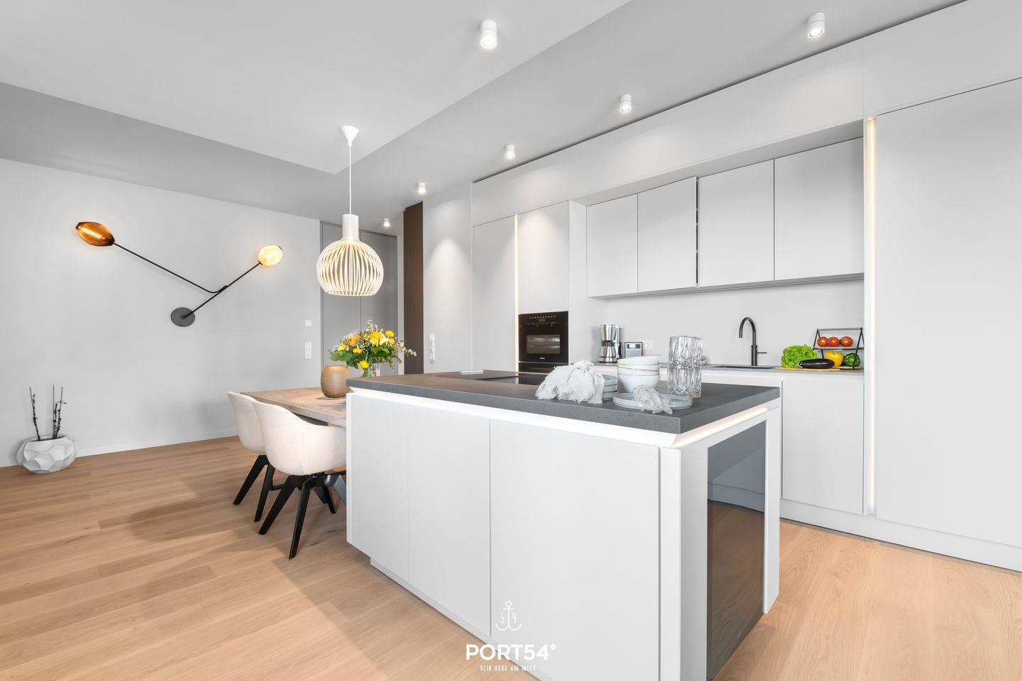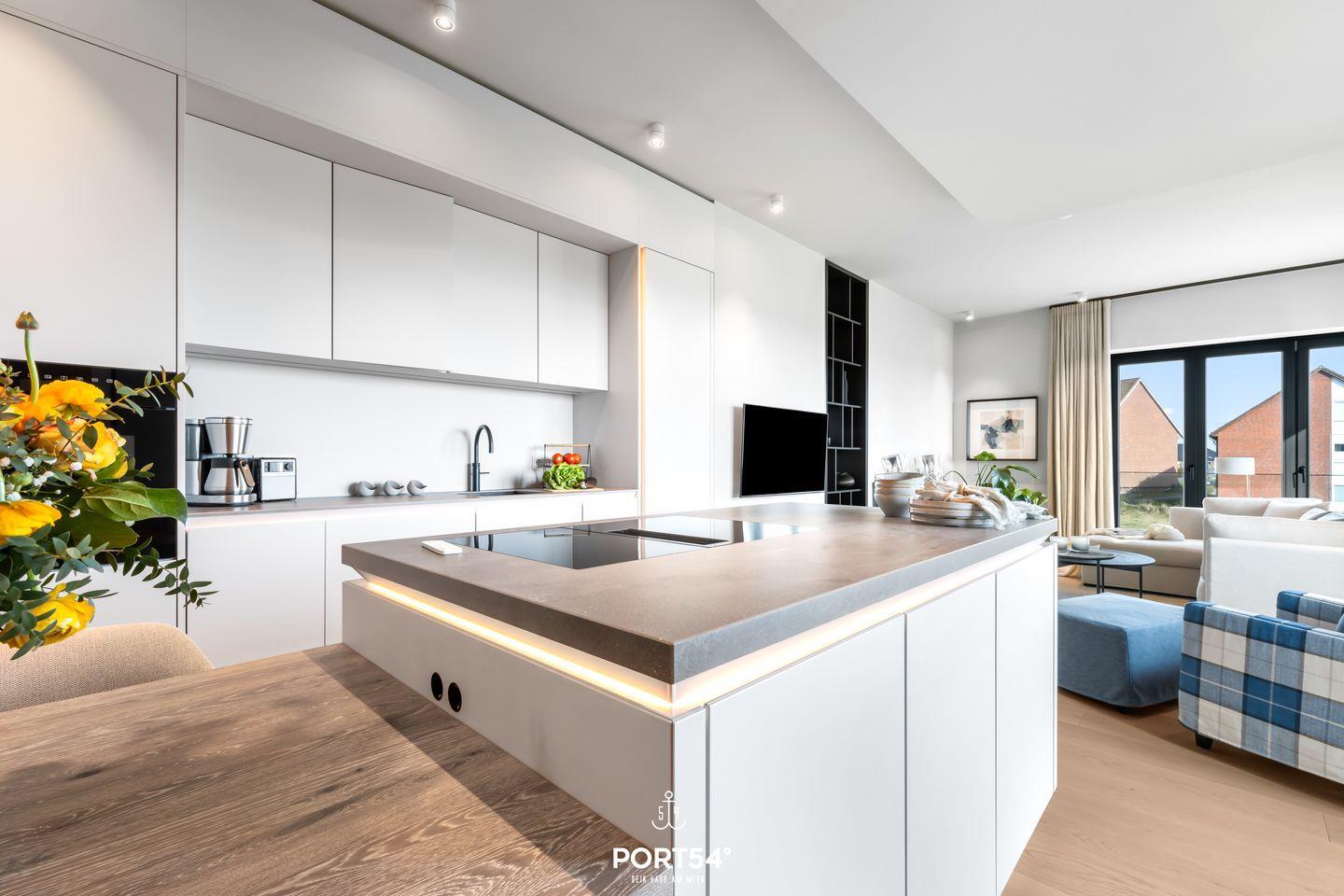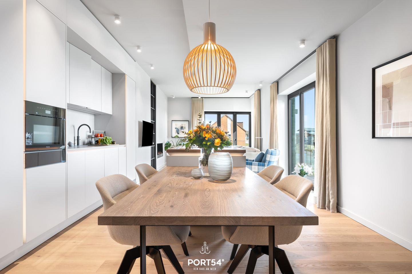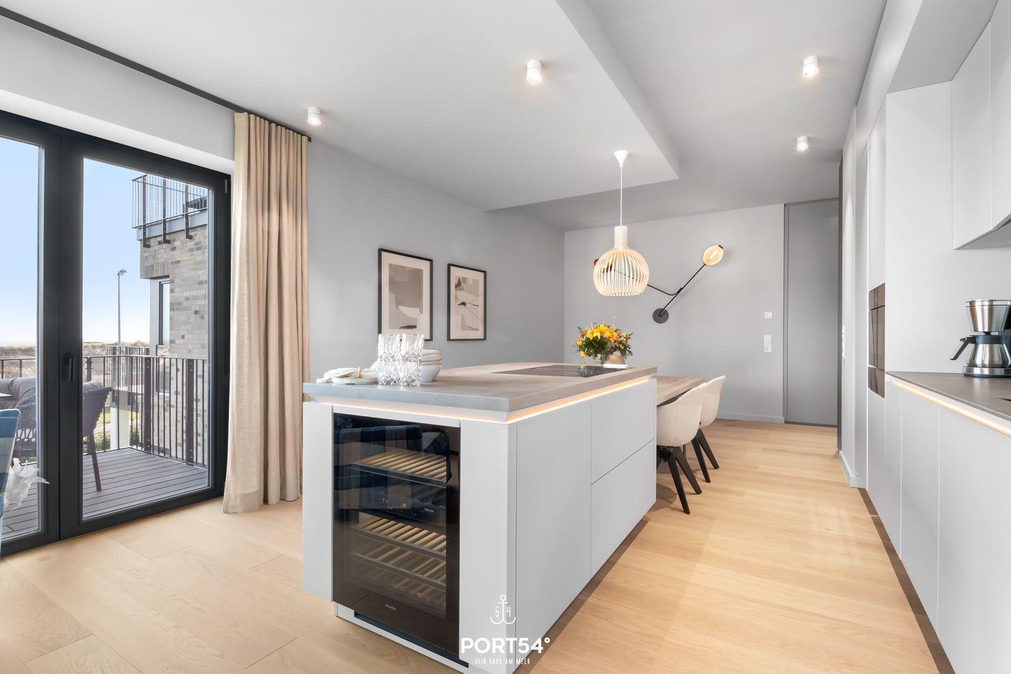Ein offener Wohnbereich mit großzügiger Sofaecke, Ethanol Kamin und Esstisch lädt zum Verweilen ein und bietet einen perfekten Ort für gesellige Abende. Die voll ausgestattete offene Küche von SieMatic punktet mit modernen Geräten wie einem Induktionsherd, Backofen, Kühlschrank, Spülmaschine und einem Weinkühlschrank. Hier können Sie kreative Gerichte zubereiten oder einfach das Frühstück auf dem Balkon genießen, während Sie die frische Meeresbrise einatmen. Außerdem finden Sie in der Küche einen Quooker, damit lässt sich problemlos heißes Wasser, sowie Sprudelwasser erzeugen.